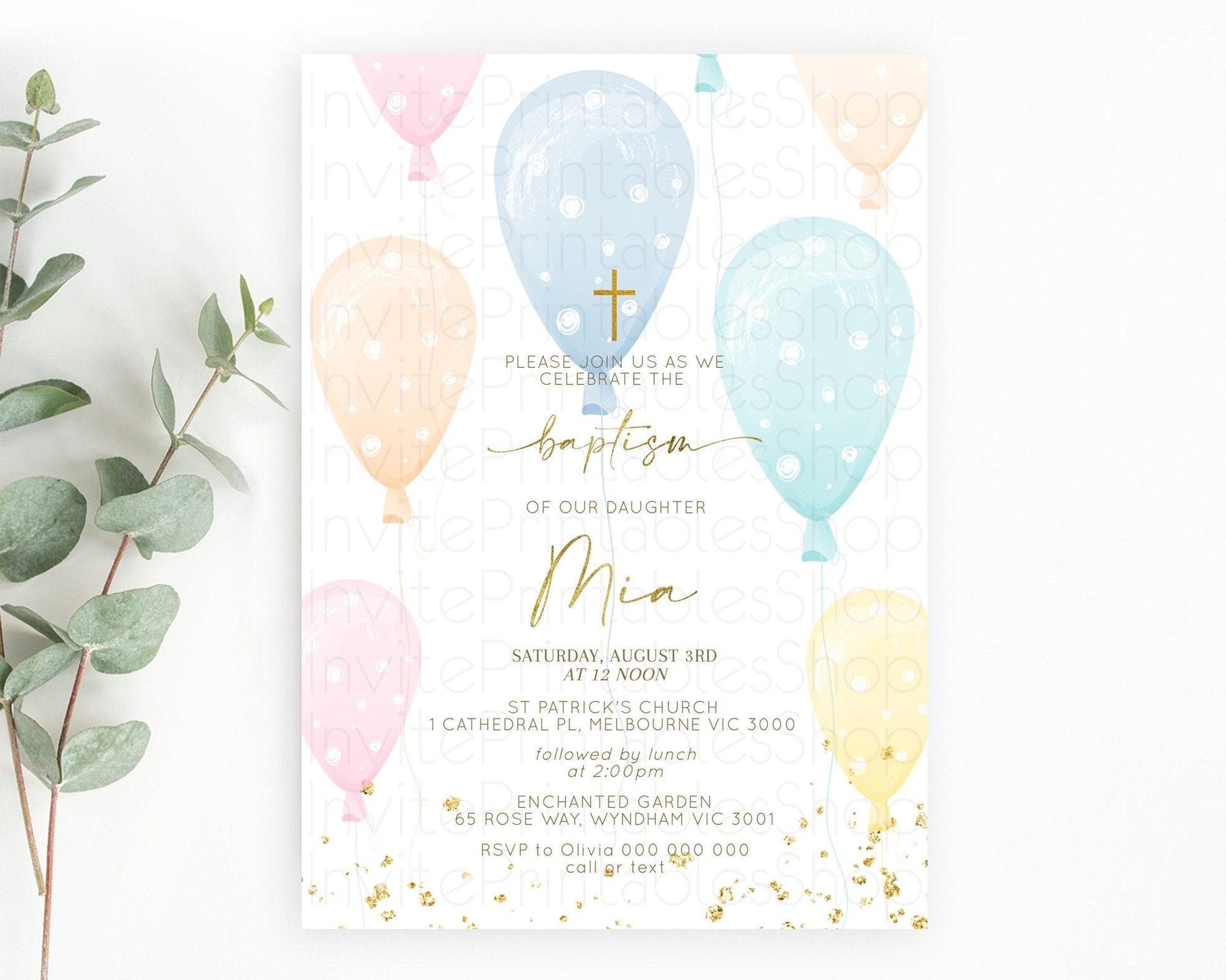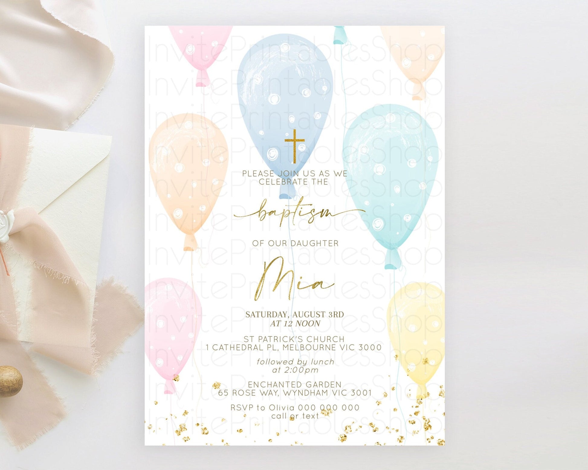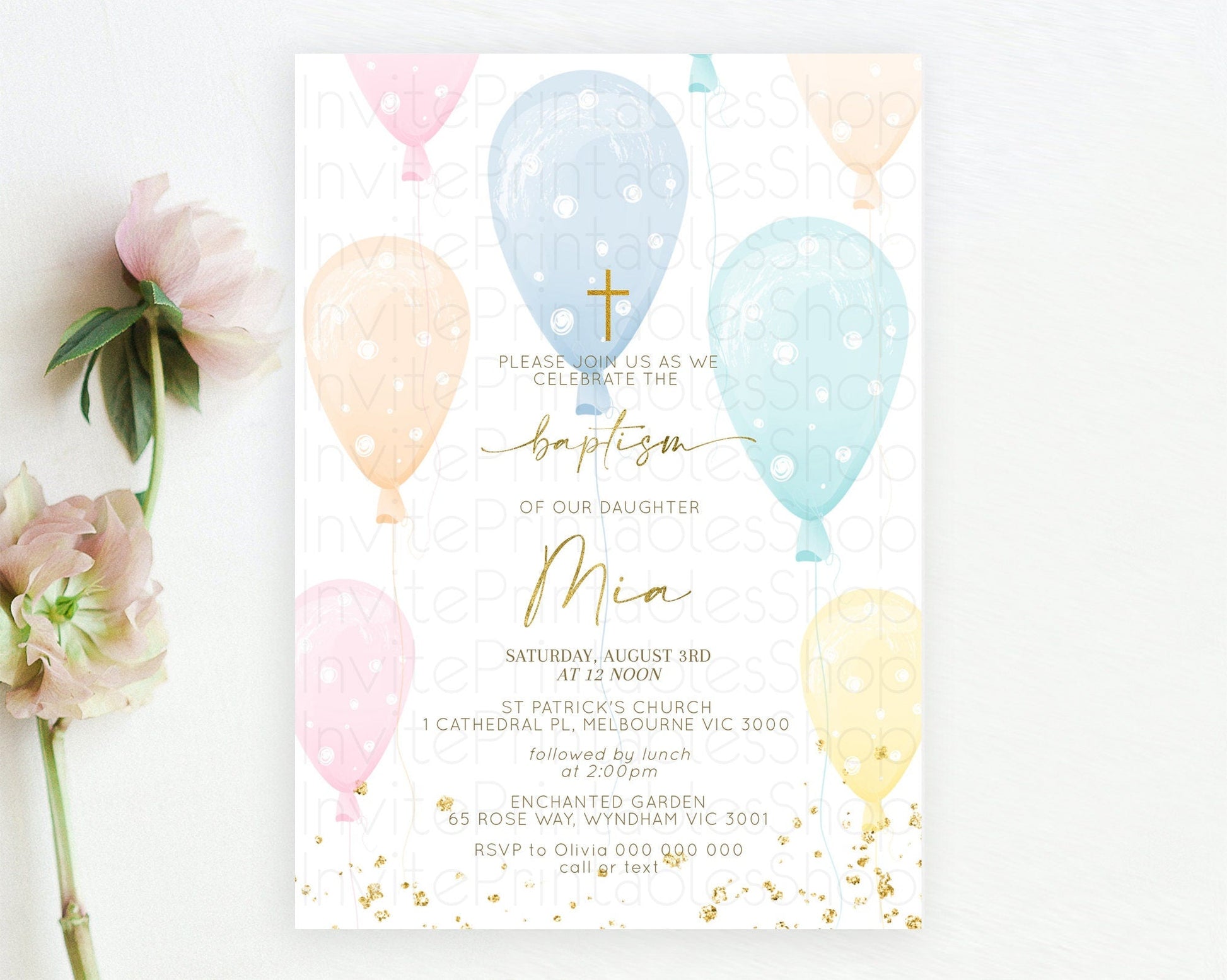 Balloon Baptism Invitation Pastel Baptism 1st Birthday Invitation Pastel Balloon Christening Invite Colorful Rainbow Balloon Invites D10182