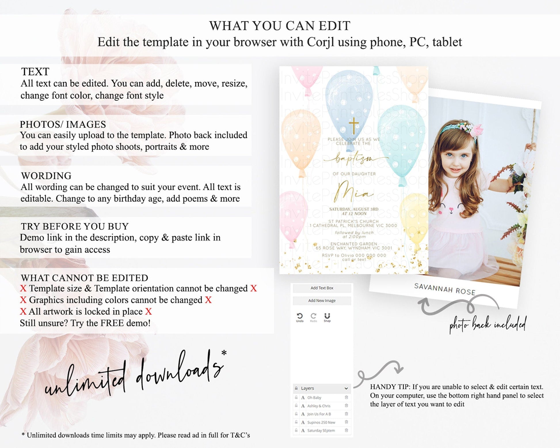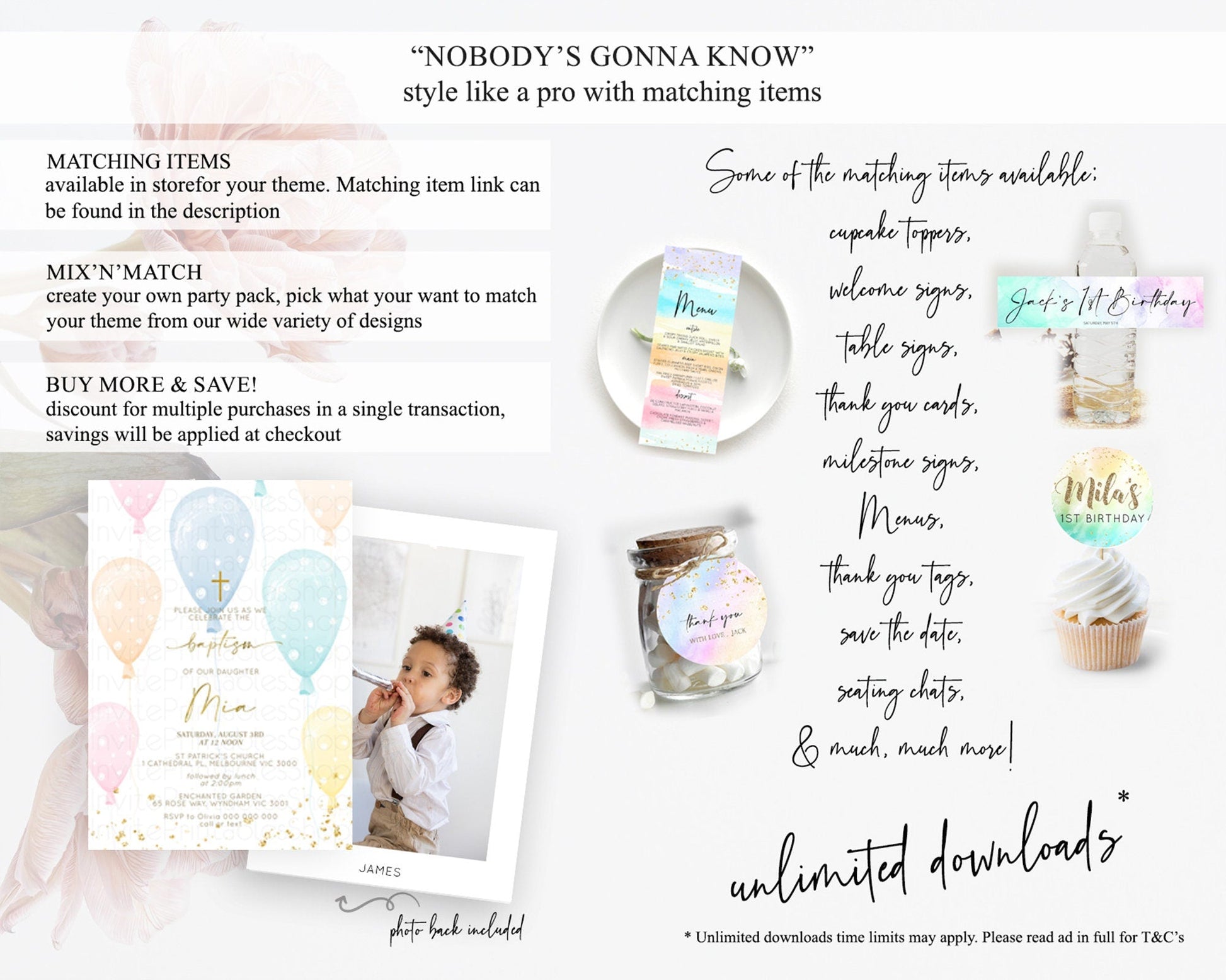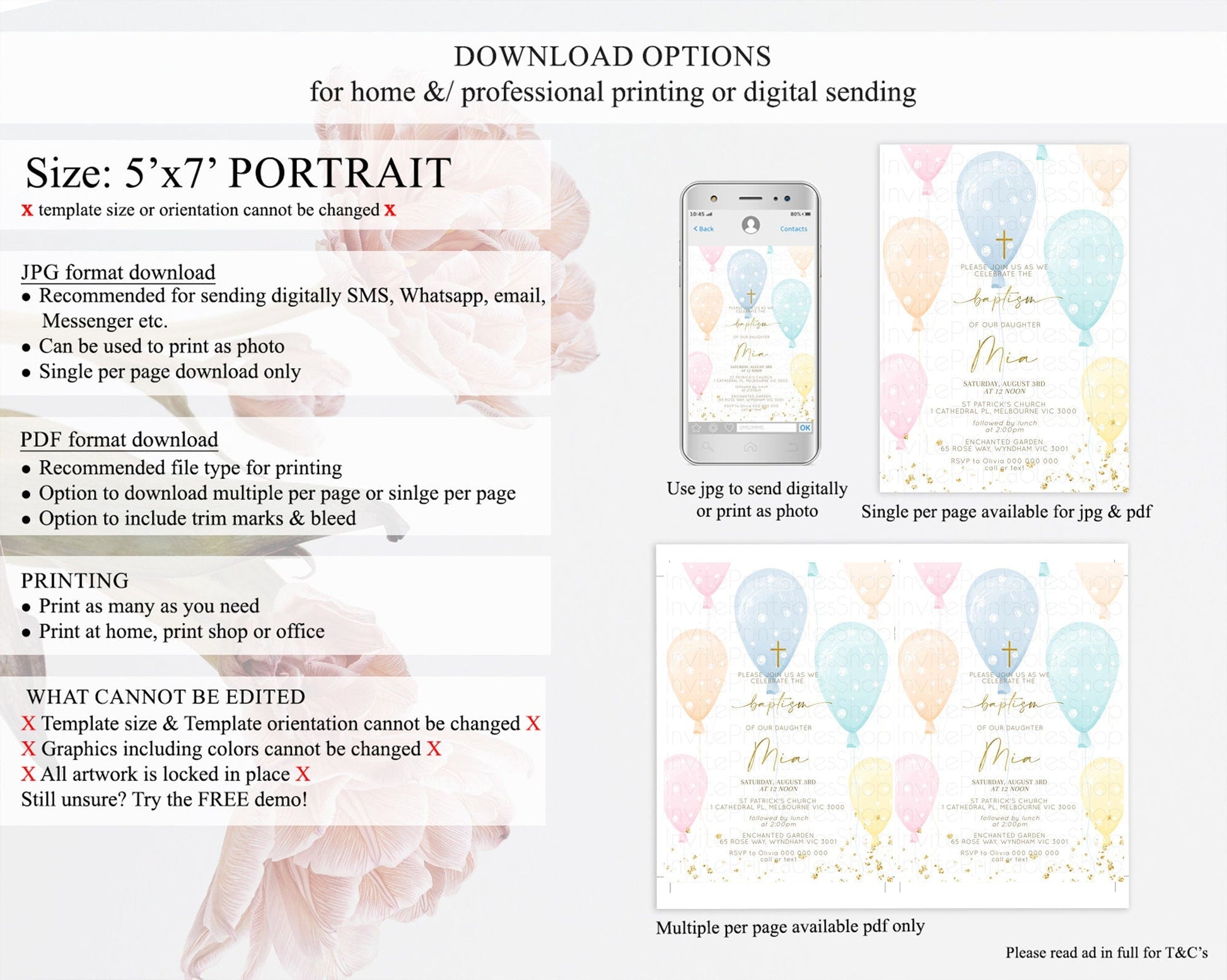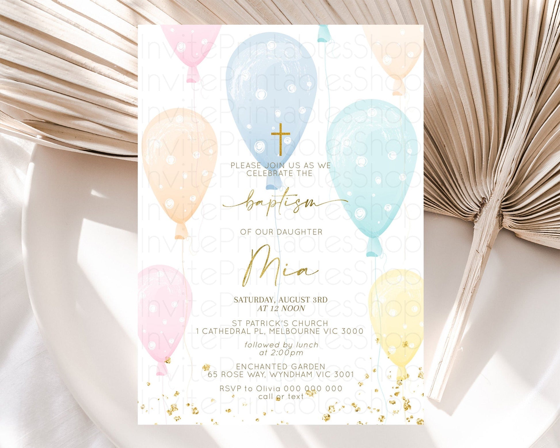 Balloon Baptism Invitation Pastel Baptism 1st Birthday Invitation Pastel Balloon Christening Invite Colorful Rainbow Balloon Invites D10182