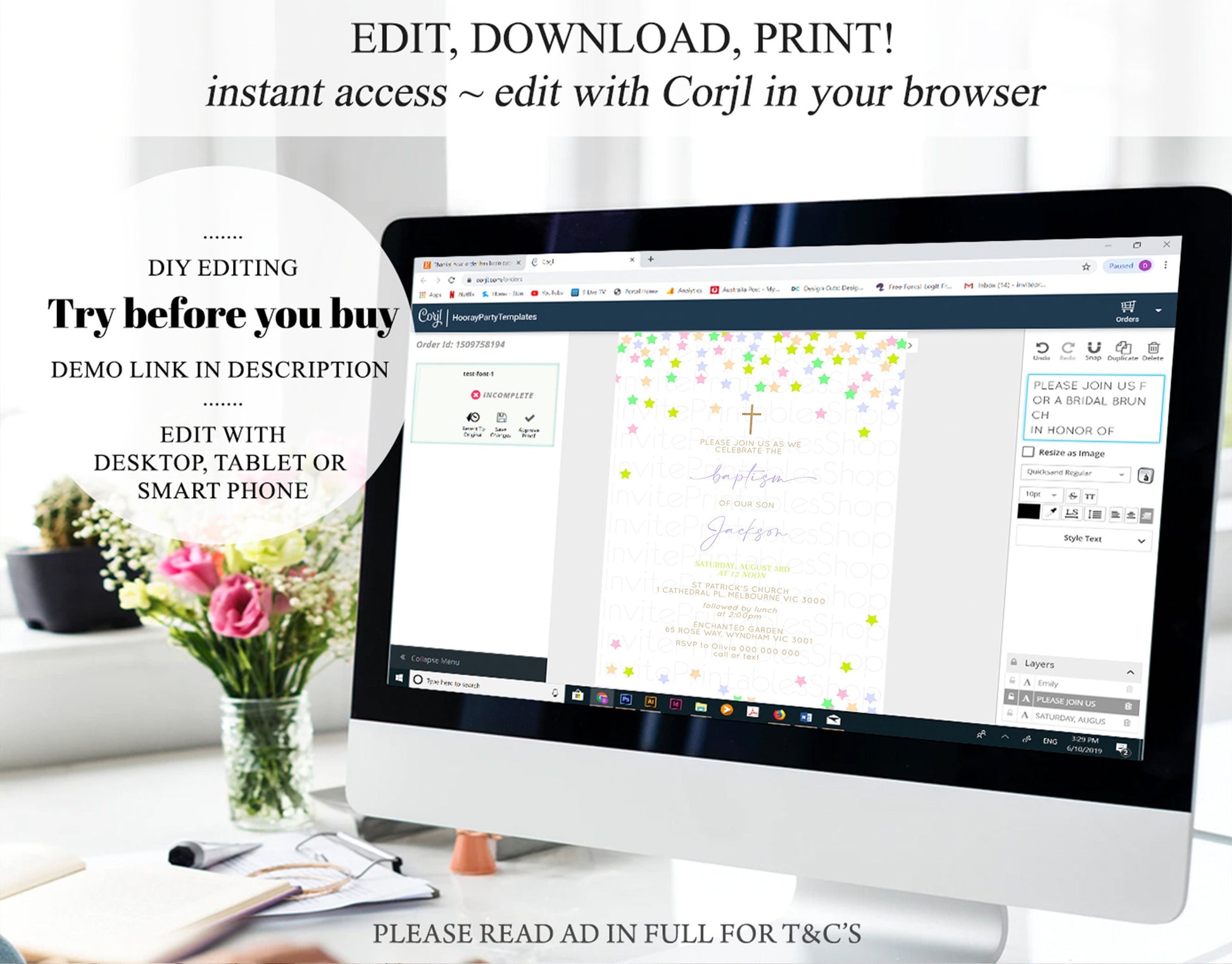 • After purchase, Corjl emails your editing link. Allow up to 15 minutes for delivery.
