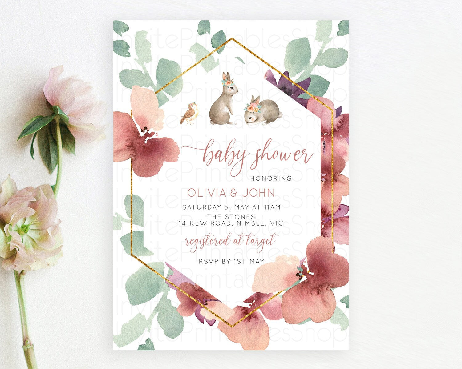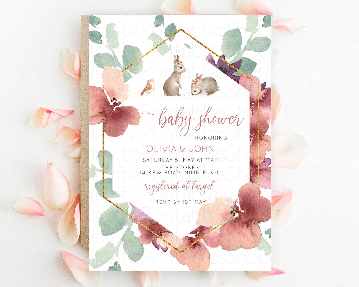 Bunny Baby Shower Invitation: Burgundy Flowers, Pastel Flowers, Secret Garden, Gold Accents, Leafy, Pastel Burgundy, Woodland Theme D11033