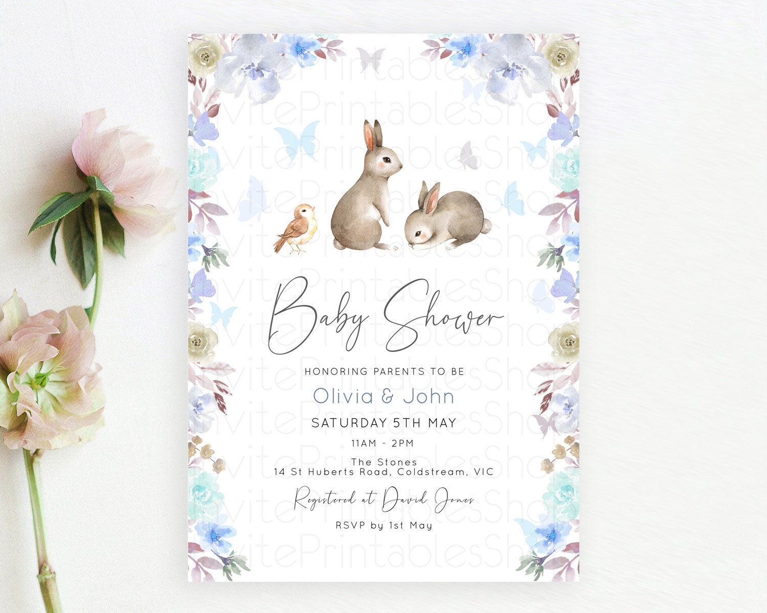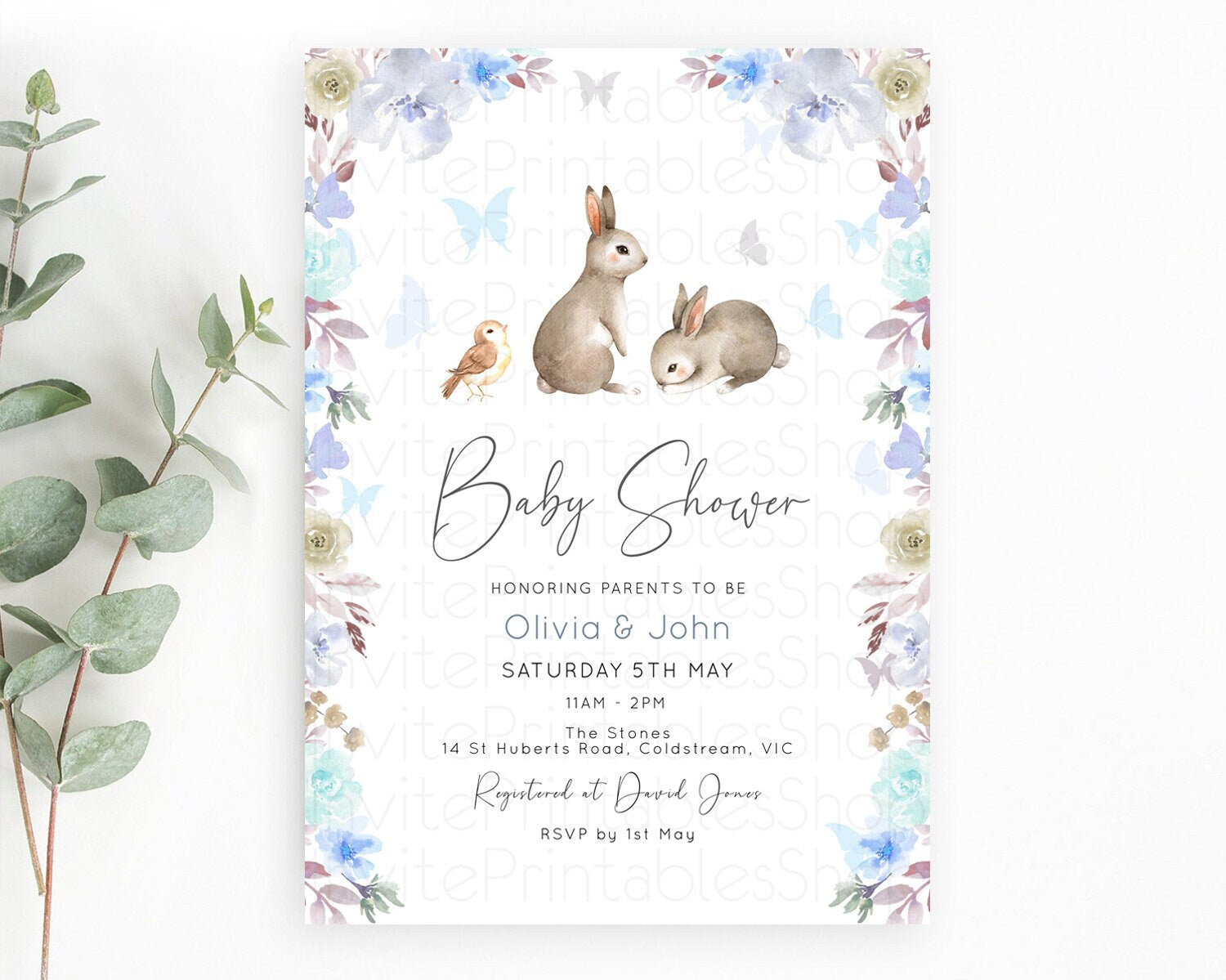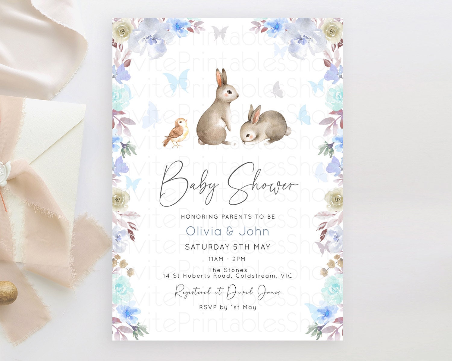 Bunny Baby Shower Invitation: Enchanted Forest, Secret Garden, Pastel Blue Floral, White, Grey, Rabbit, Butterfly, Woodland Theme D10927