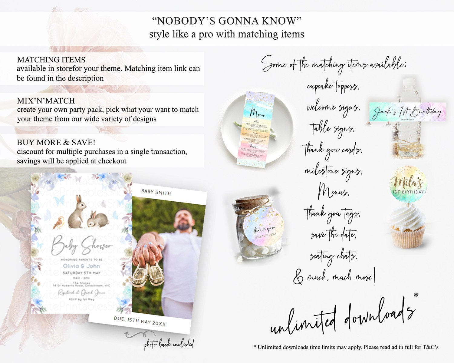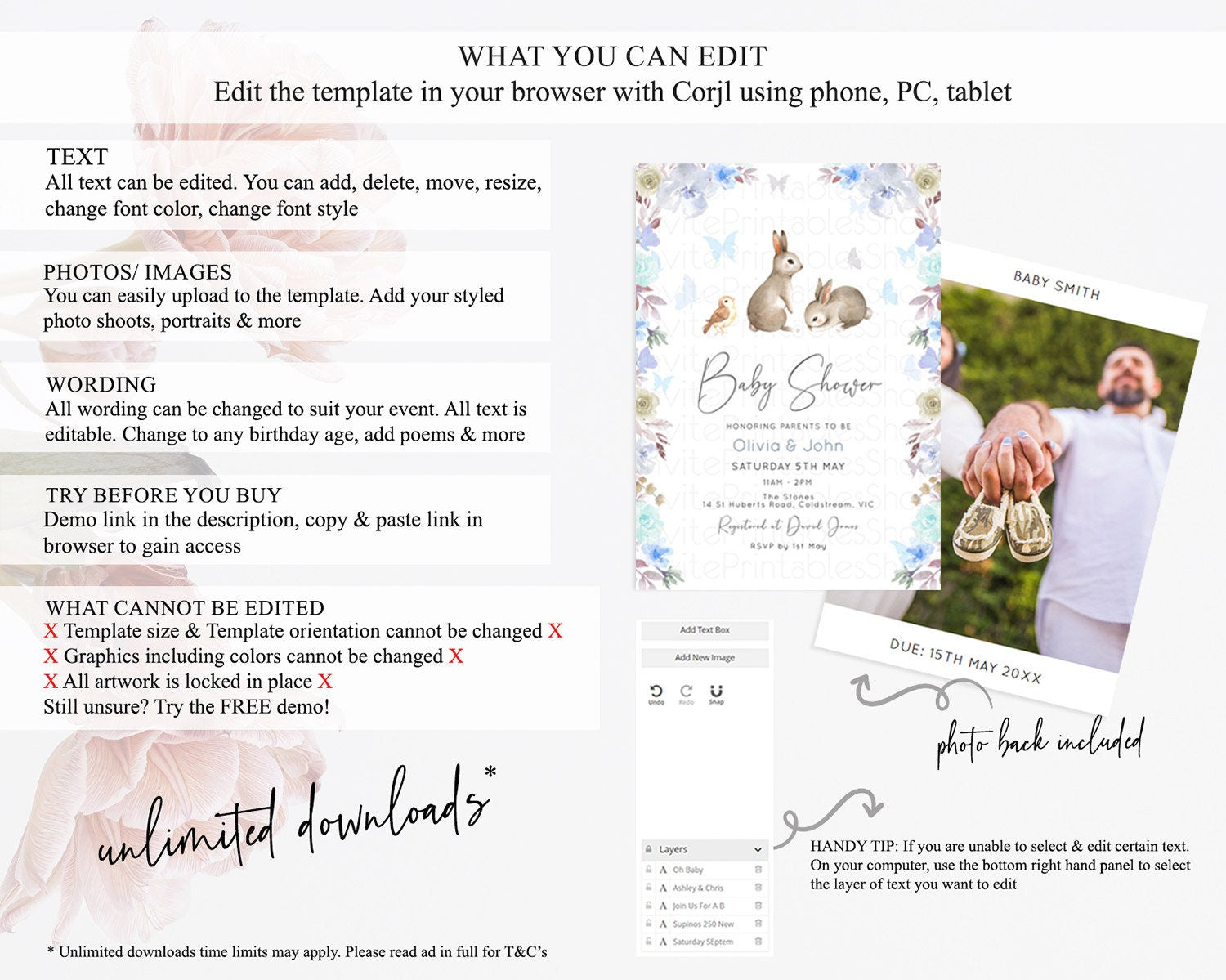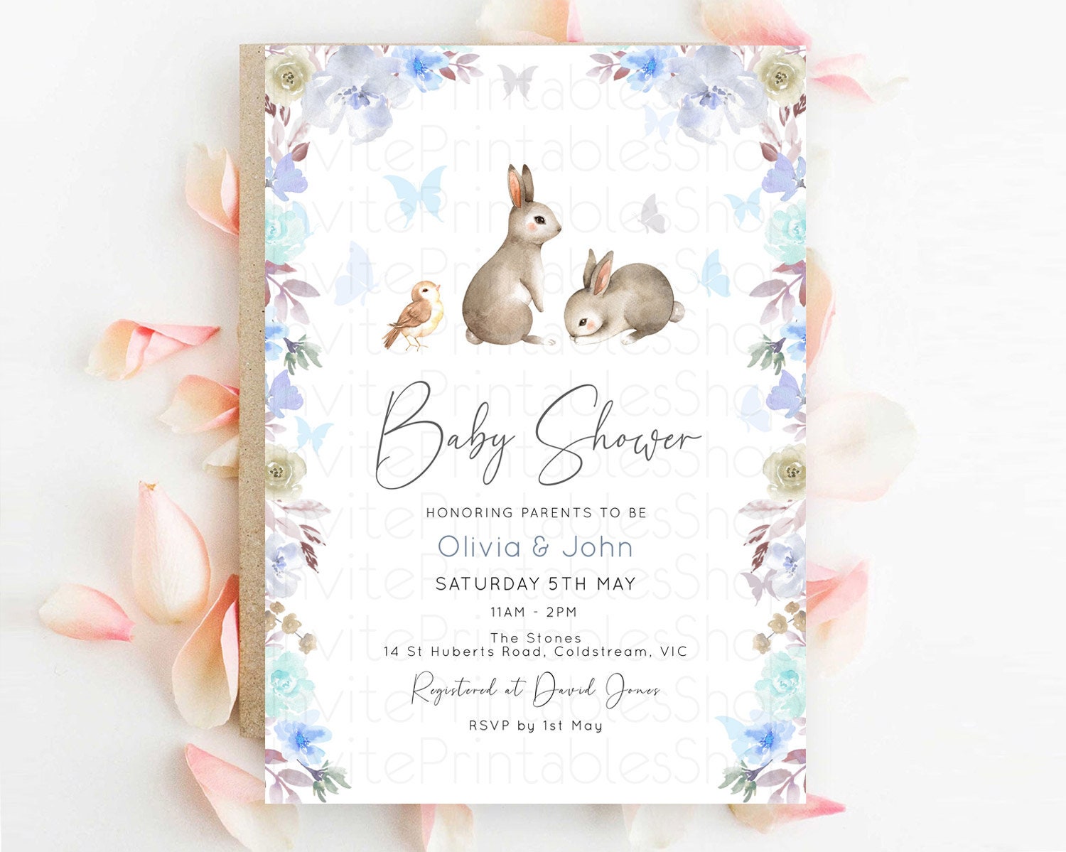 Bunny Baby Shower Invitation: Enchanted Forest, Secret Garden, Pastel Blue Floral, White, Grey, Rabbit, Butterfly, Woodland Theme D10927