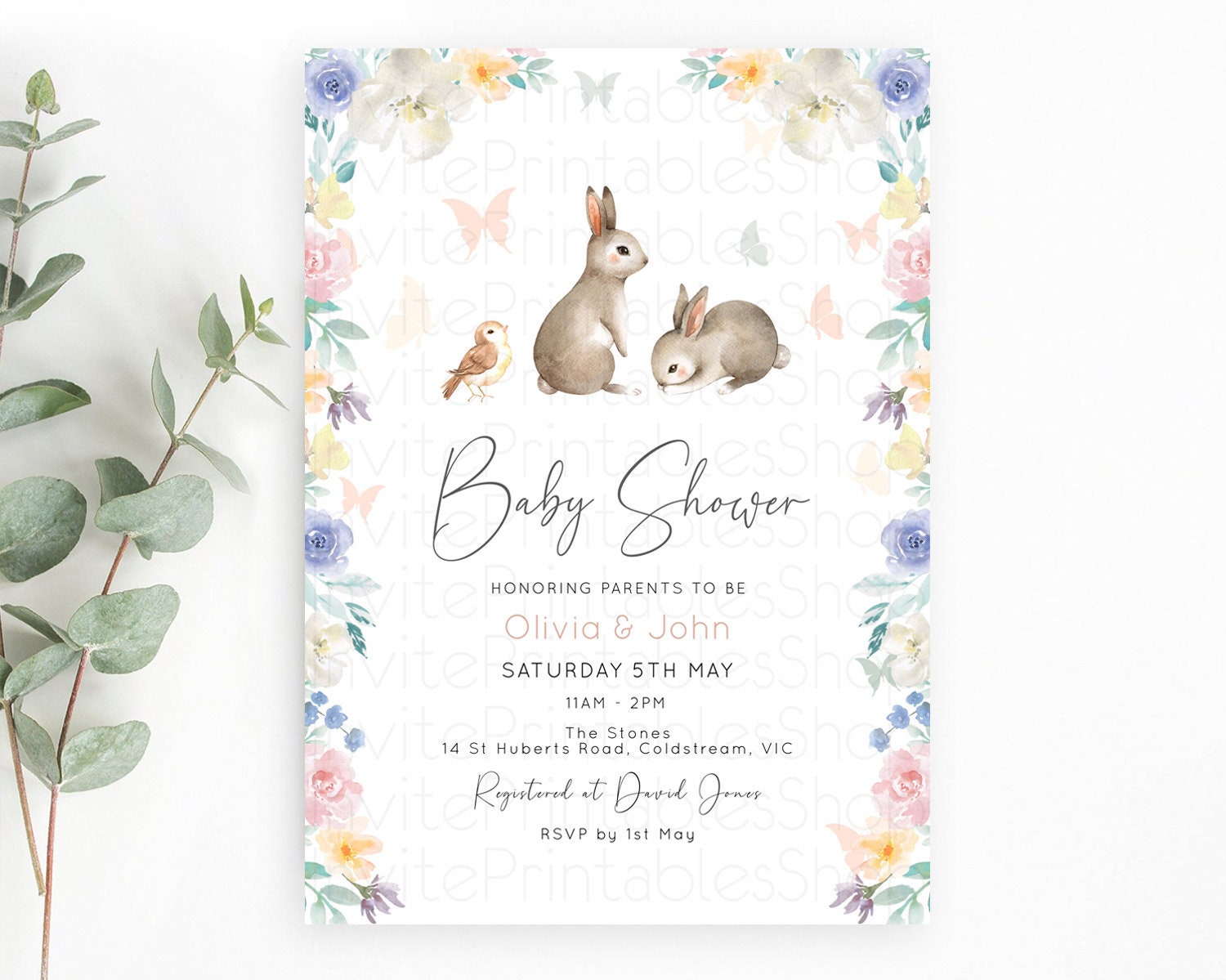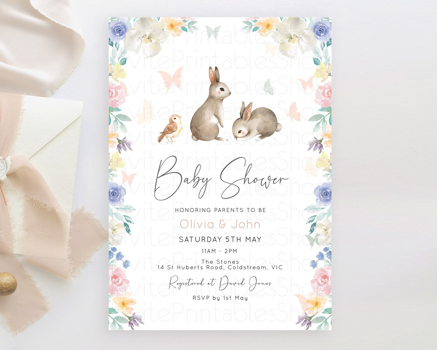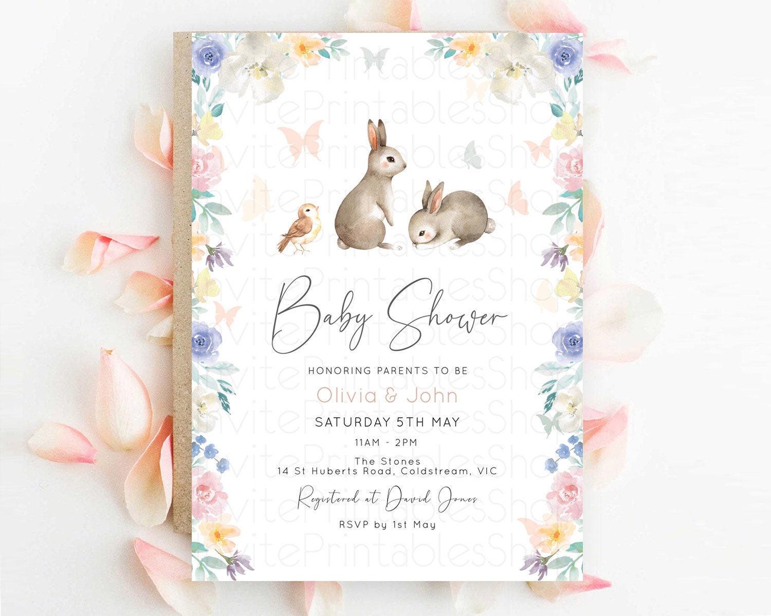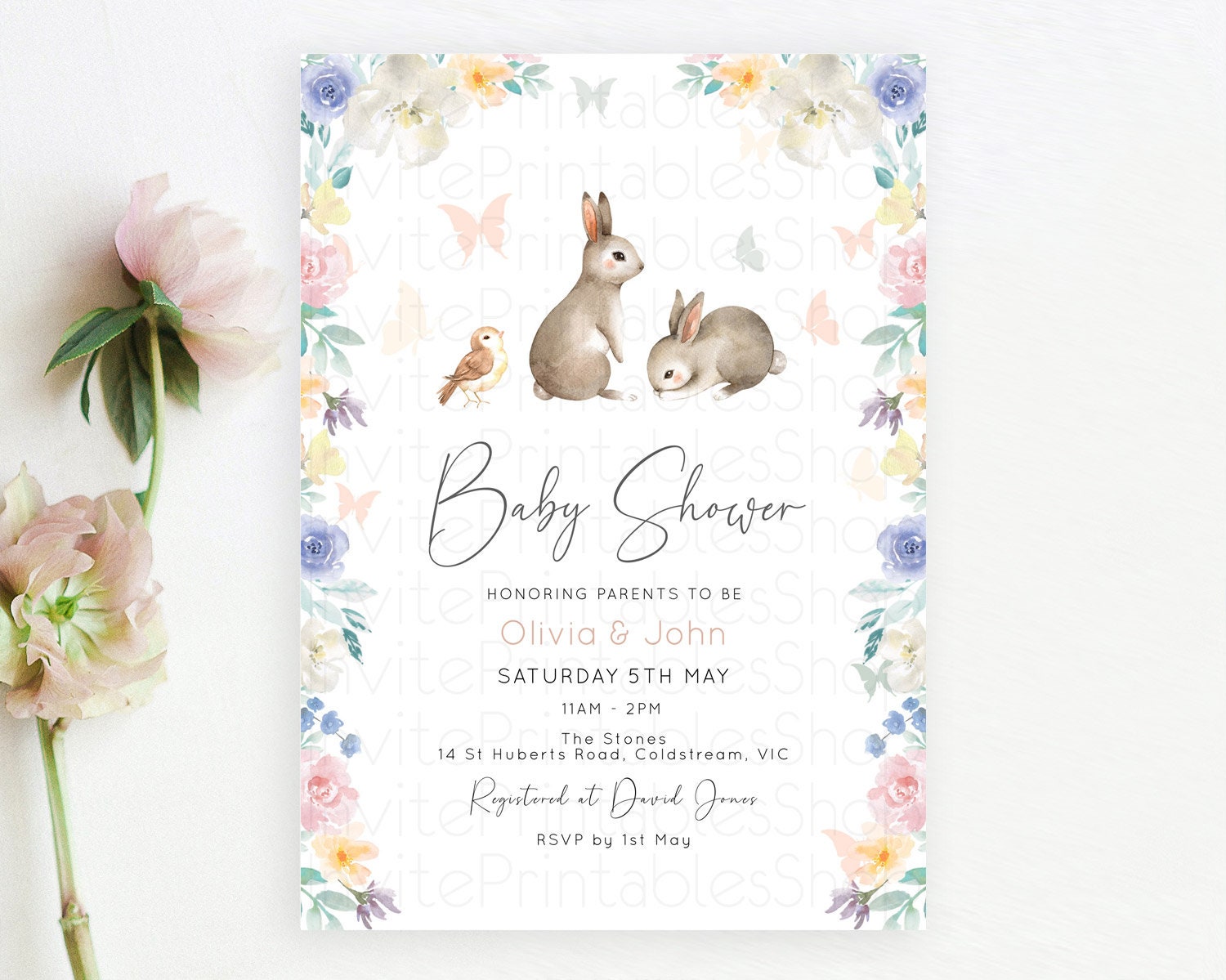 Bunny Baby Shower Invitation: Secret Garden, Enchanted Garden, Pastel Watercolor Woodland - Pink Blue White Flowers and Butterflies D10928