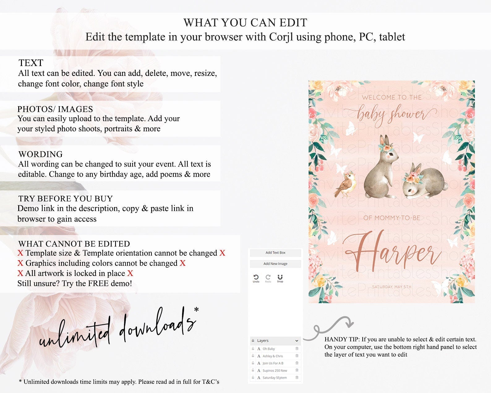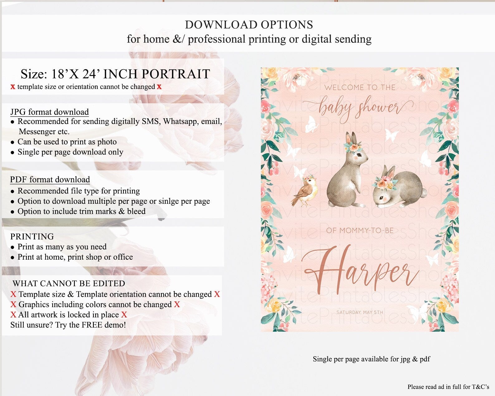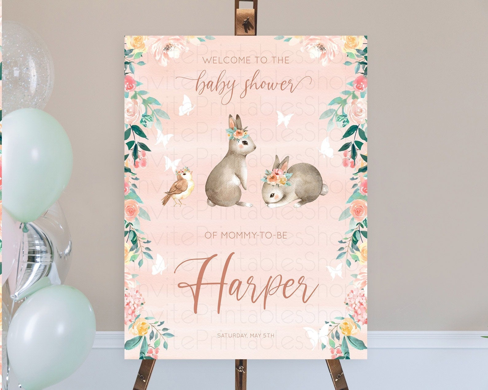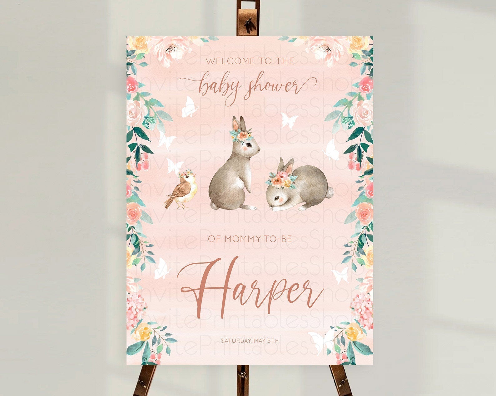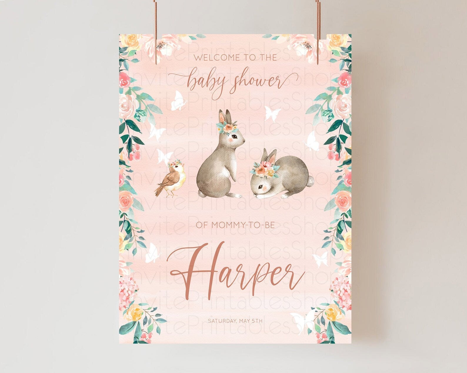 Bunny Baby Shower Welcome Sign Floral Bunny Welcome Board Pastel Flowers Woodland Bunny Welcome Poster Forest Bunny Welcome Sign D10922