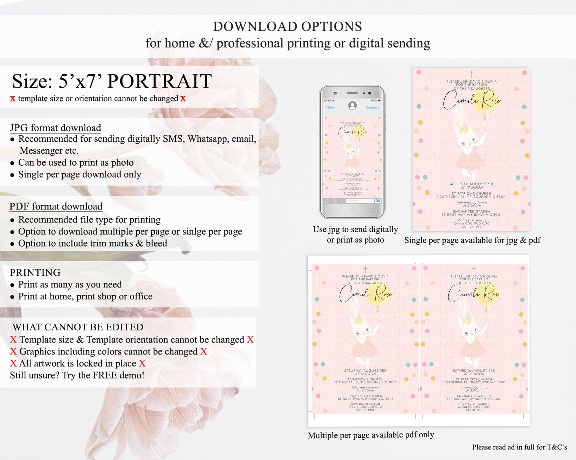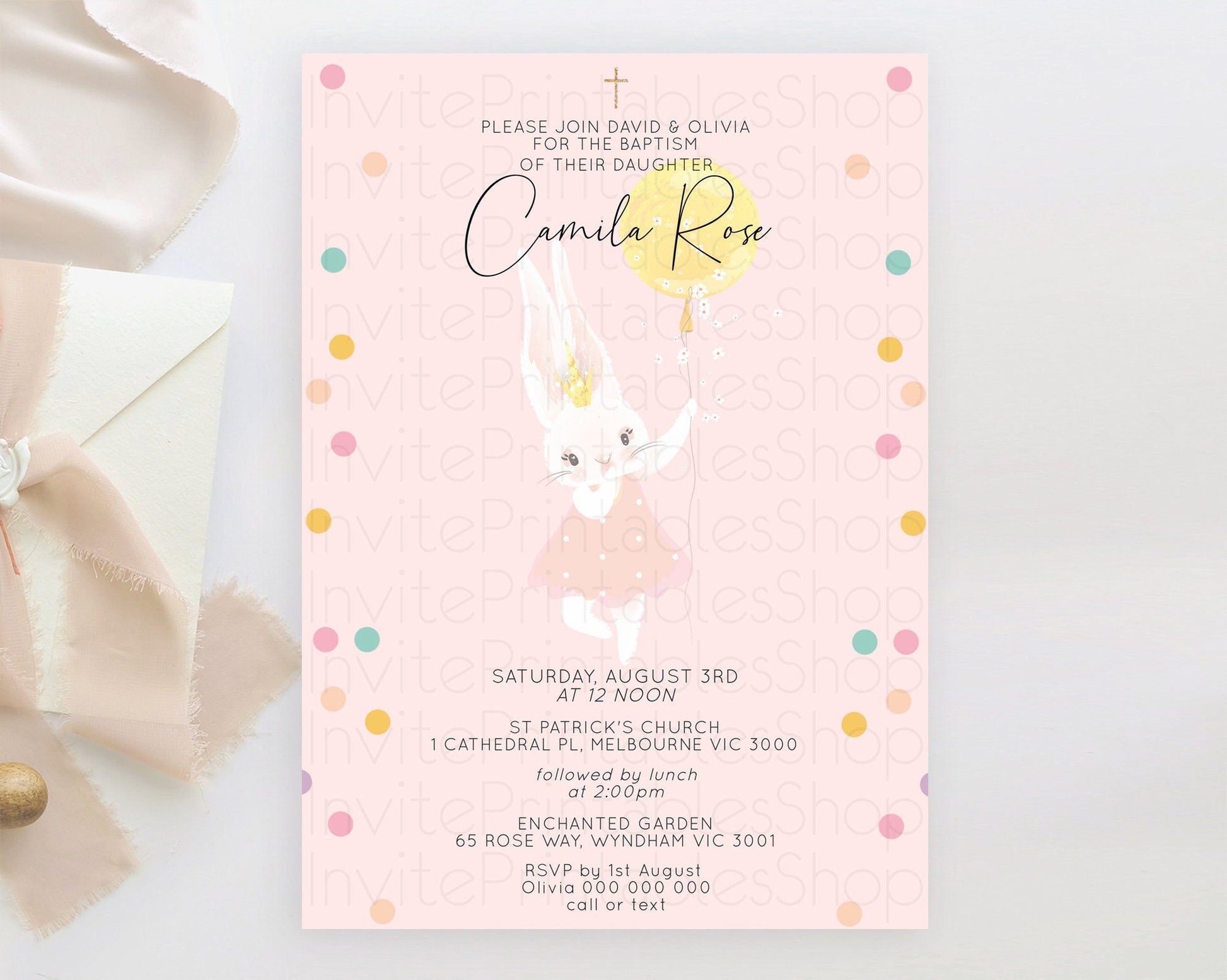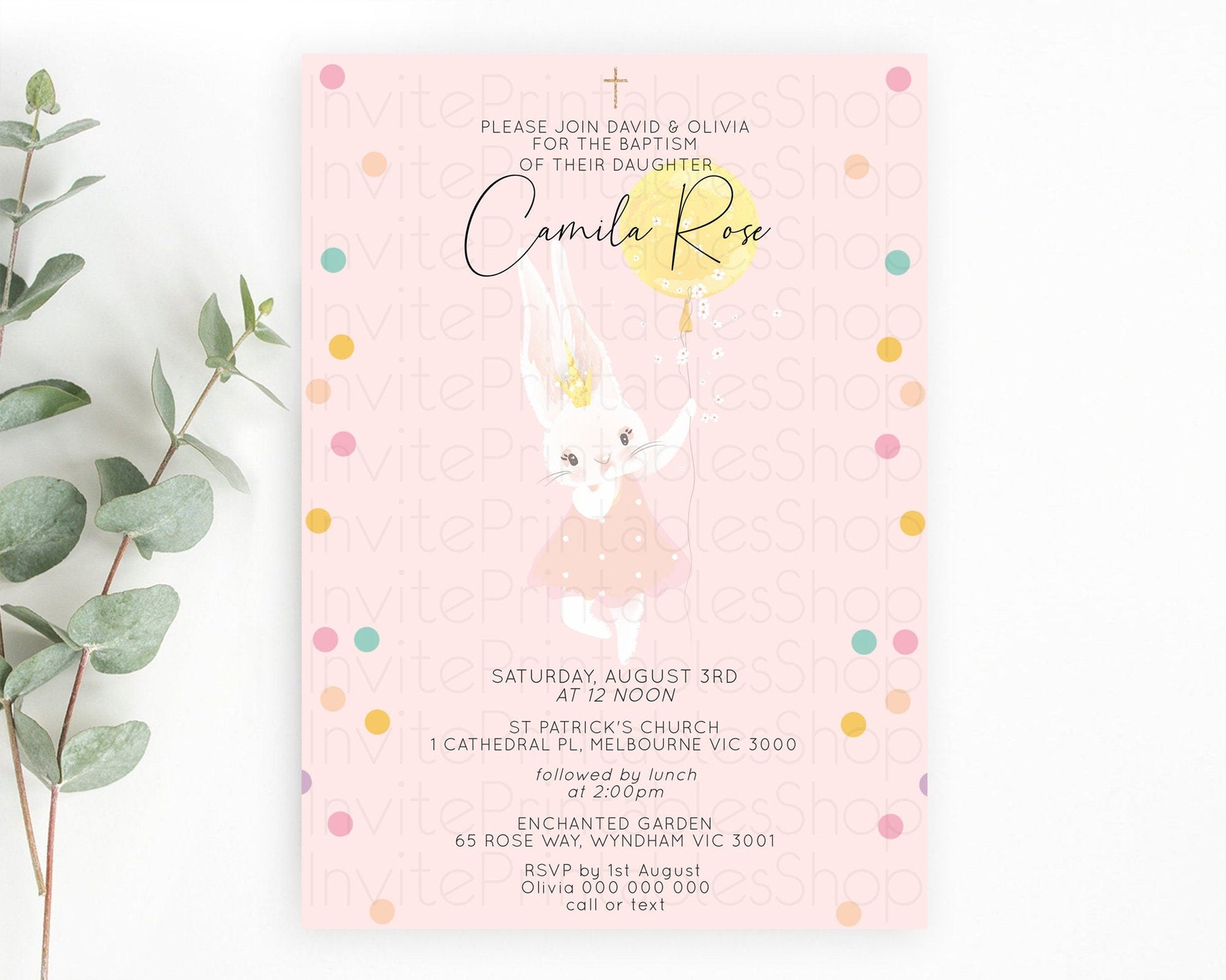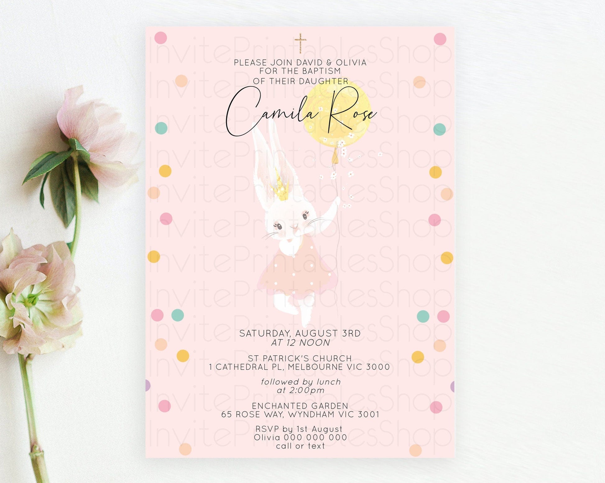 Bunny Baptism Invitation Pastel Bunny Baptism 1st Birthday Invitation Bunny Balloon Christening Invite Pastel Confetti Balloon Bunny D10219
