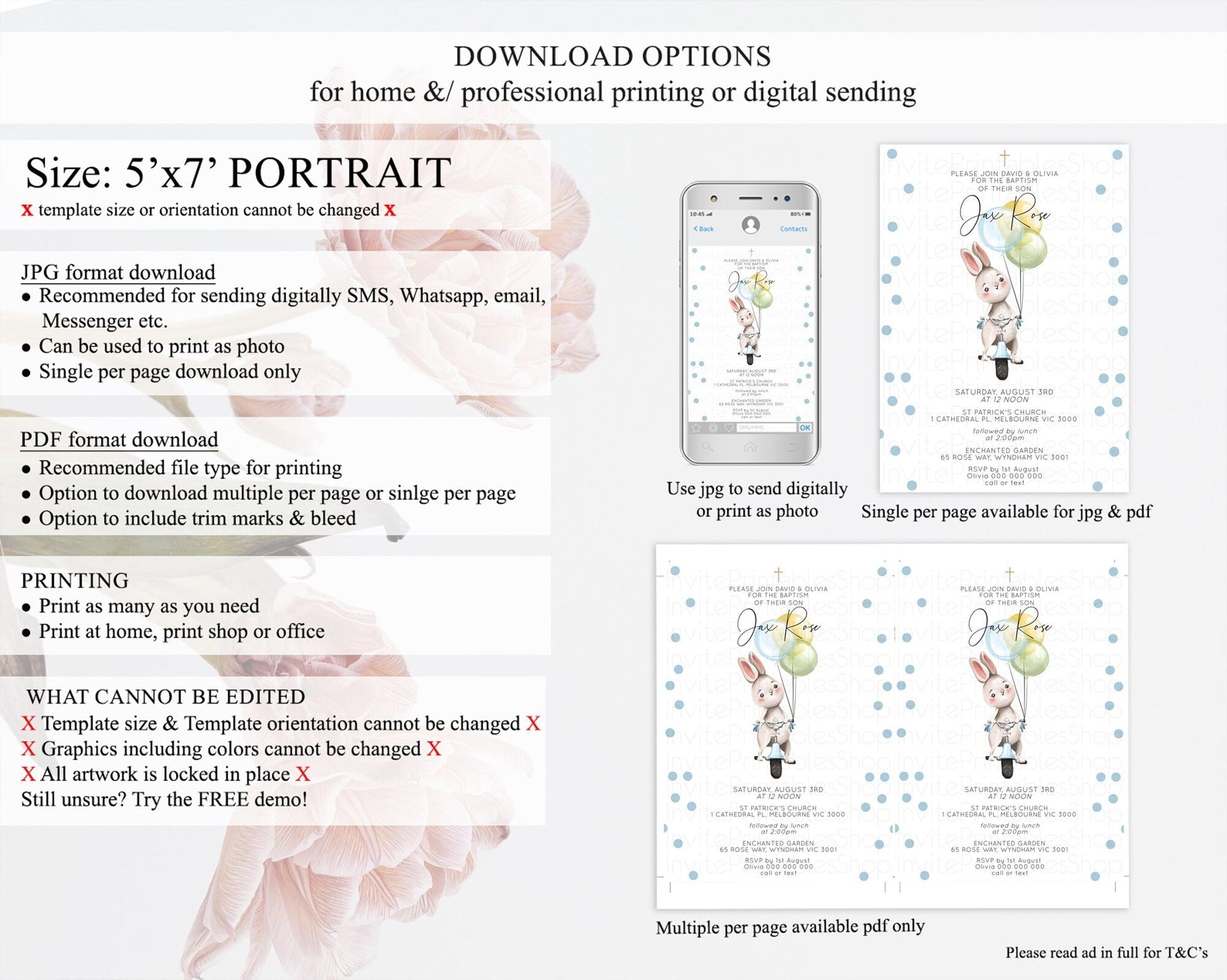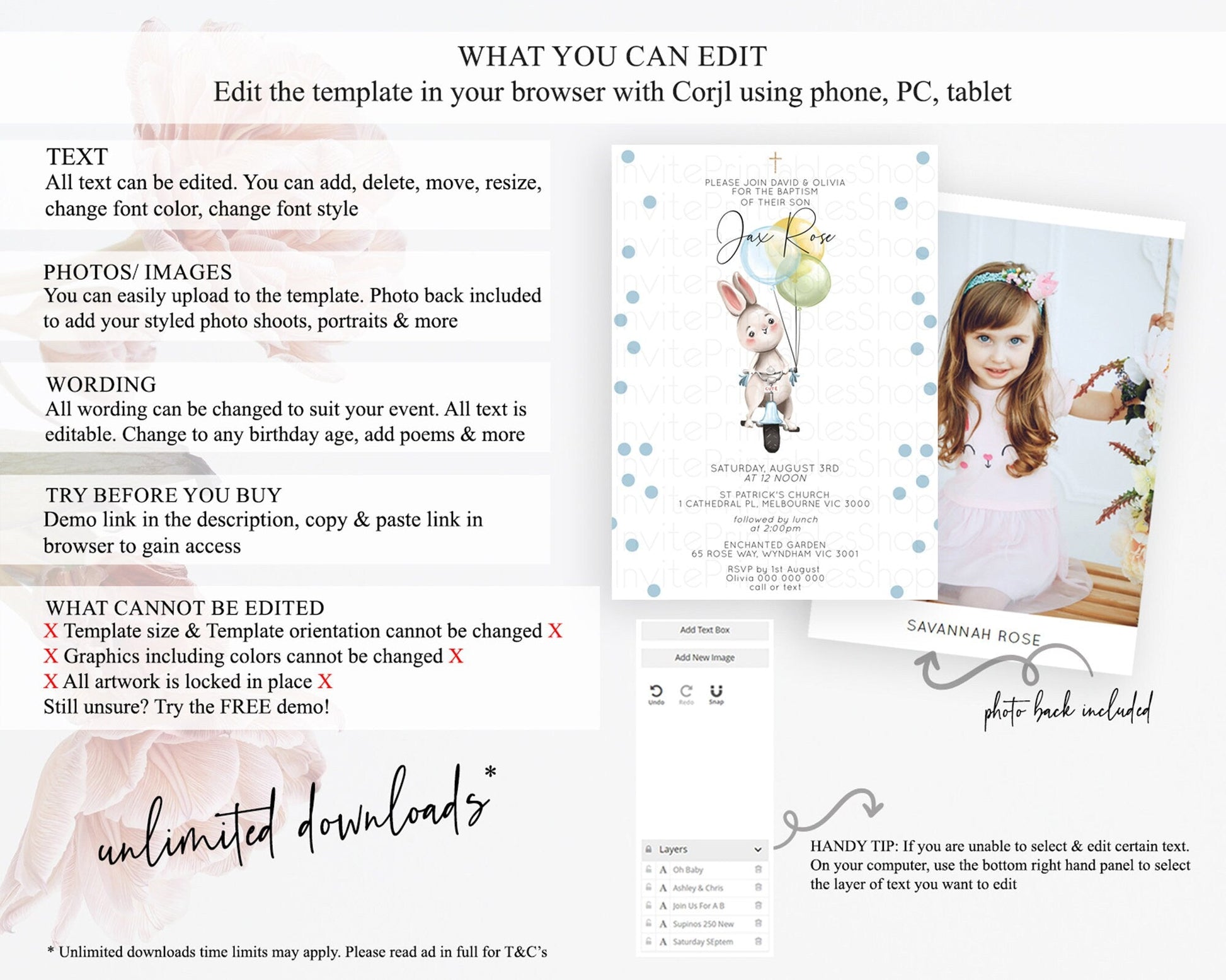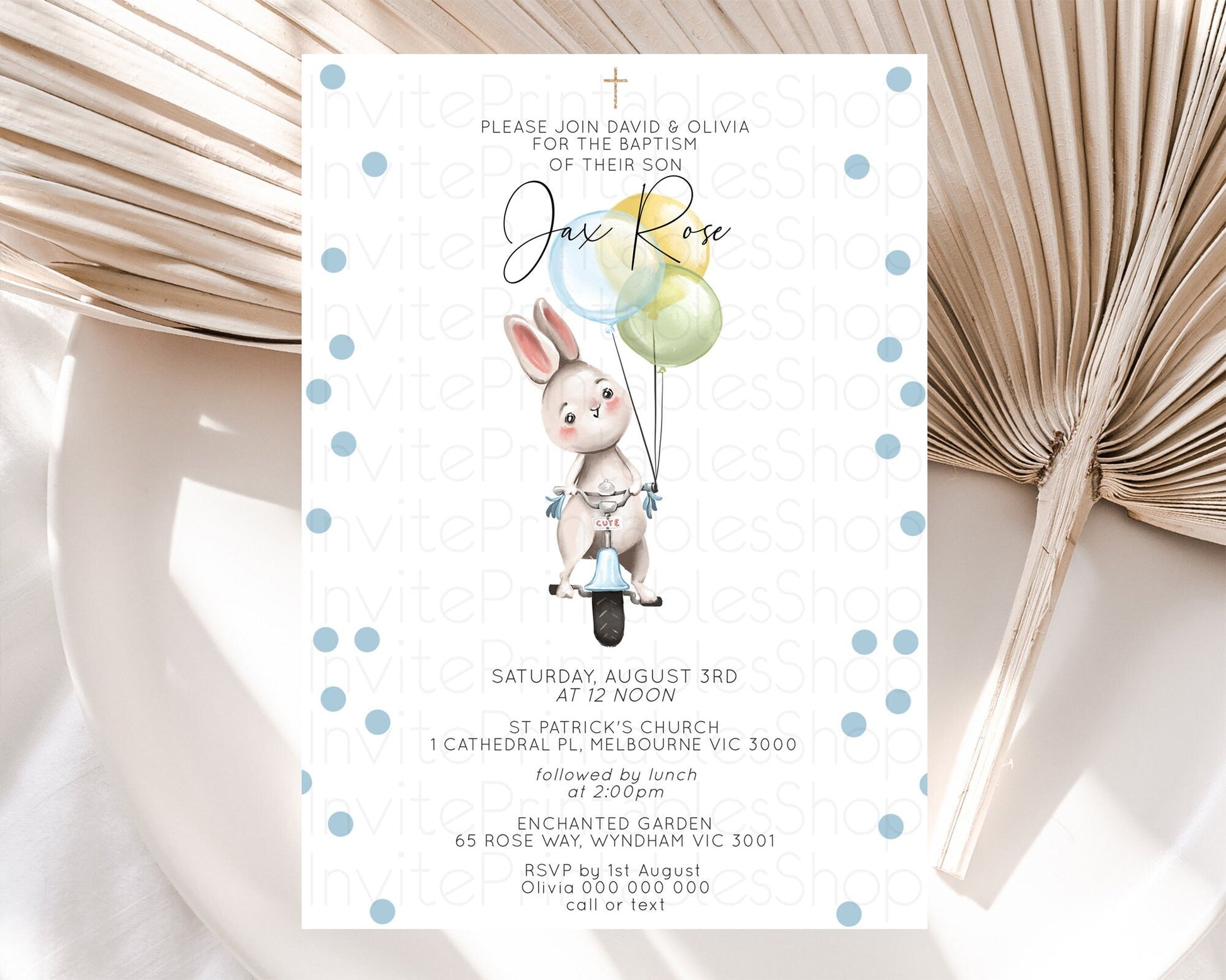 Bunny Baptism Invitation Pastel Bunny Baptism 1st Birthday Invitation Bunny Balloon Christening Invite Pastel Confetti Balloon Bunny D10783