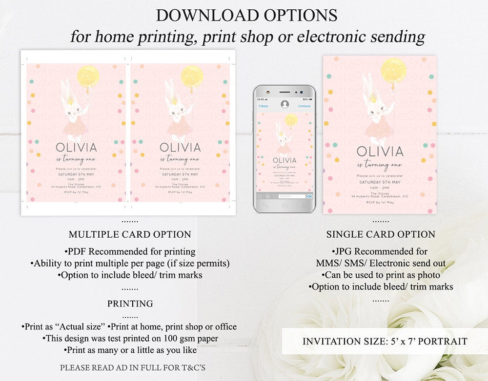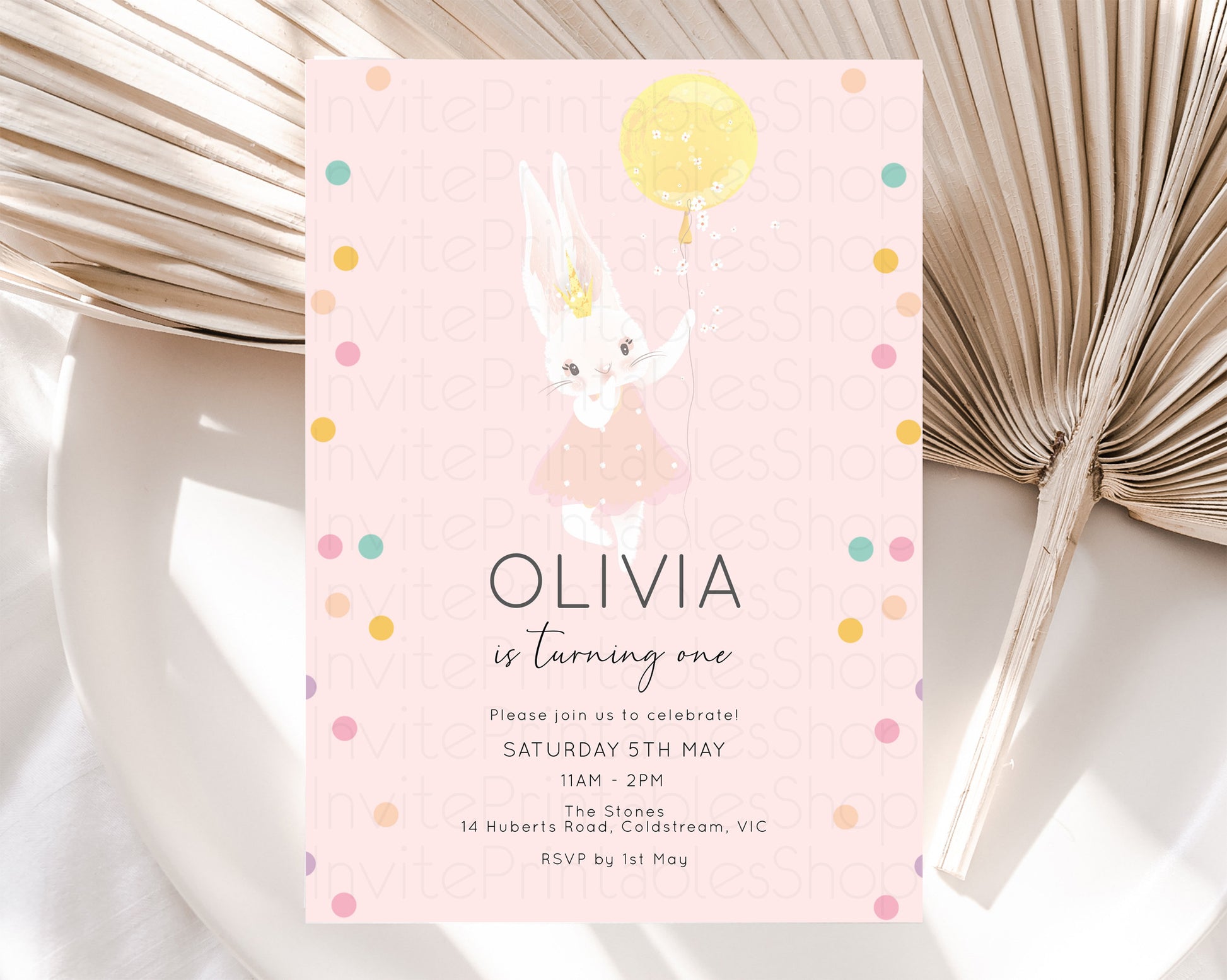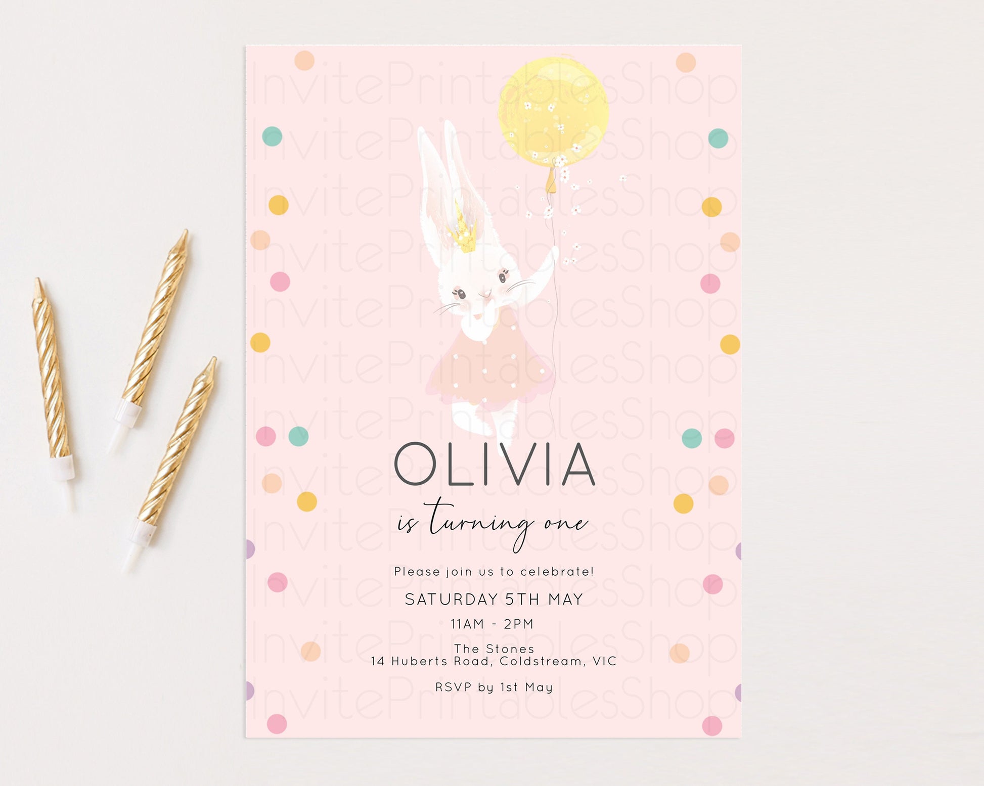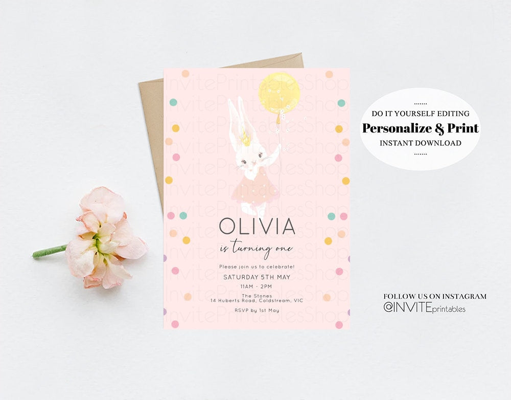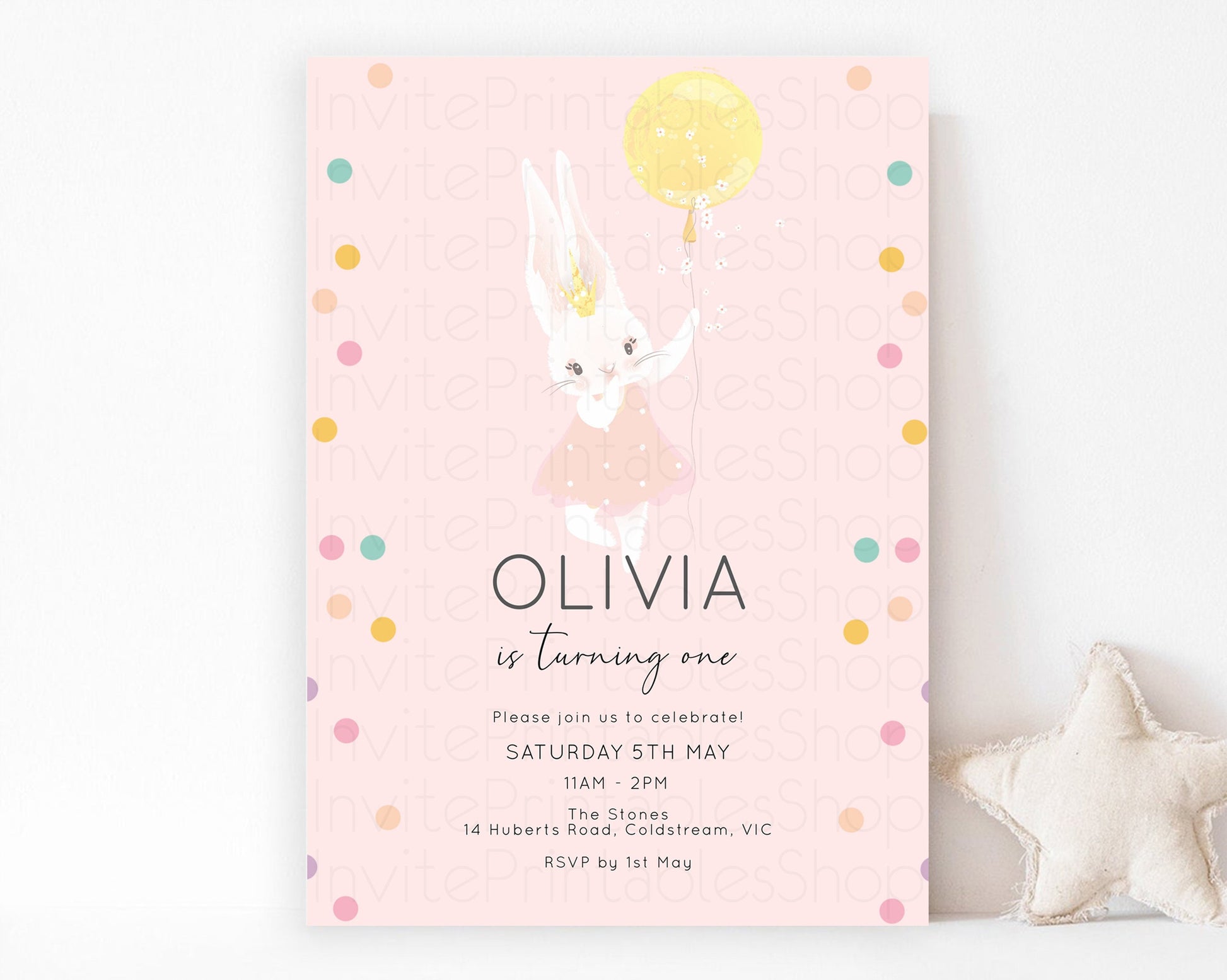 Bunny Birthday Invite Balloon Birthday Invitation Cute Bunny Rabbit Rainbow Sprinkles Confetti Pastel Confetti Pink Yellow 1st 2nd 3rd 141