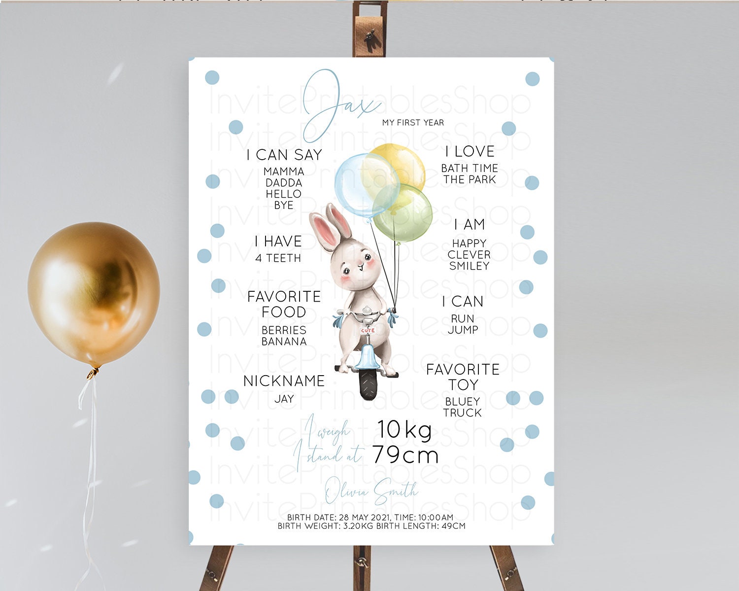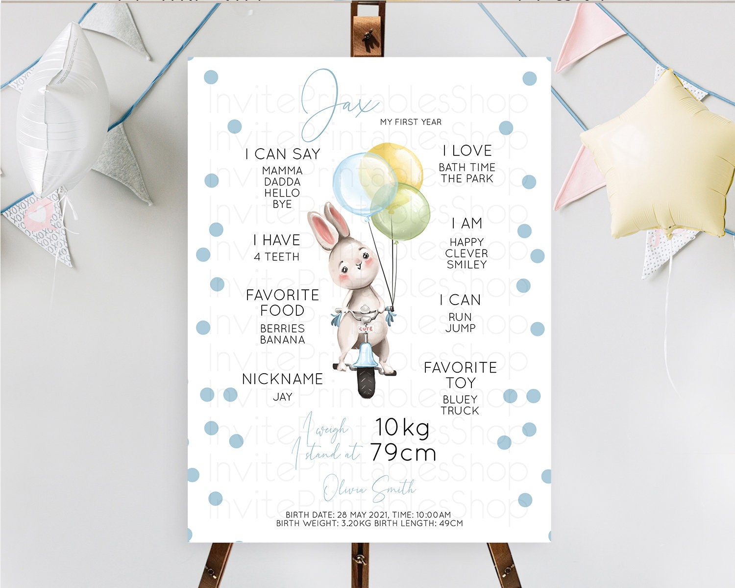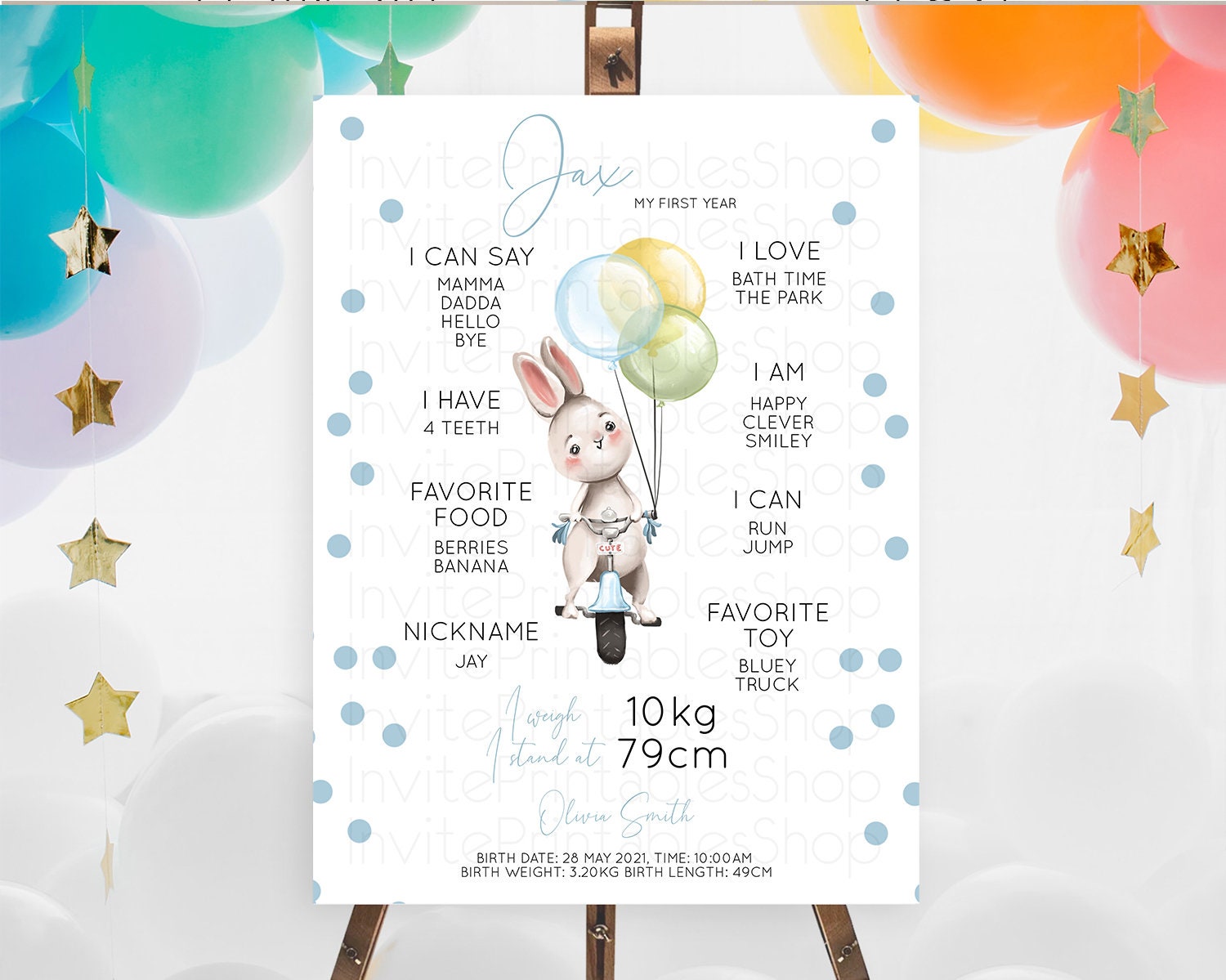 Bunny First Birthday Milestone Board Bunny Balloon Milestone Poster Colorful Pastel Confetti Bunny First Birthday Welcome Sign D10783