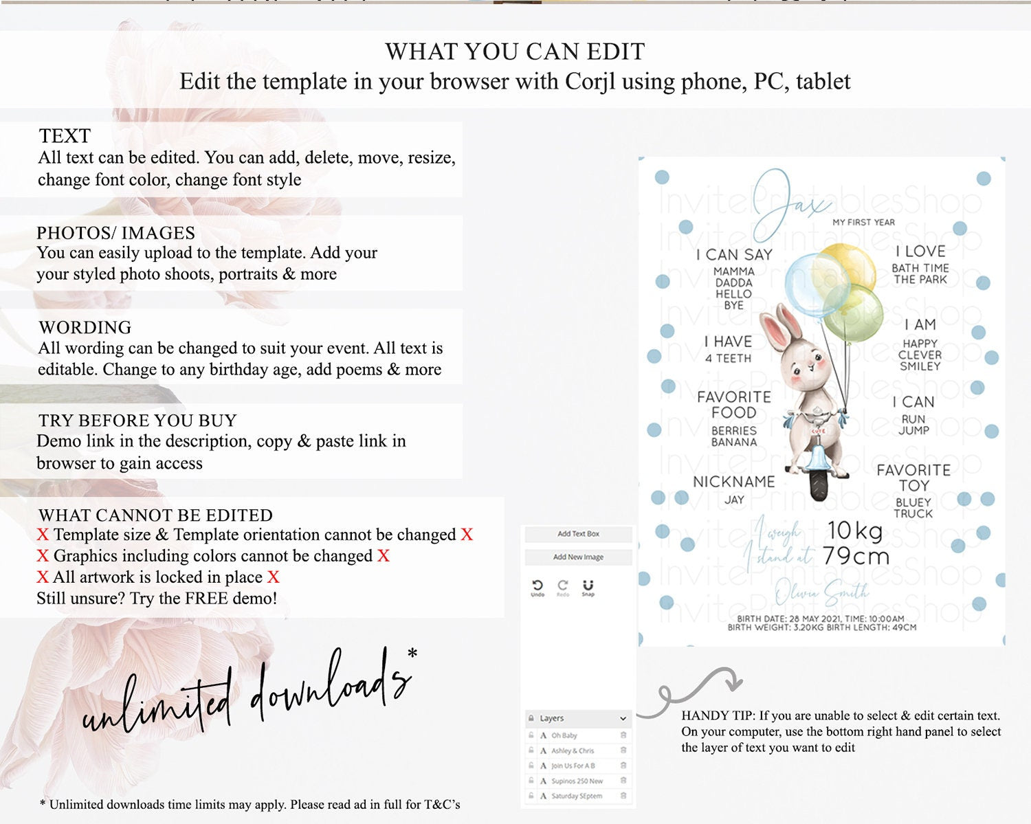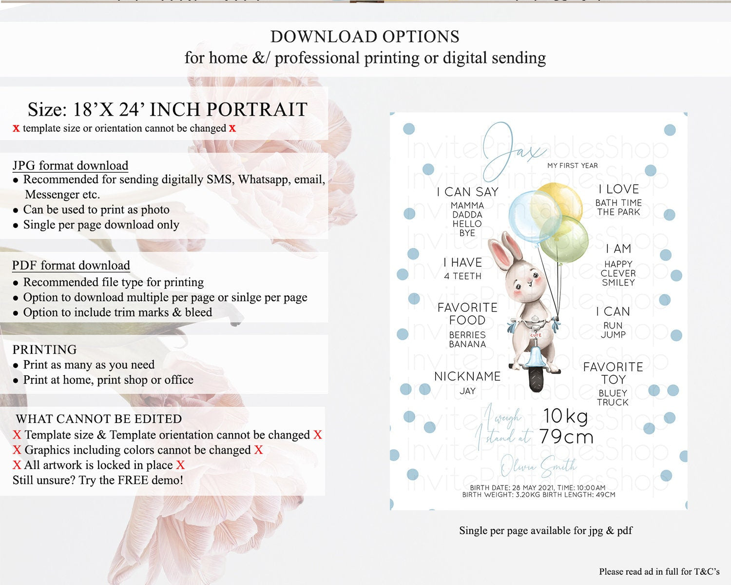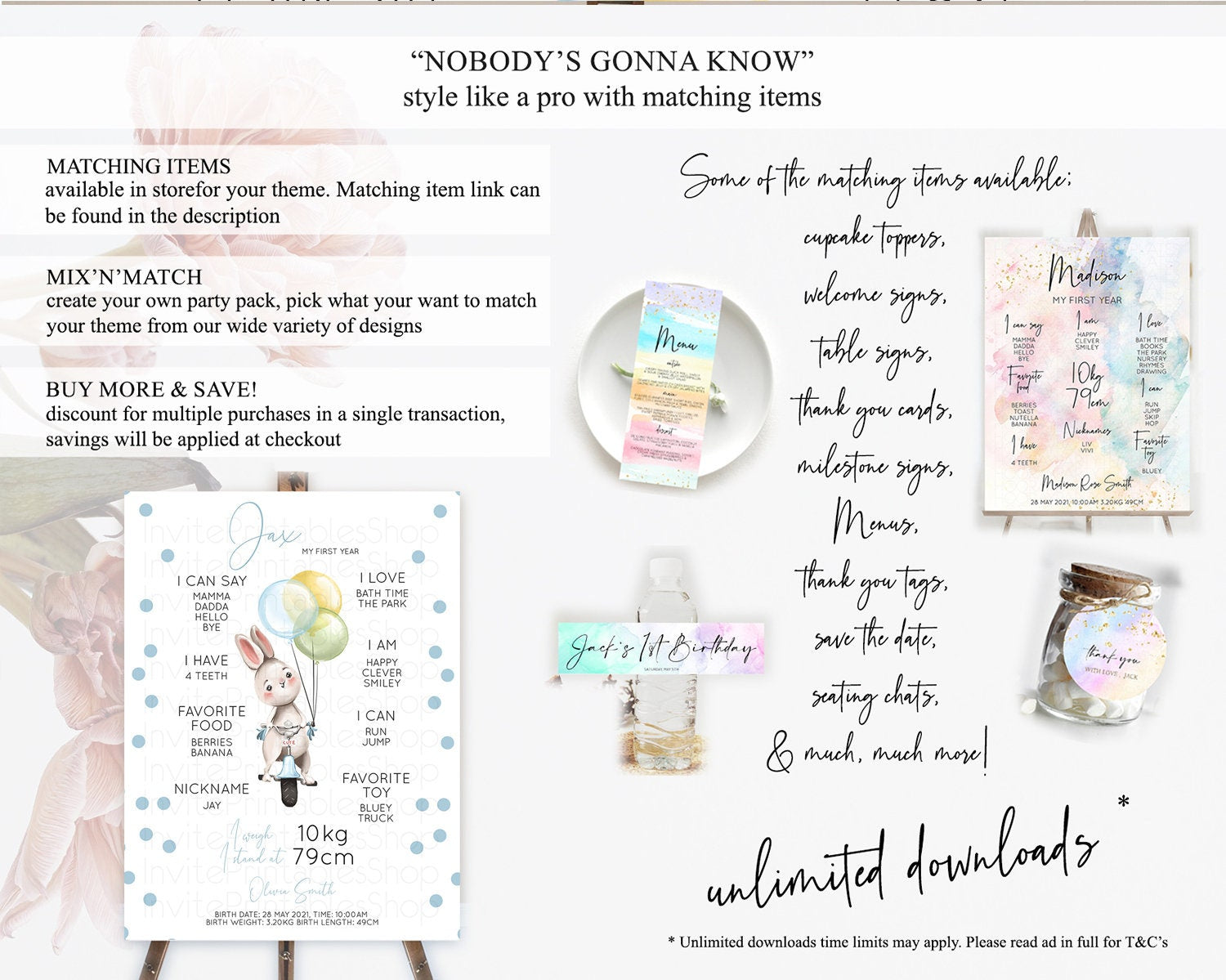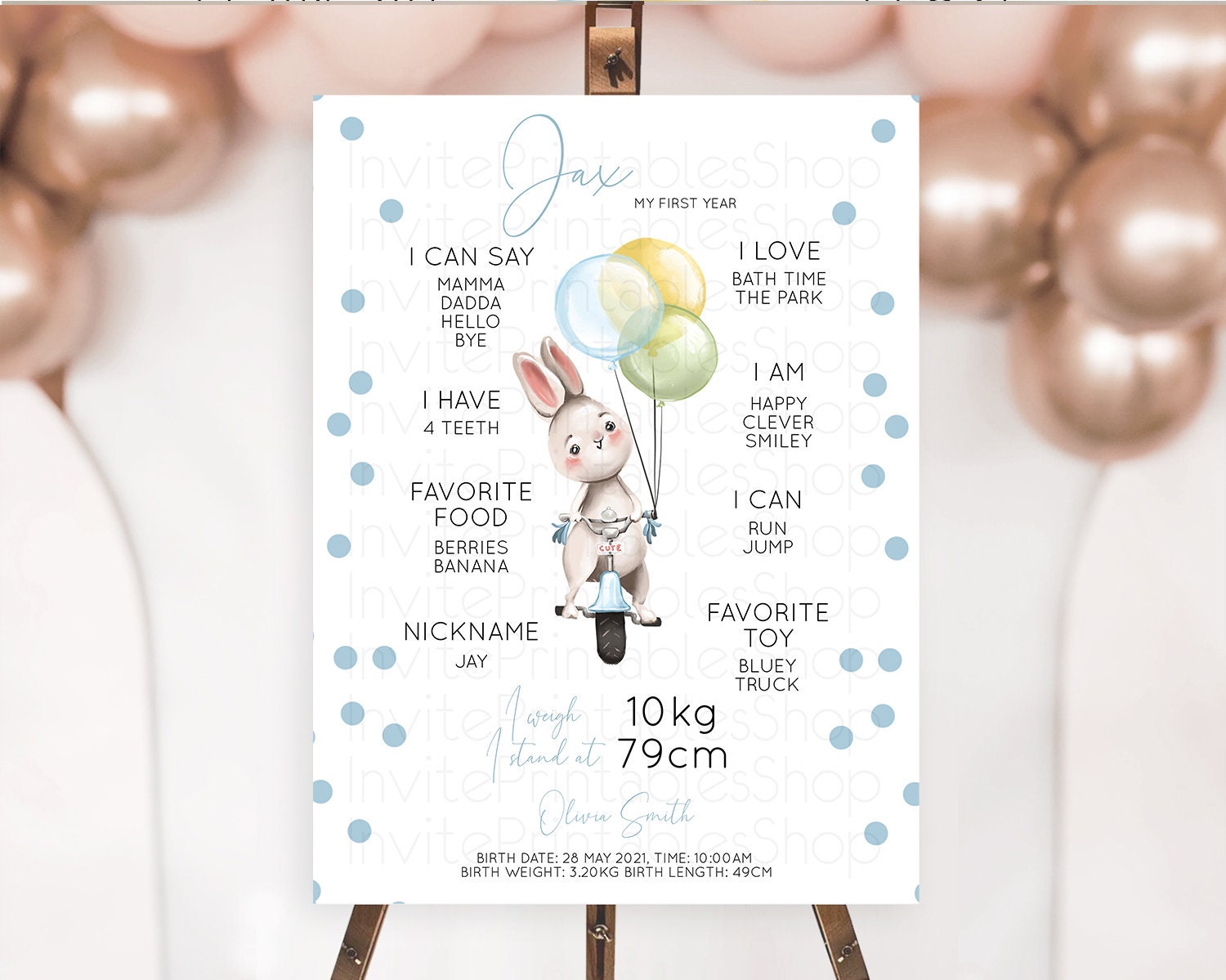 Bunny First Birthday Milestone Board Bunny Balloon Milestone Poster Colorful Pastel Confetti Bunny First Birthday Welcome Sign D10783