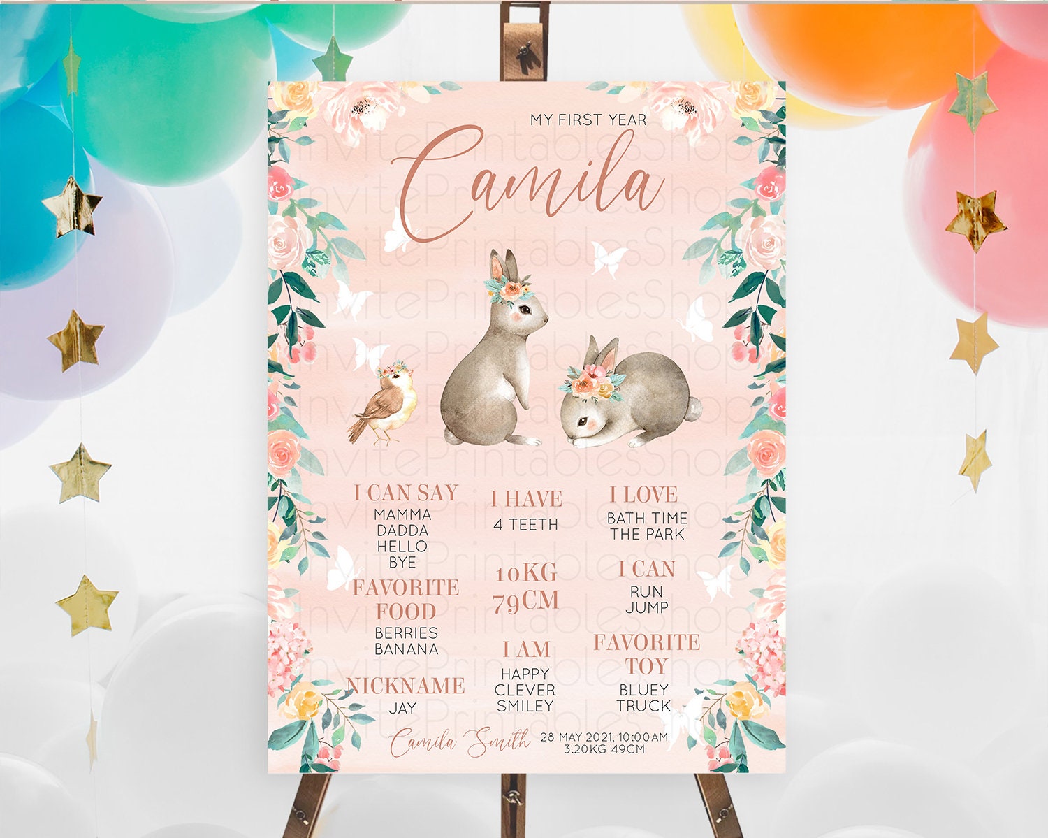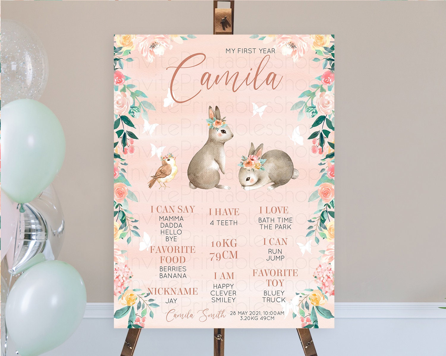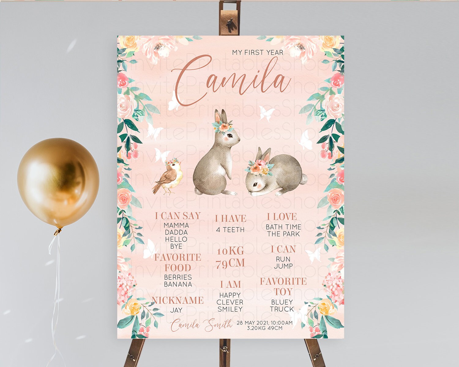 Bunny First Birthday Milestone Board Floral Bunny Milestone Poster Pastel Flowers Woodland Bunny Milestone 1st Birthday Welcome Sign D10922