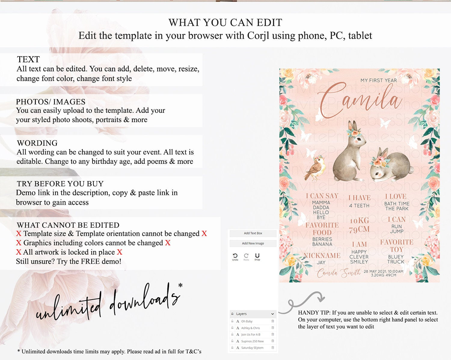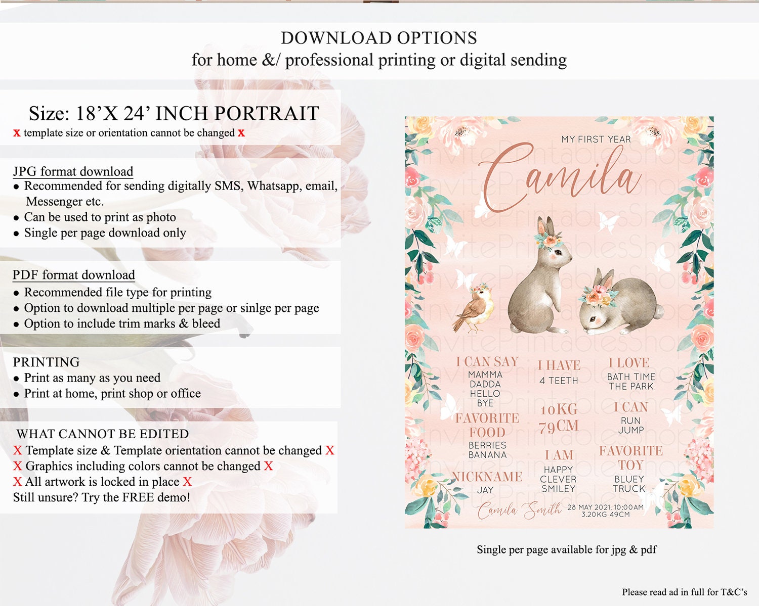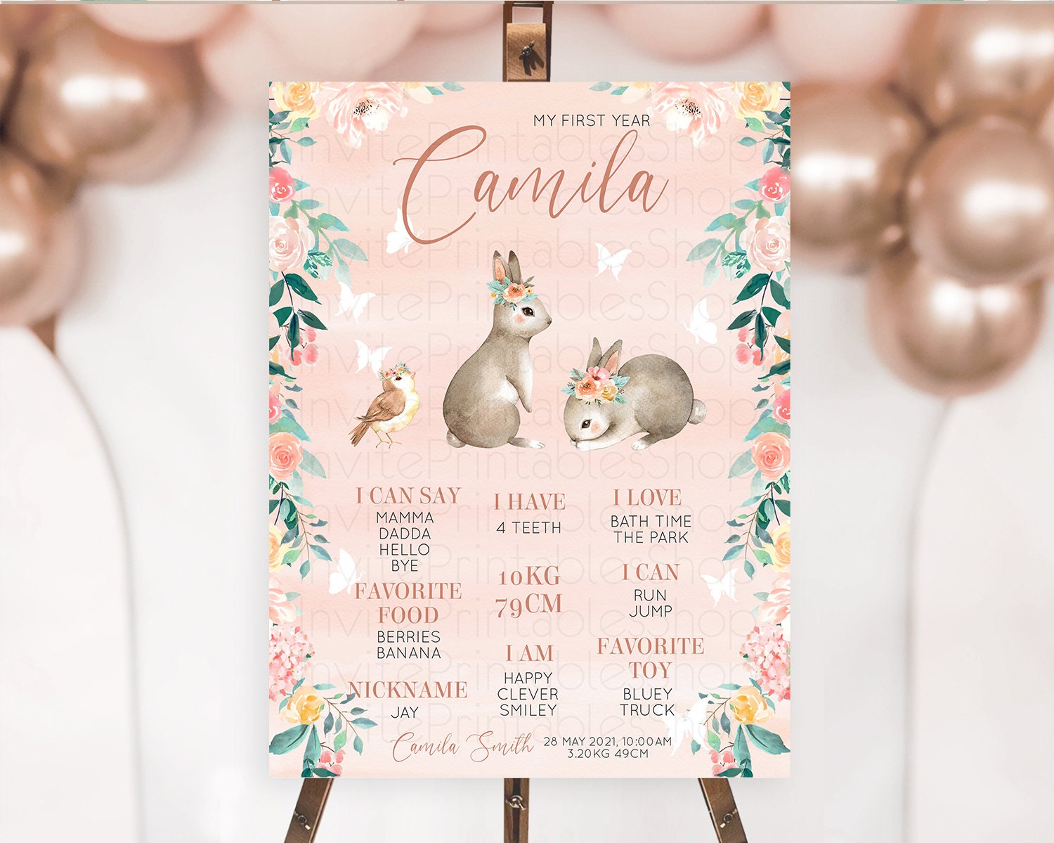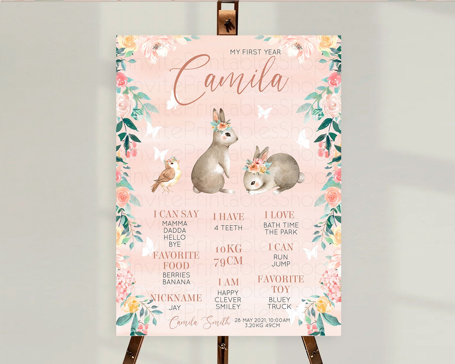 Bunny First Birthday Milestone Board Floral Bunny Milestone Poster Pastel Flowers Woodland Bunny Milestone 1st Birthday Welcome Sign D10922