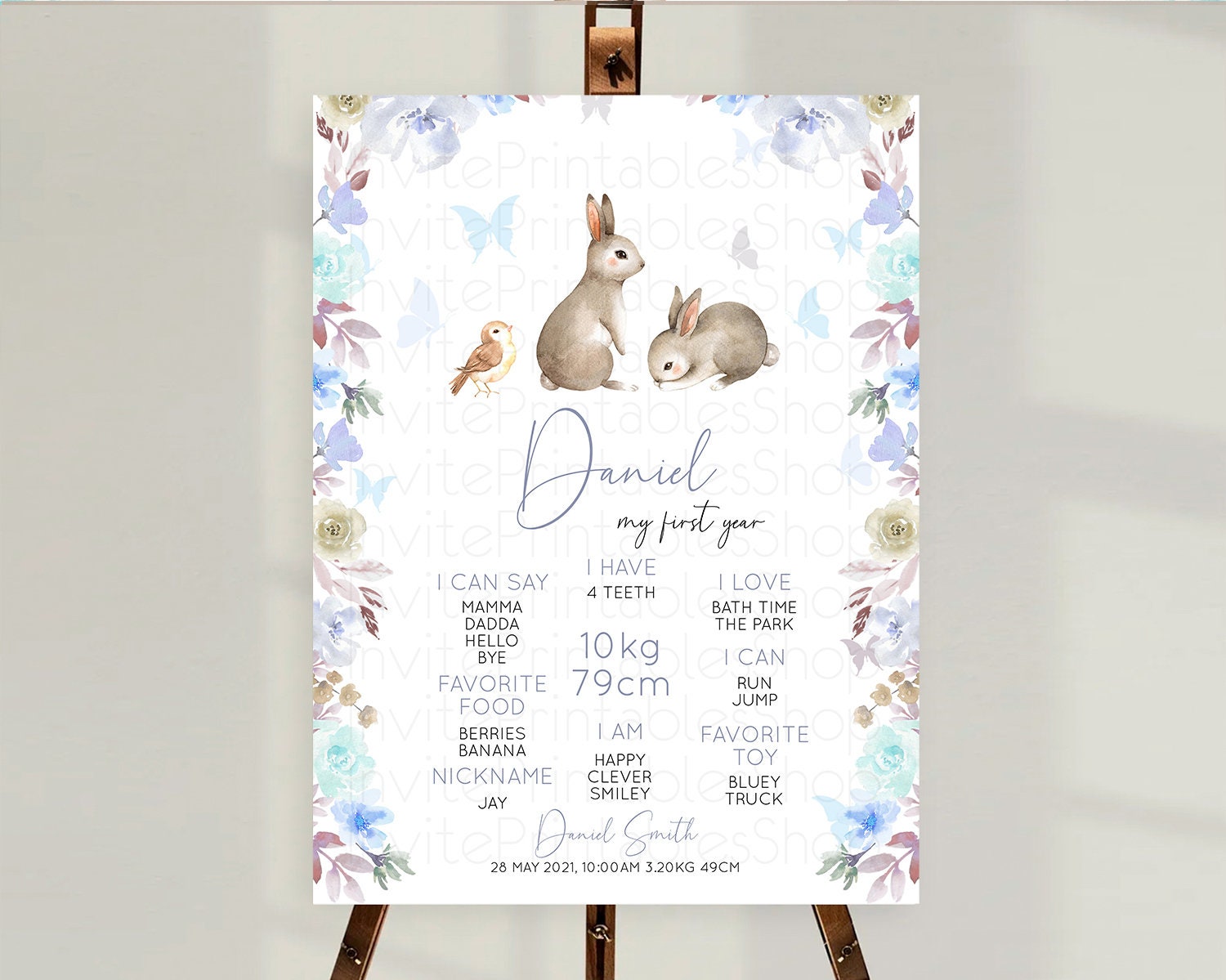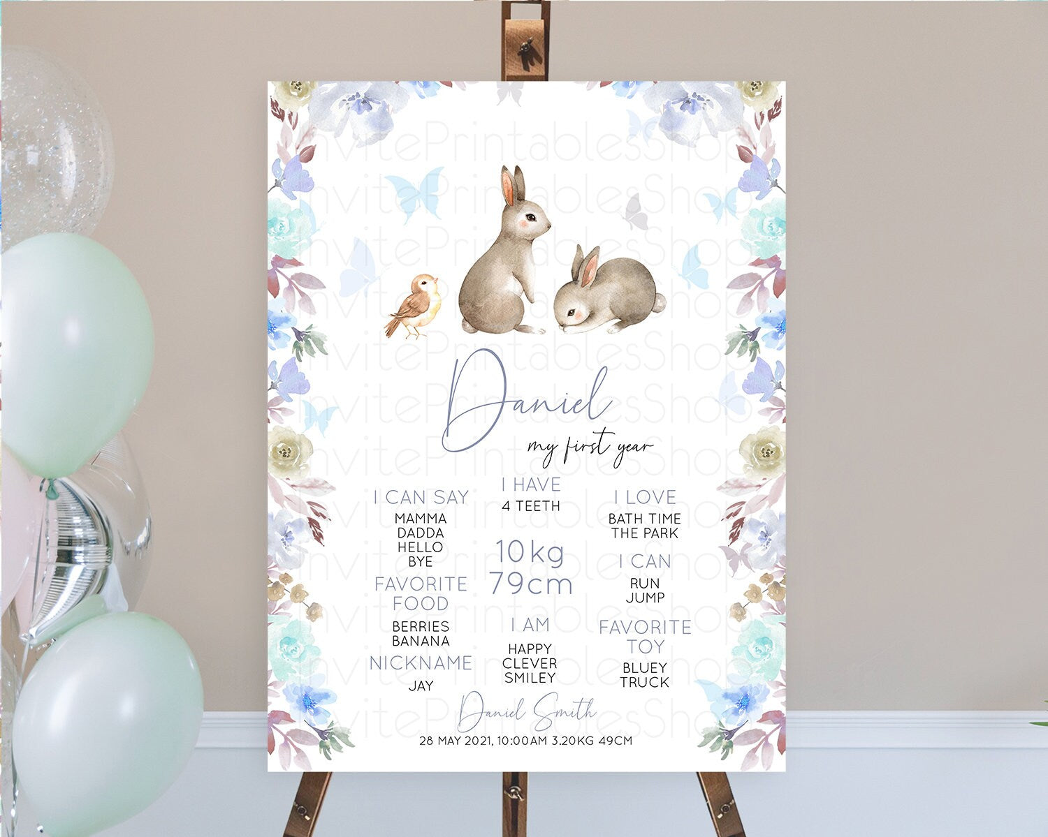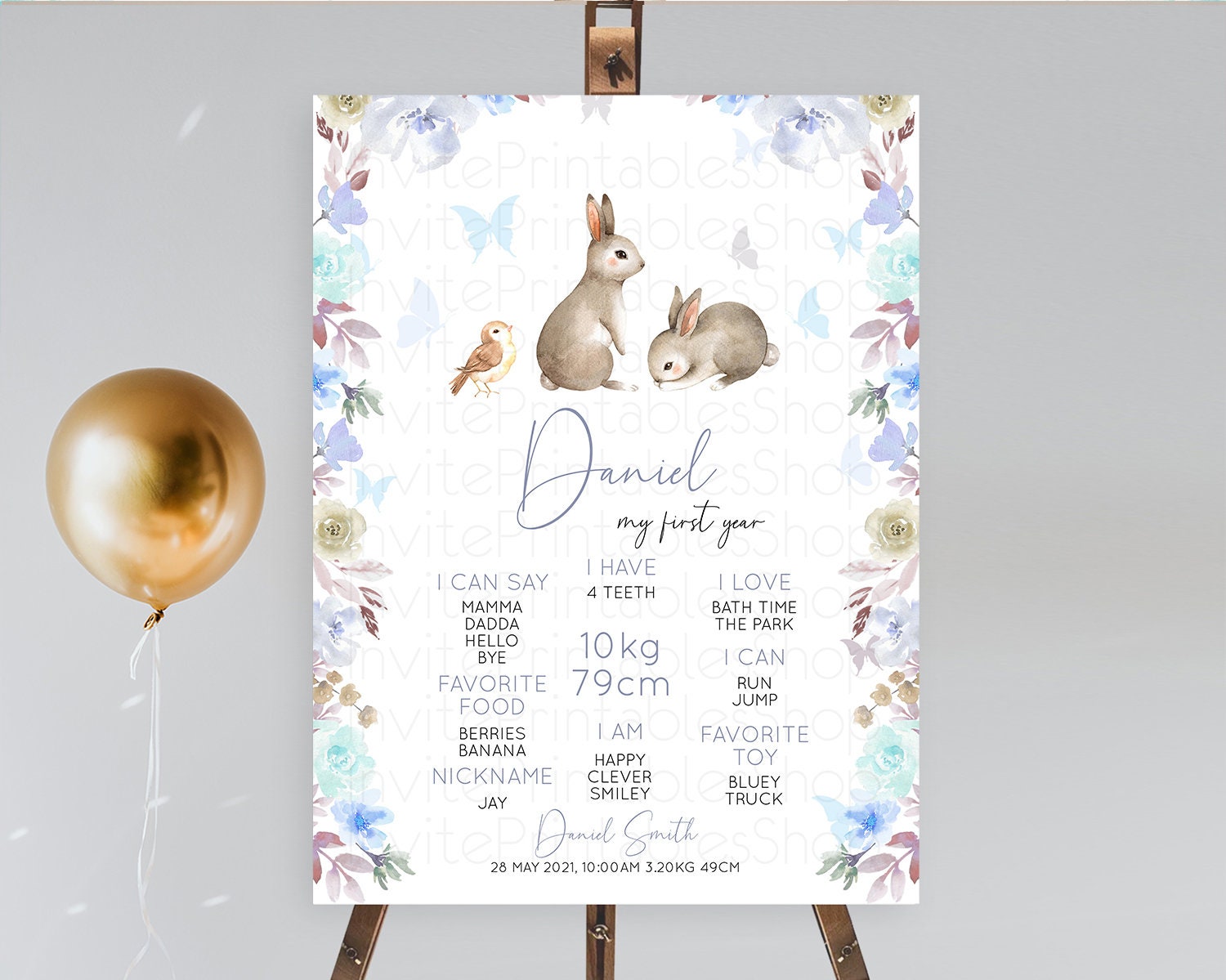 Bunny First Birthday Milestone Board Floral Bunny Milestone Poster Pastel Flowers Woodland Bunny Milestone 1st Birthday Welcome Sign D10927