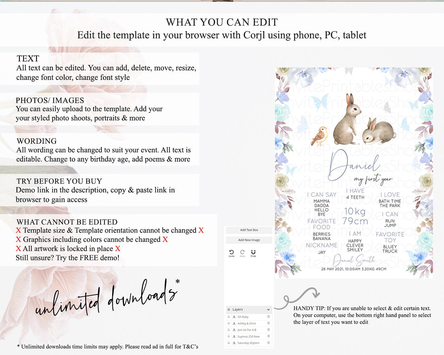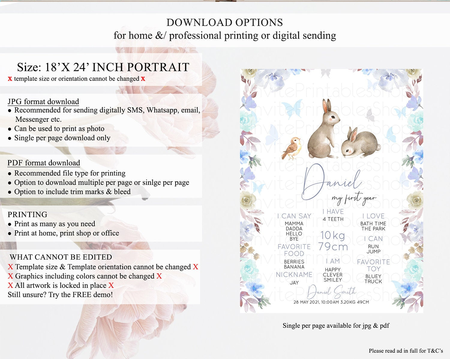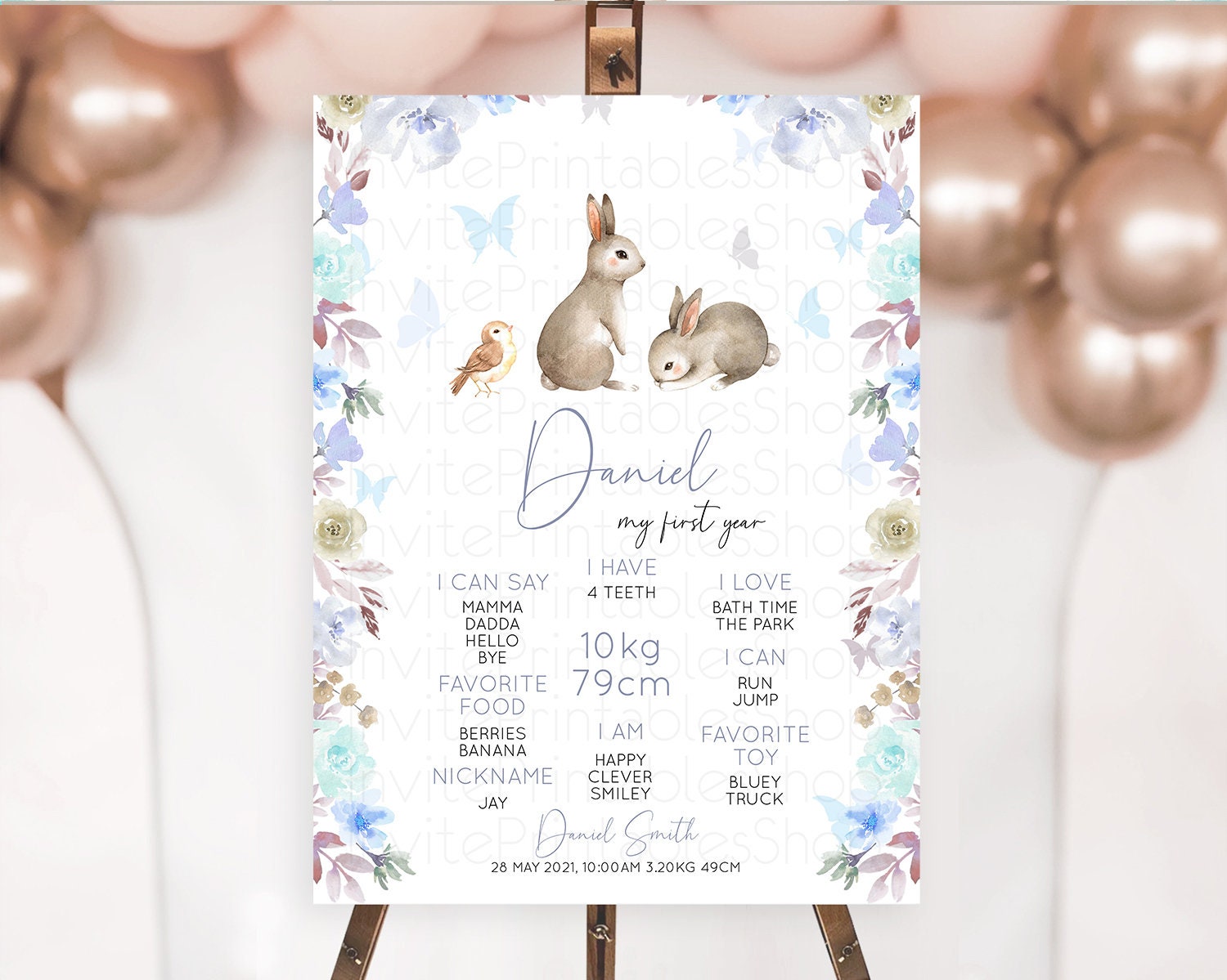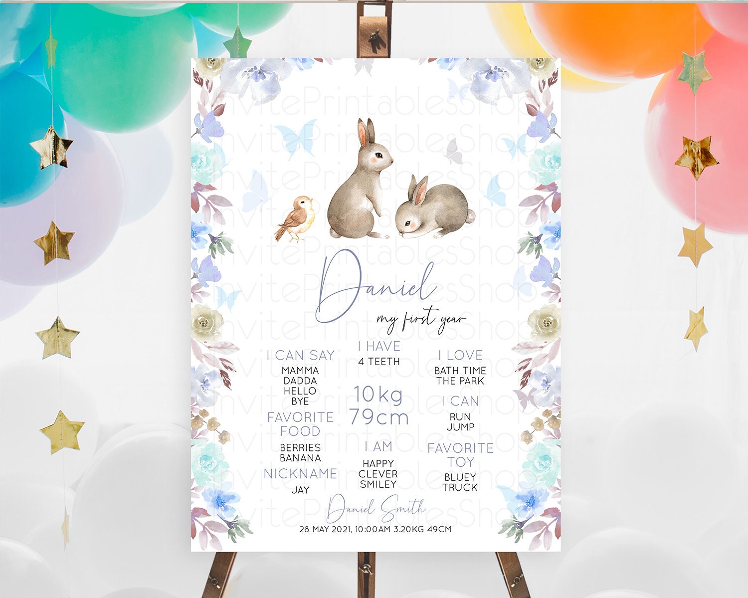 Bunny First Birthday Milestone Board Floral Bunny Milestone Poster Pastel Flowers Woodland Bunny Milestone 1st Birthday Welcome Sign D10927
