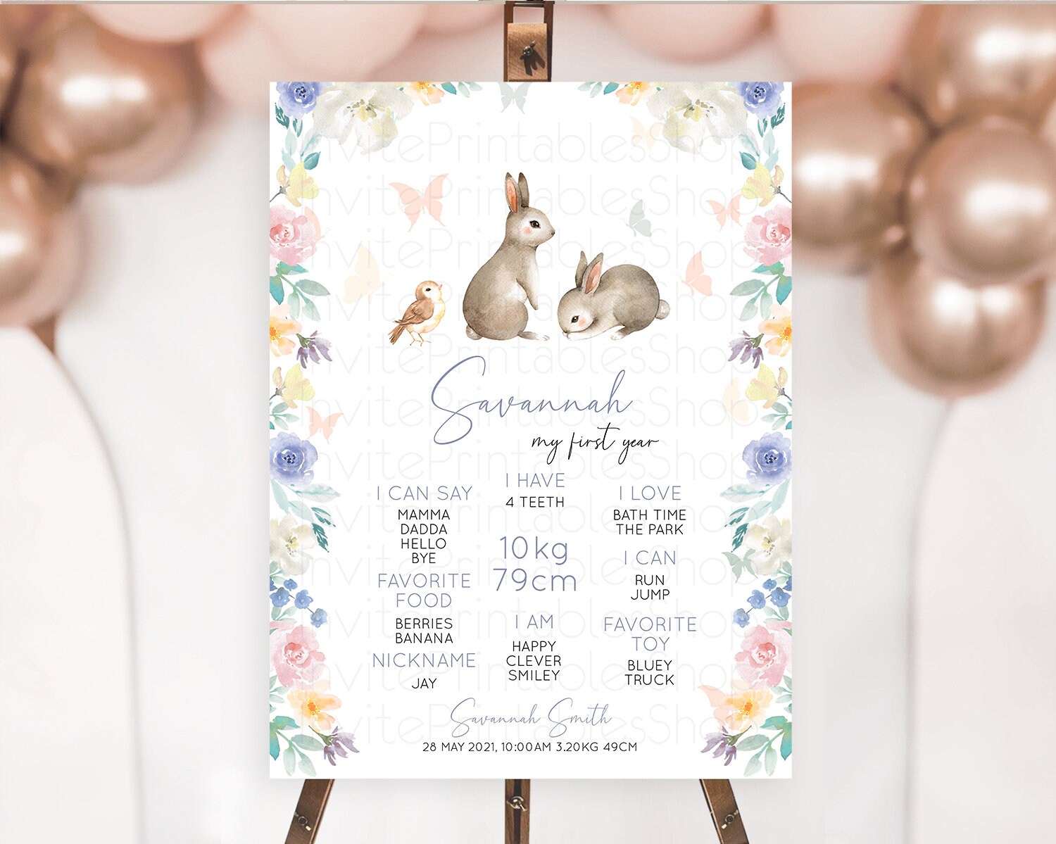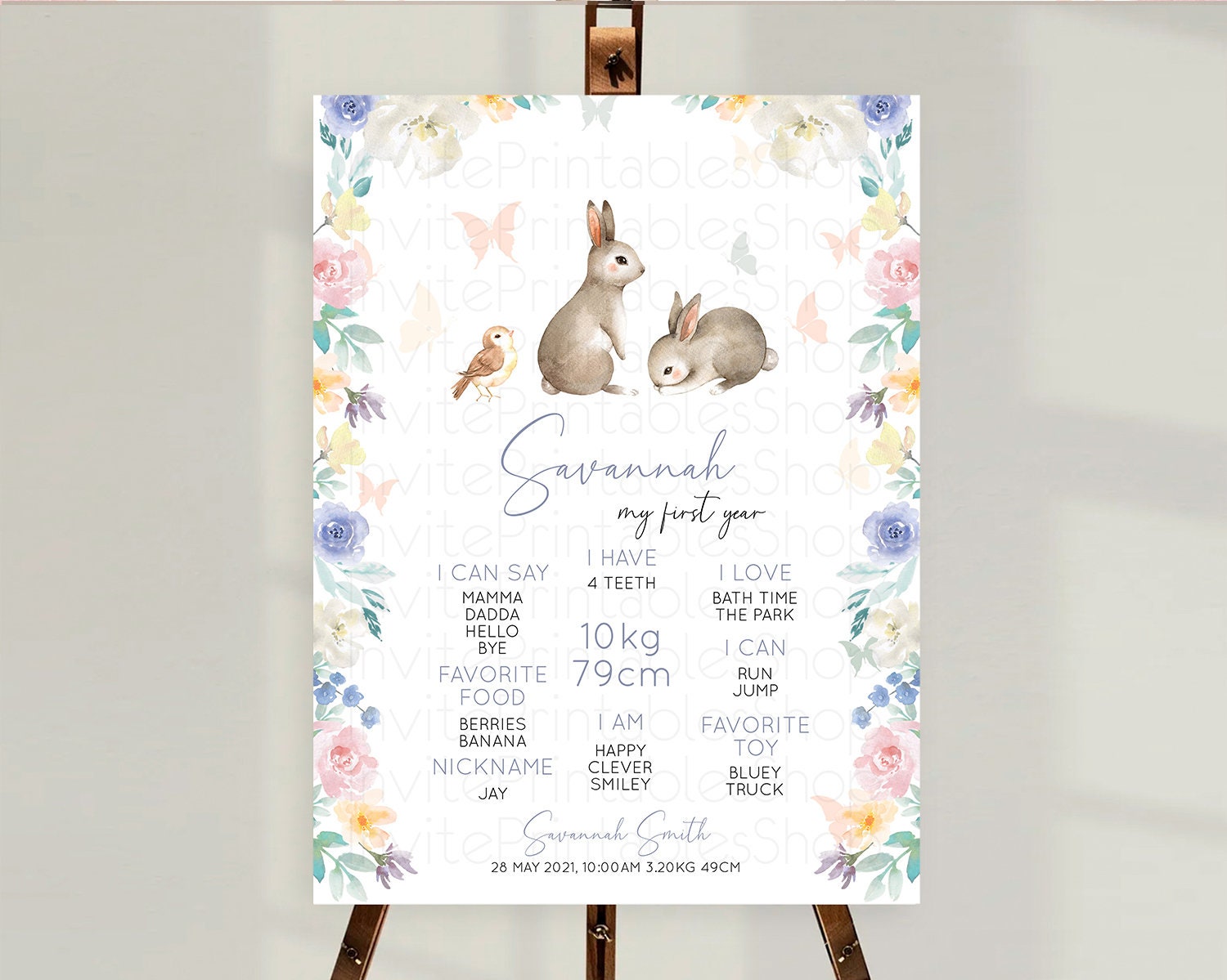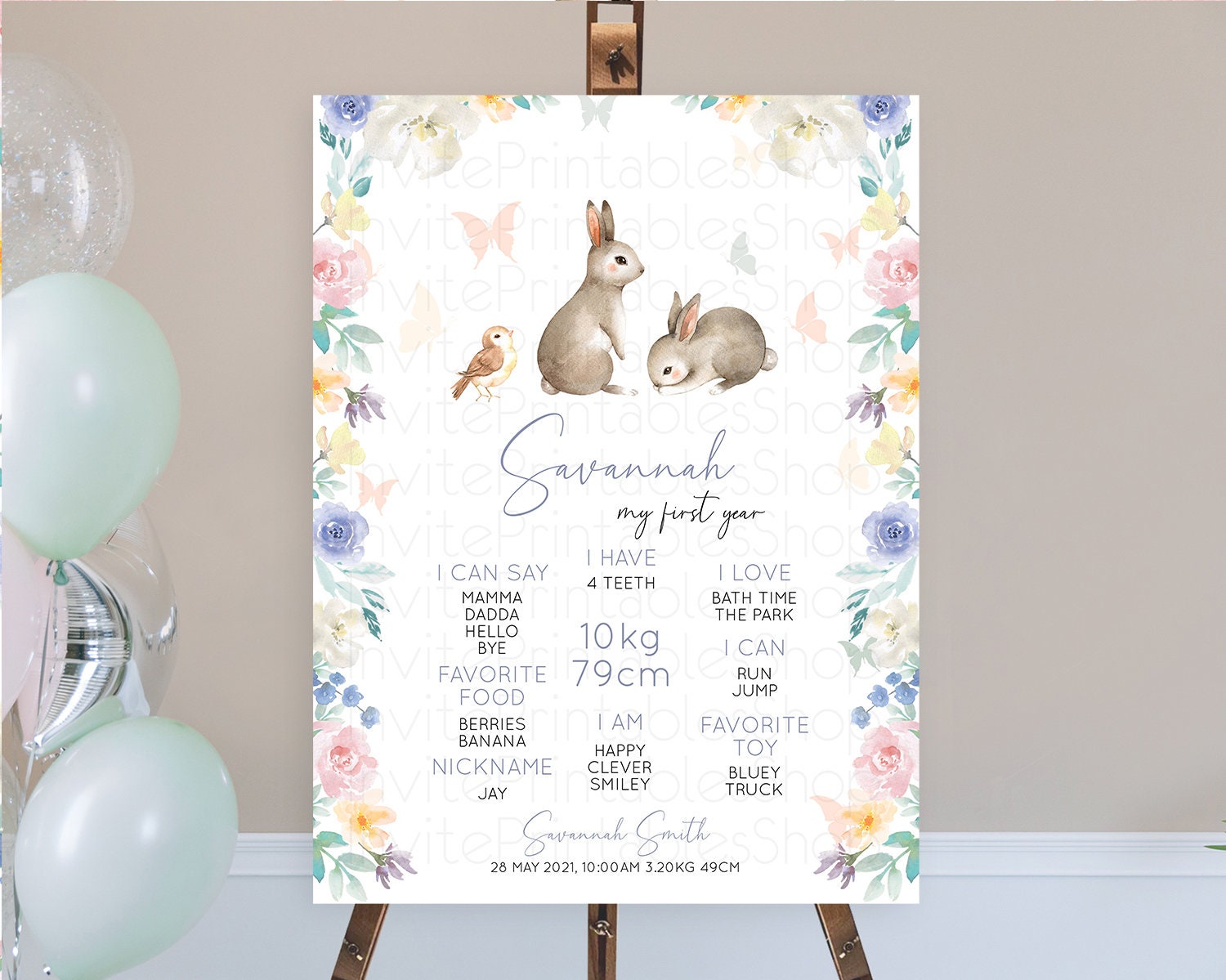 Bunny First Birthday Milestone Board Floral Bunny Milestone Poster Pastel Flowers Woodland Bunny Milestone 1st Birthday Welcome Sign D10928