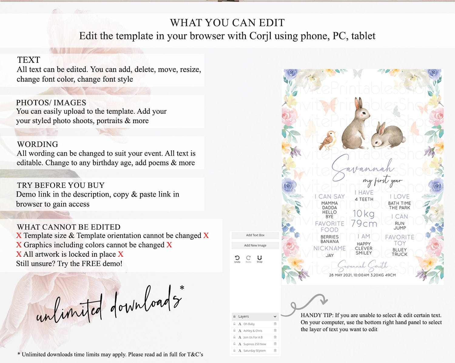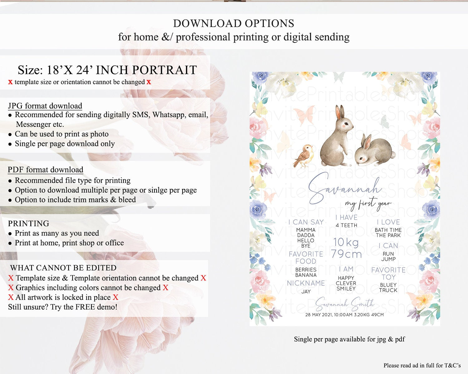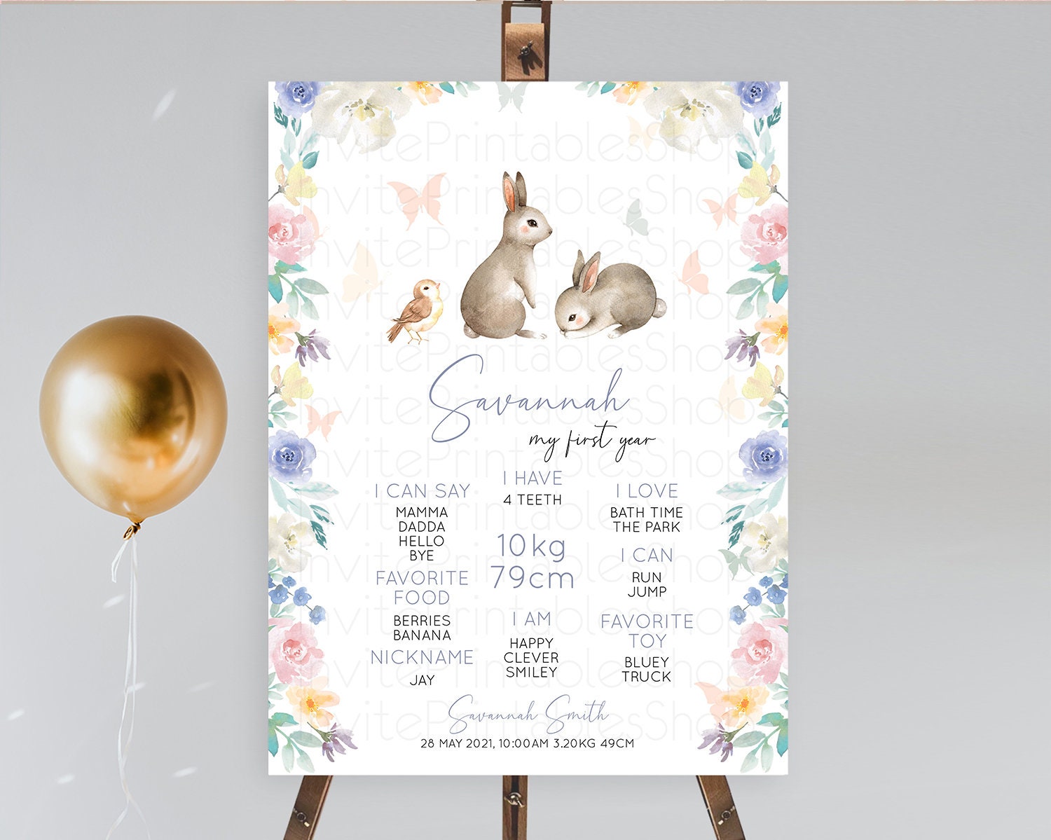 Bunny First Birthday Milestone Board Floral Bunny Milestone Poster Pastel Flowers Woodland Bunny Milestone 1st Birthday Welcome Sign D10928