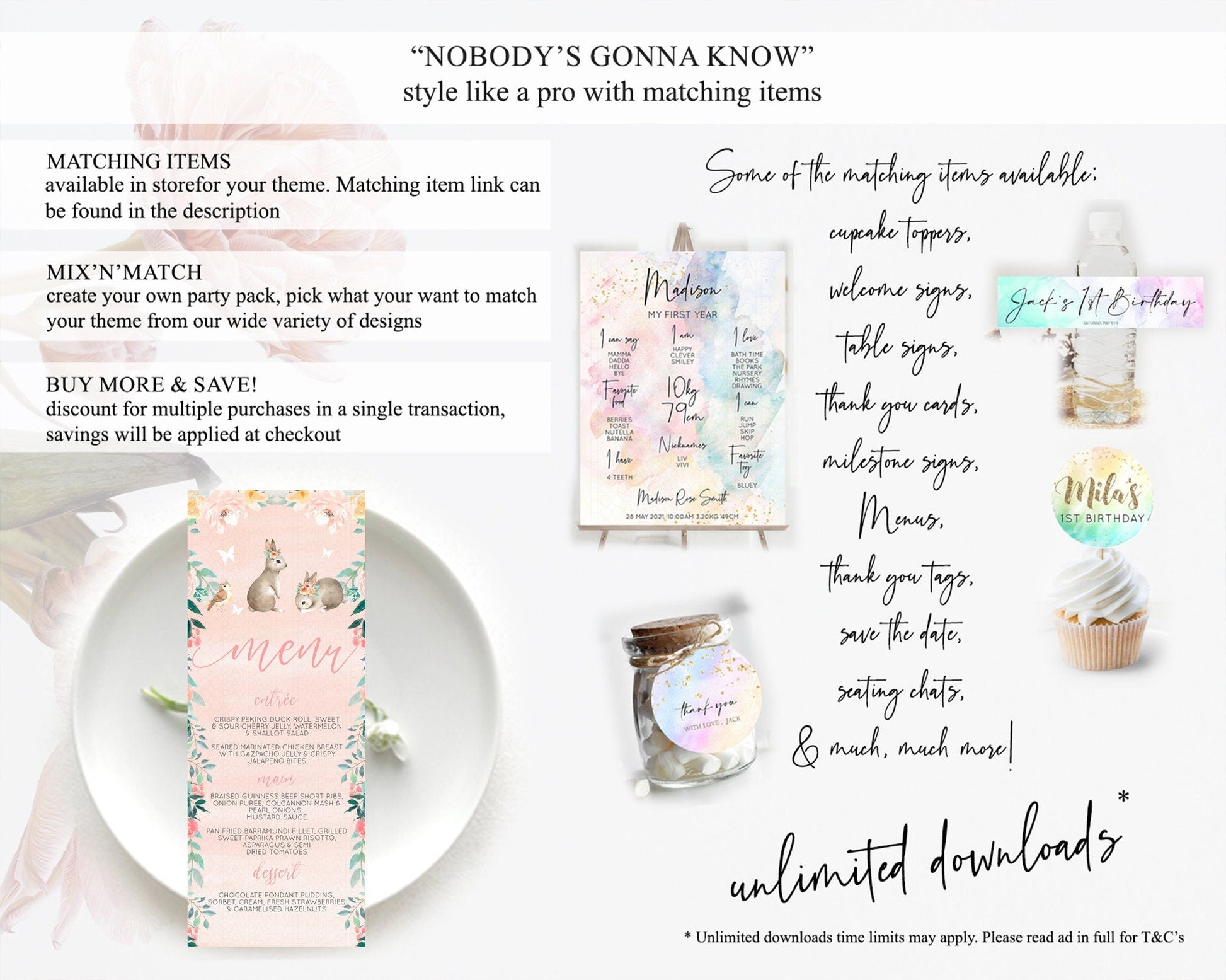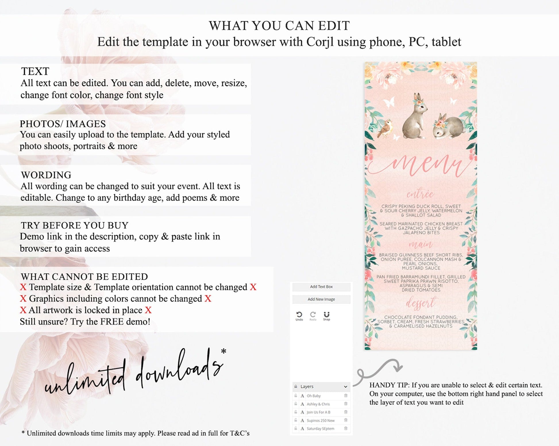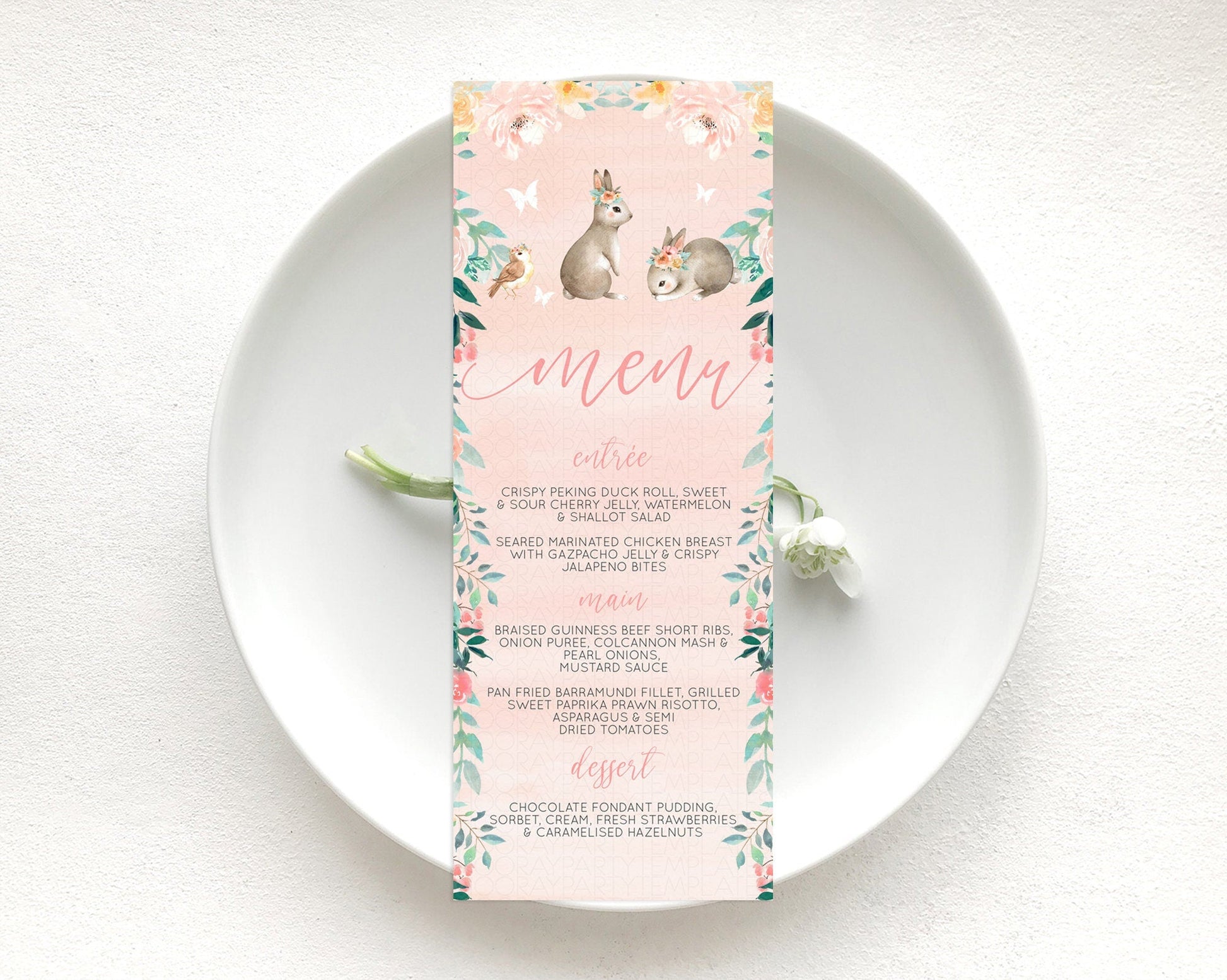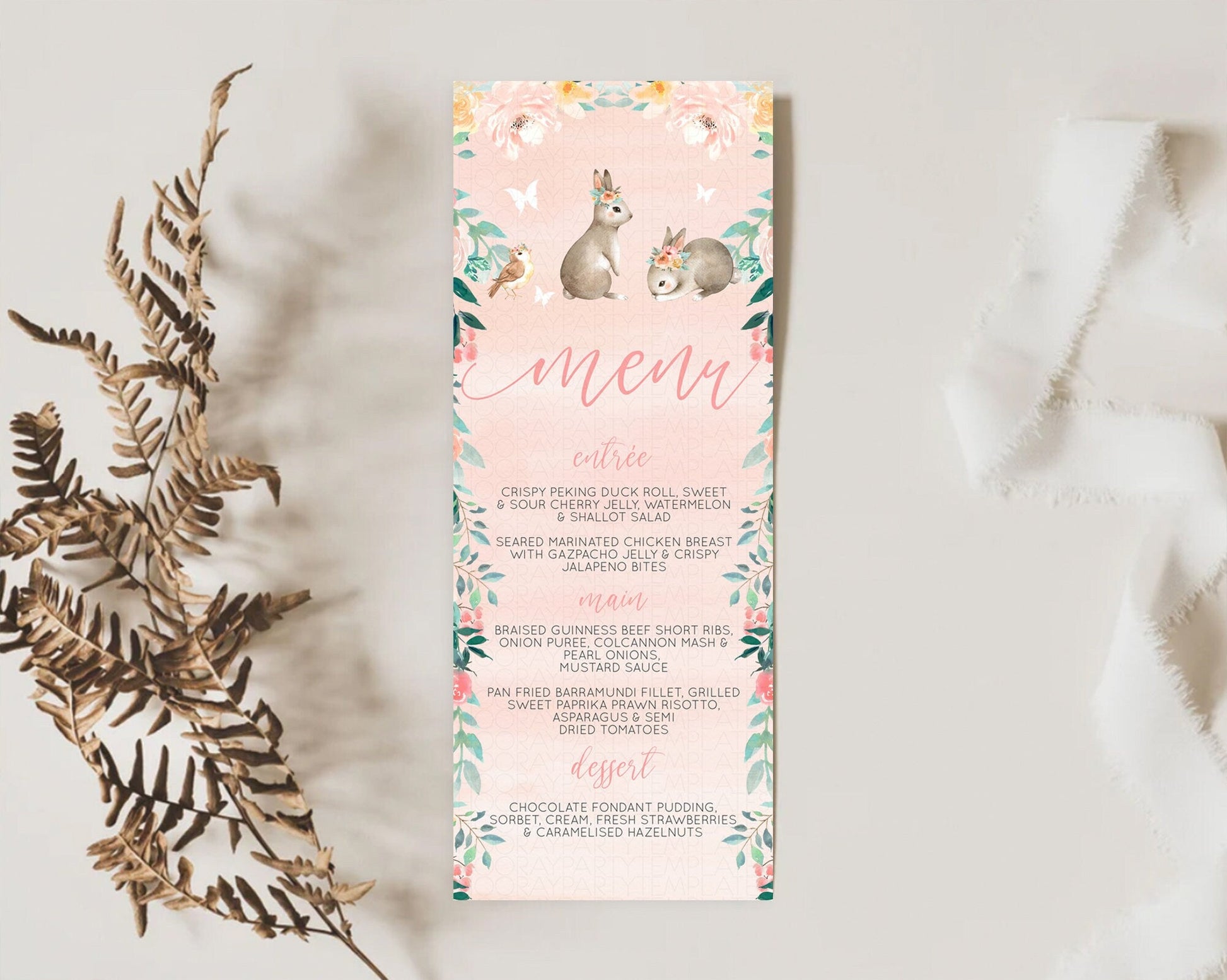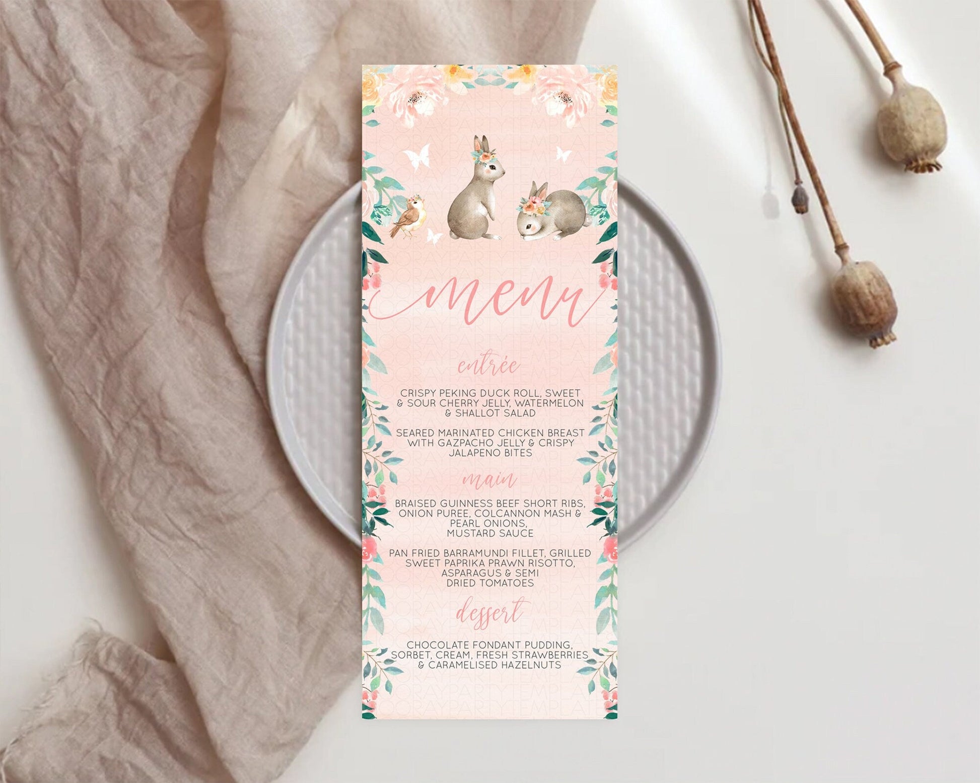 Bunny Menu Floral Bunny Menu Template Pastel Flowers Bunny Table Decor Secret Garden Bunny Dinner Dessert Menu Party Food Menu D10922