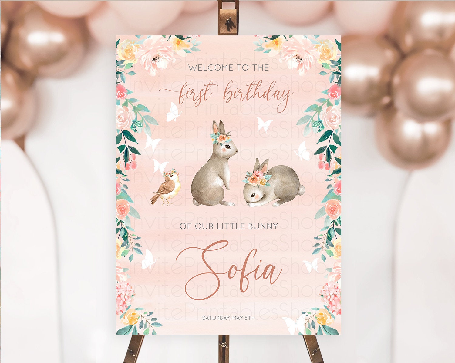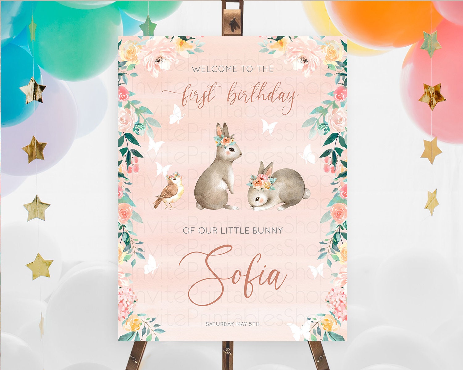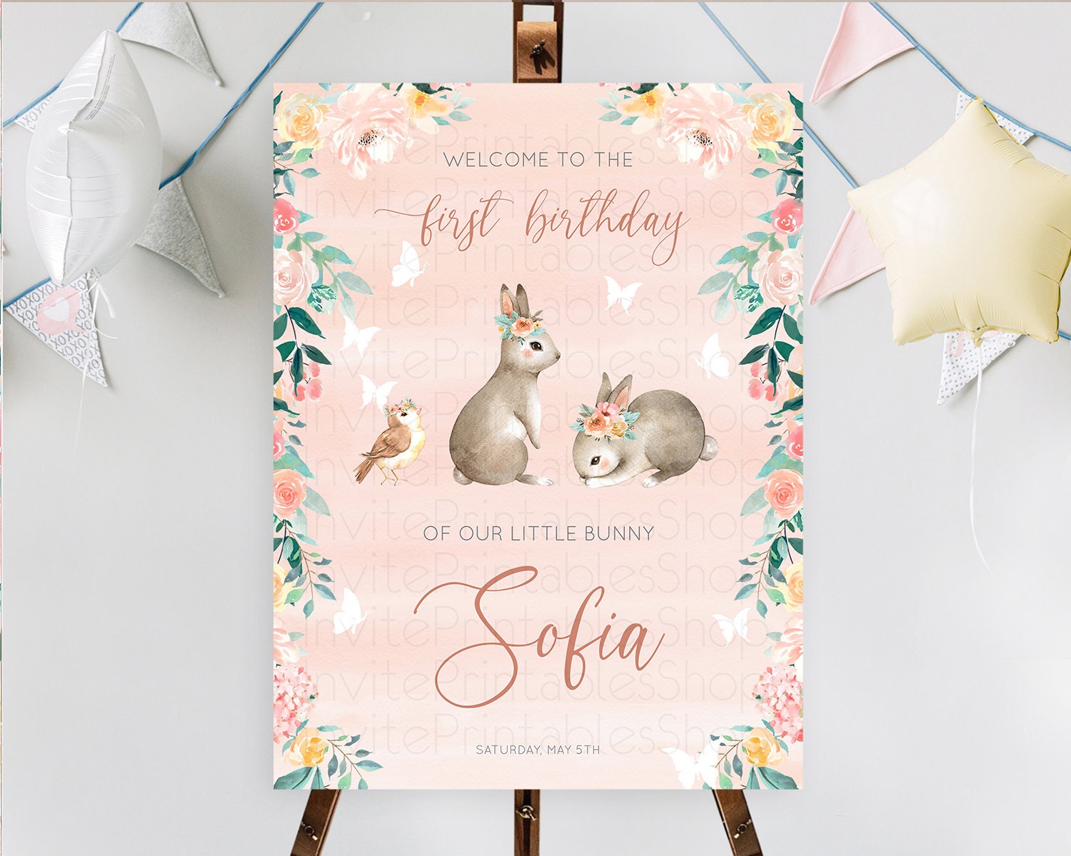 Bunny Welcome Sign Floral Bunny Welcome Board Pastel Flowers Woodland Bunny Welcome Poster Forest Bunny First Birthday Welcome Sign D10922