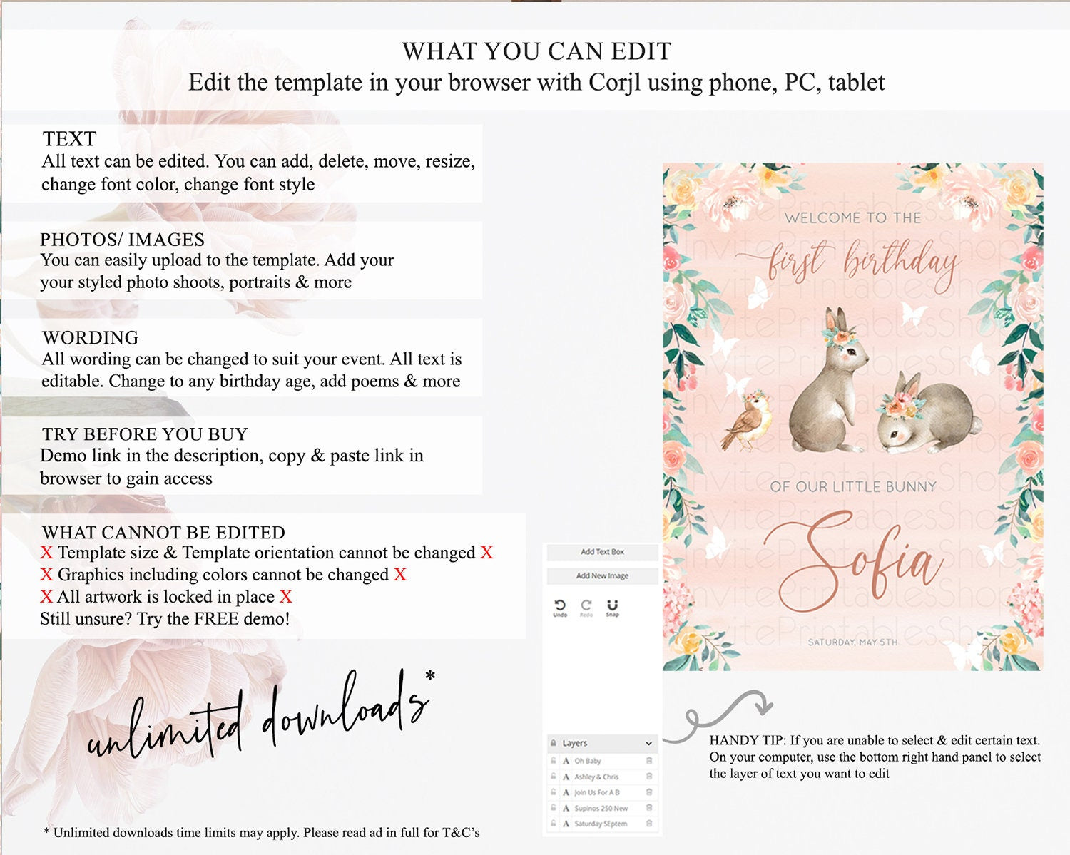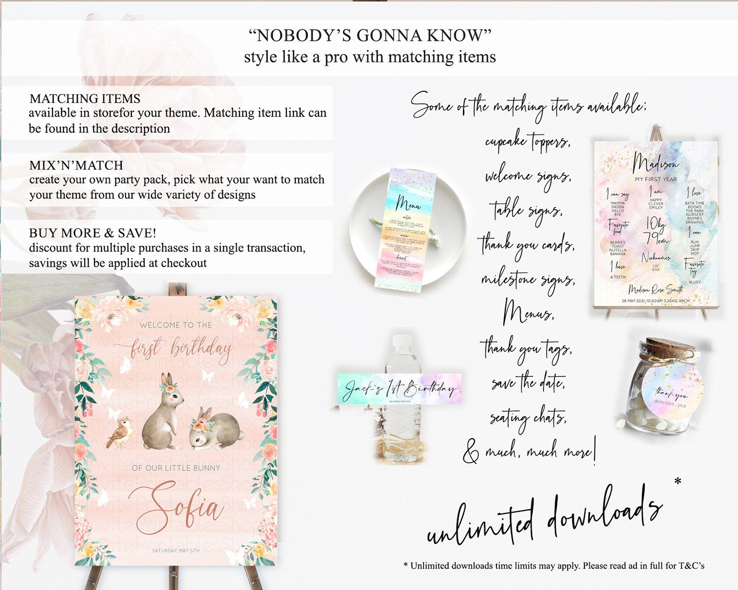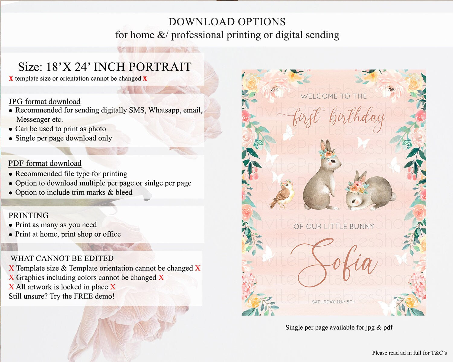 Bunny Welcome Sign Floral Bunny Welcome Board Pastel Flowers Woodland Bunny Welcome Poster Forest Bunny First Birthday Welcome Sign D10922