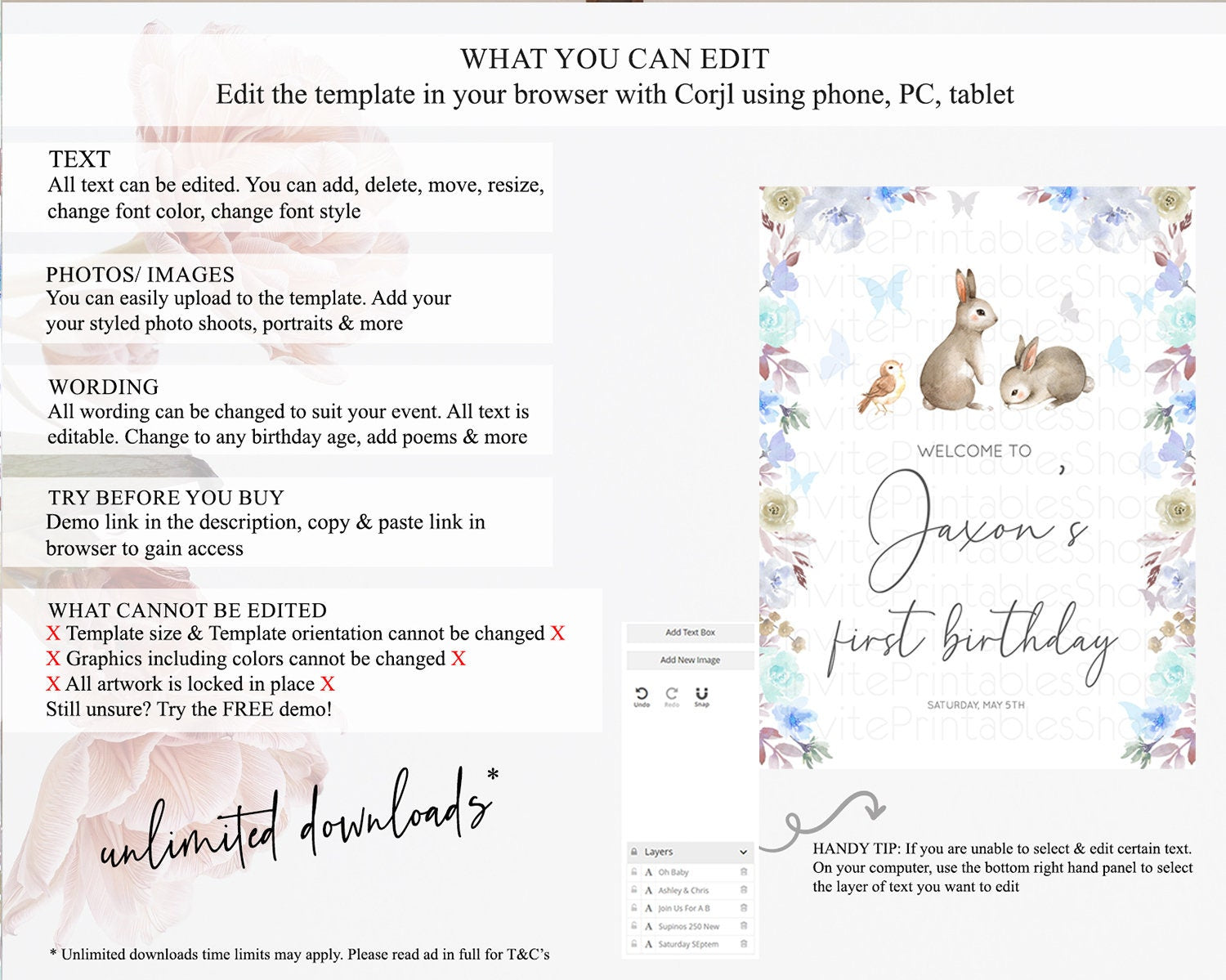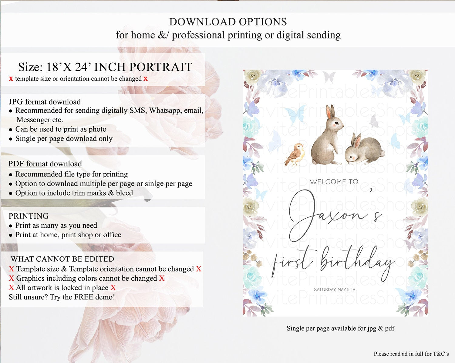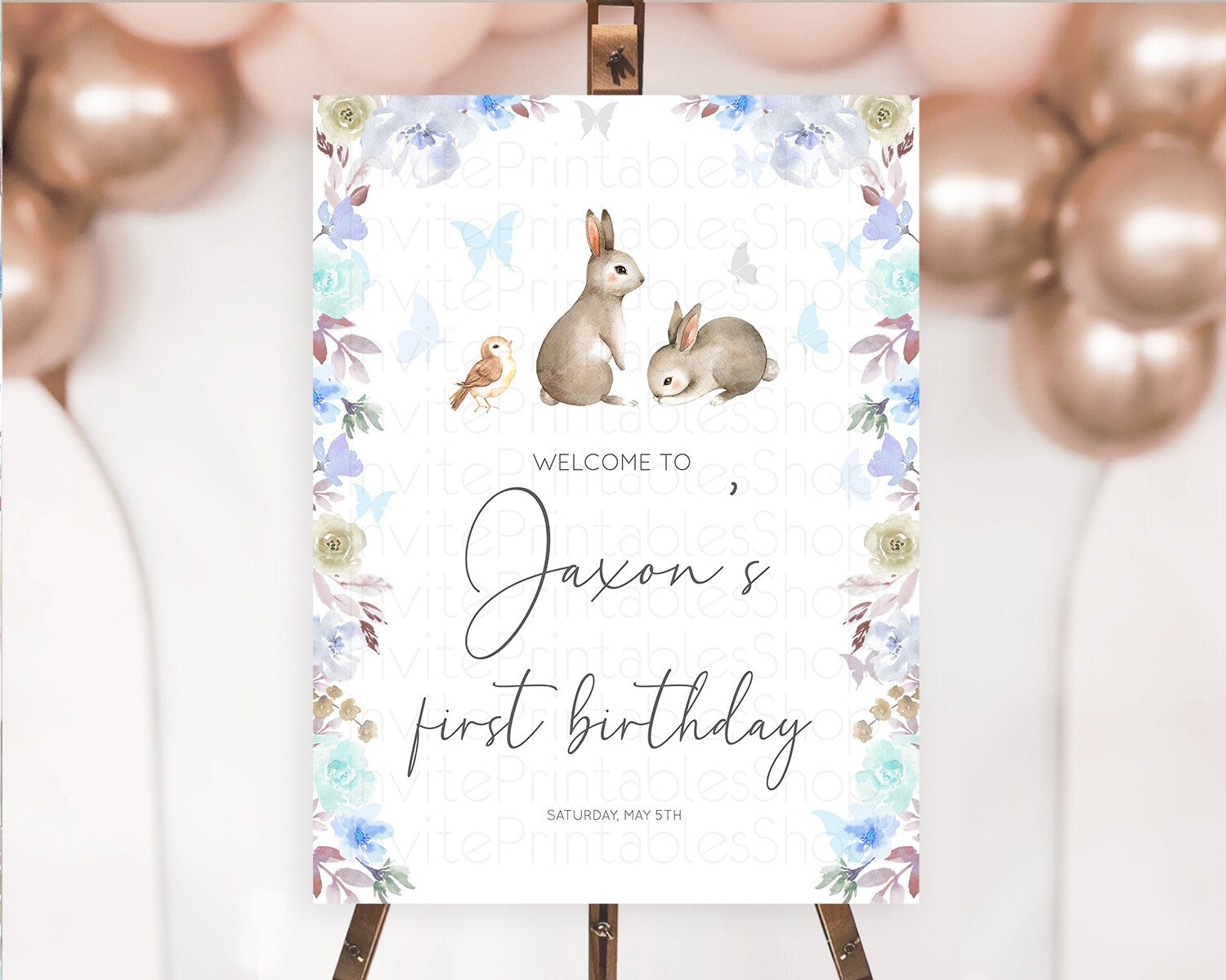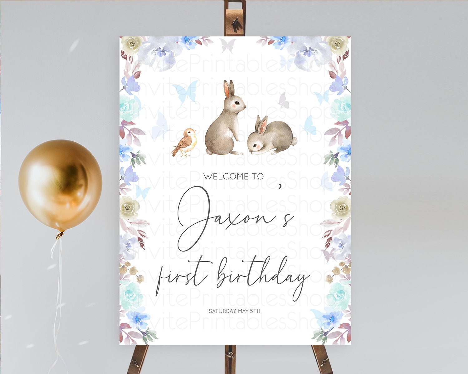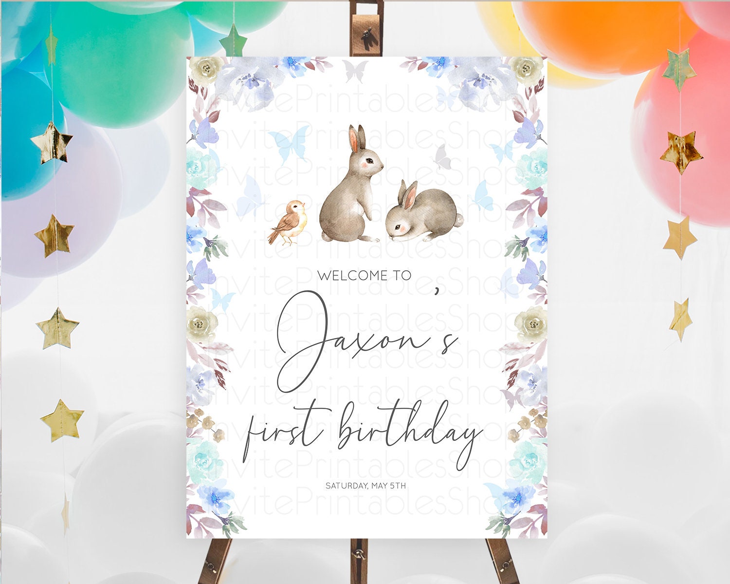 Bunny Welcome Sign Floral Bunny Welcome Board Pastel Flowers Woodland Bunny Welcome Poster Forest Bunny First Birthday Welcome Sign D10927
