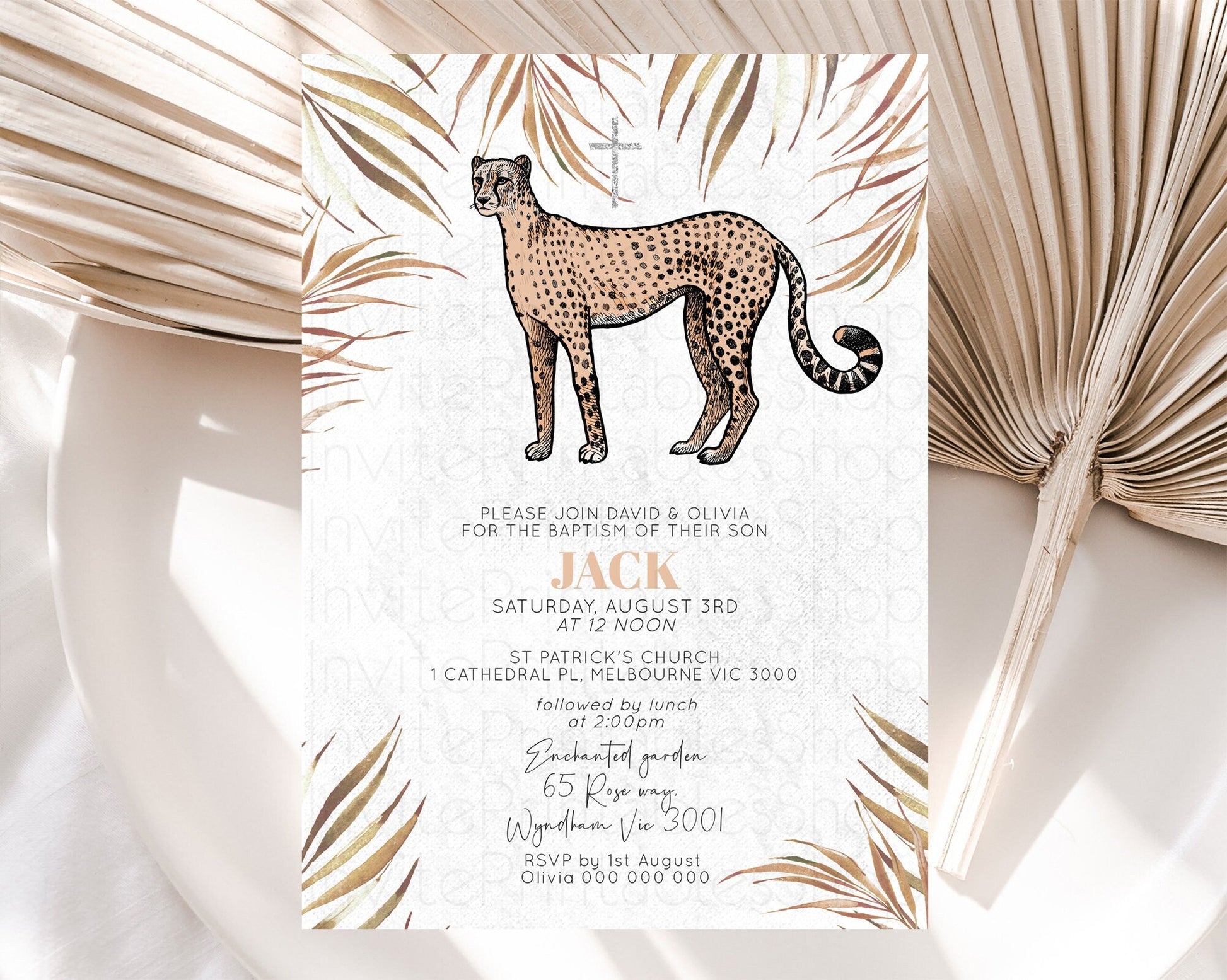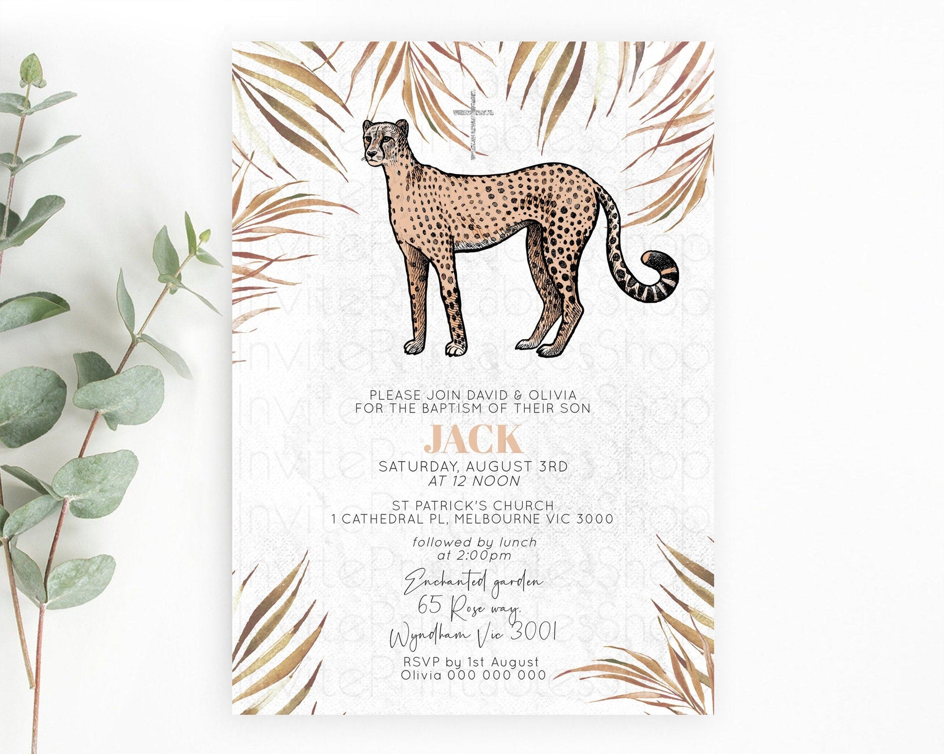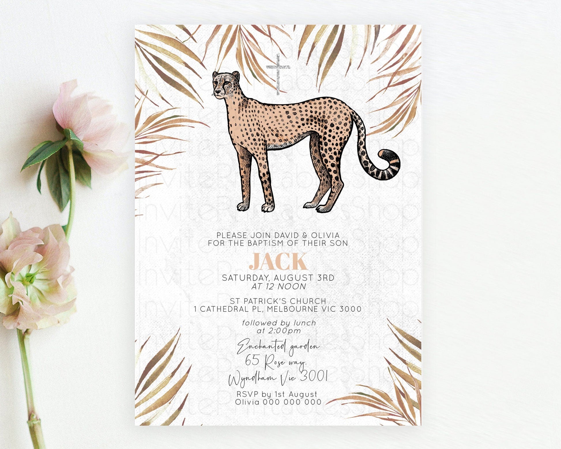 Cheetah Baptism Invitation Cheetah Baptism 1st Birthday Invitation Cheetah Safari Adventure Christening Party Palm Leaf Zoo Cheetah D10291