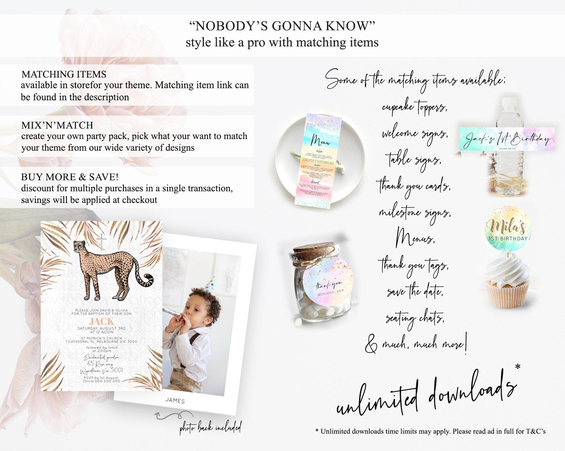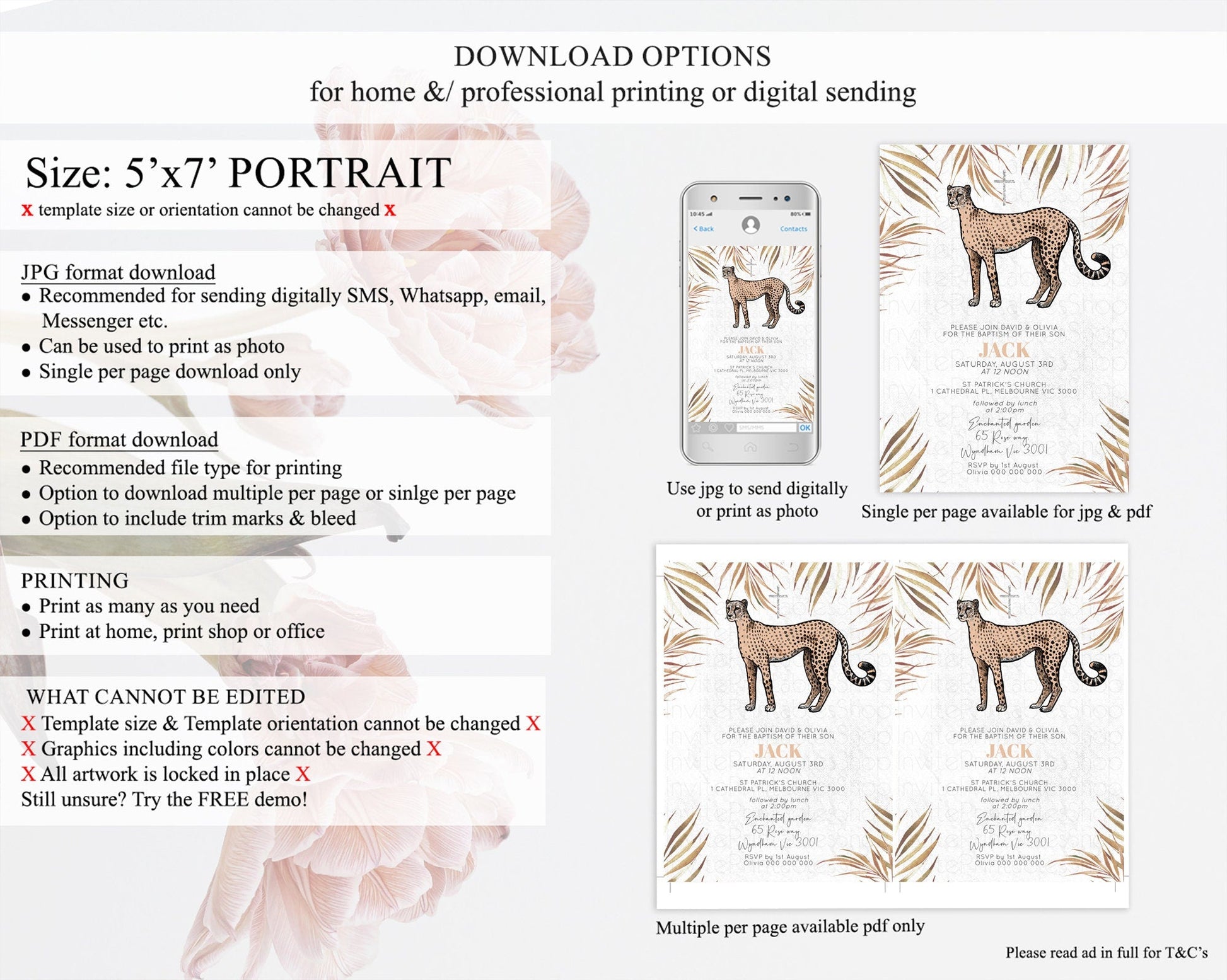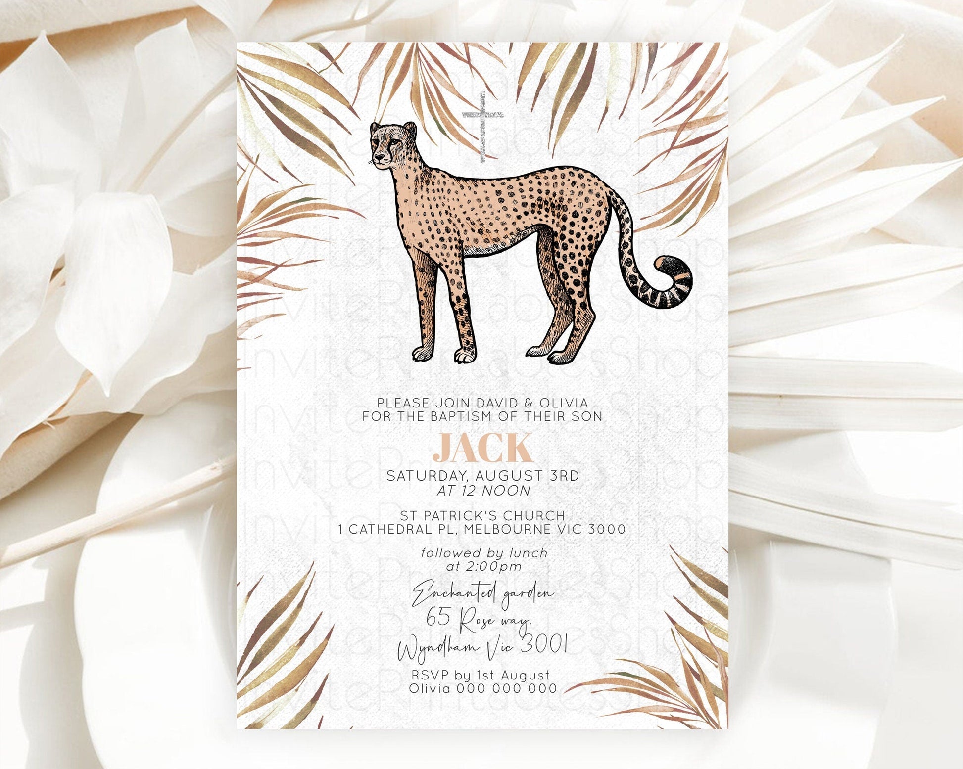 Cheetah Baptism Invitation Cheetah Baptism 1st Birthday Invitation Cheetah Safari Adventure Christening Party Palm Leaf Zoo Cheetah D10291