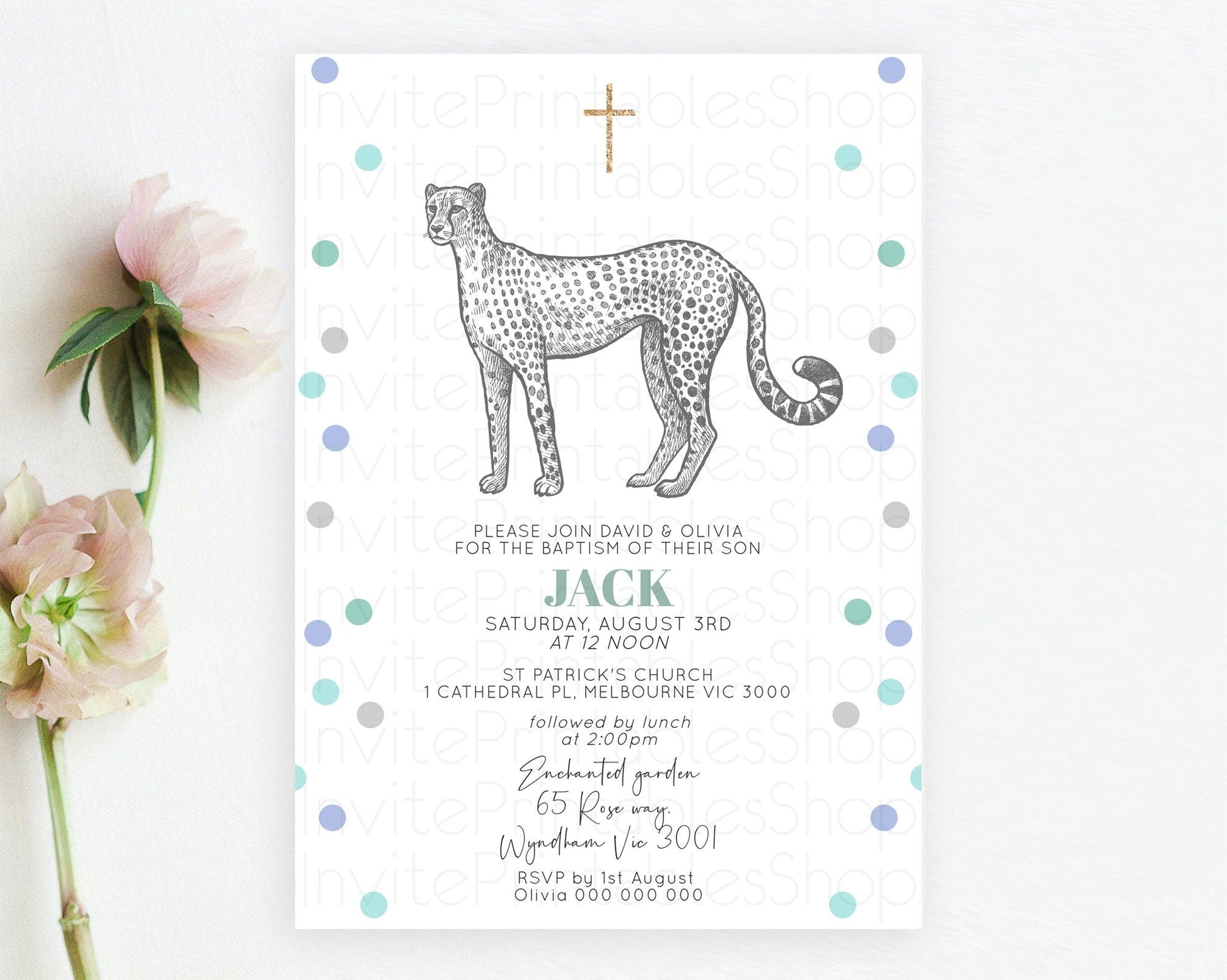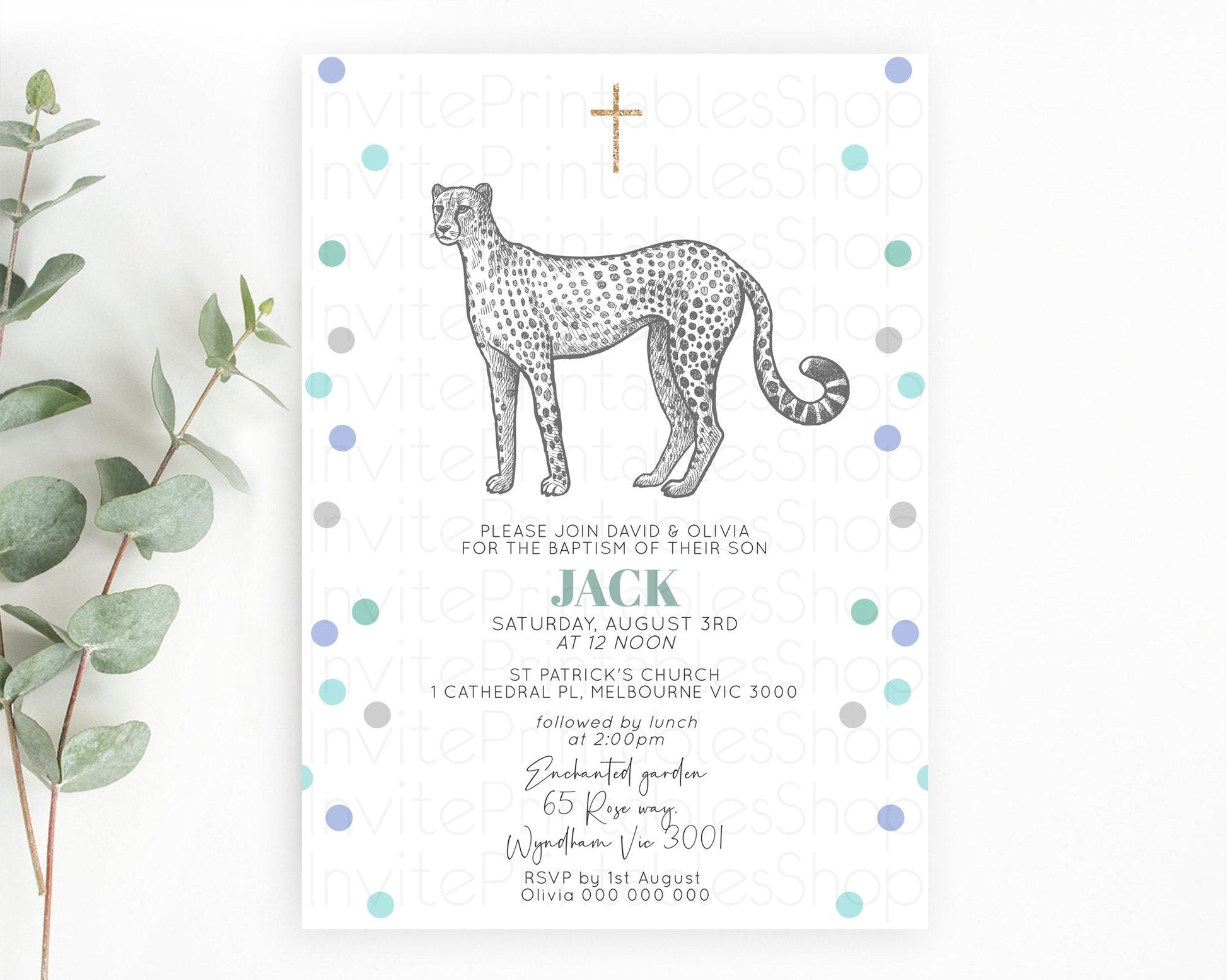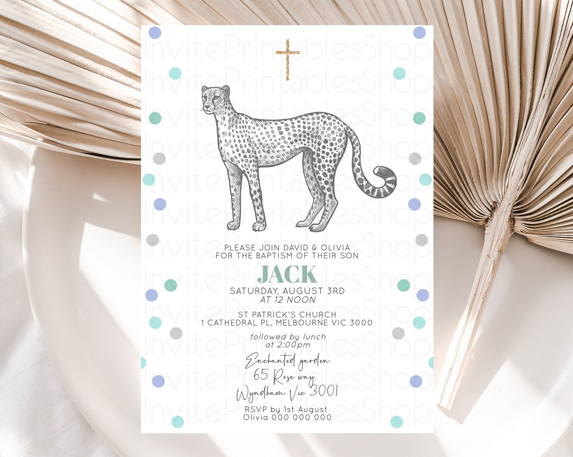 Cheetah Baptism Invitation Cheetah Baptism 1st Birthday Invitation Cheetah Safari Adventure Christening Party Palm Leaf Zoo Cheetah D10857