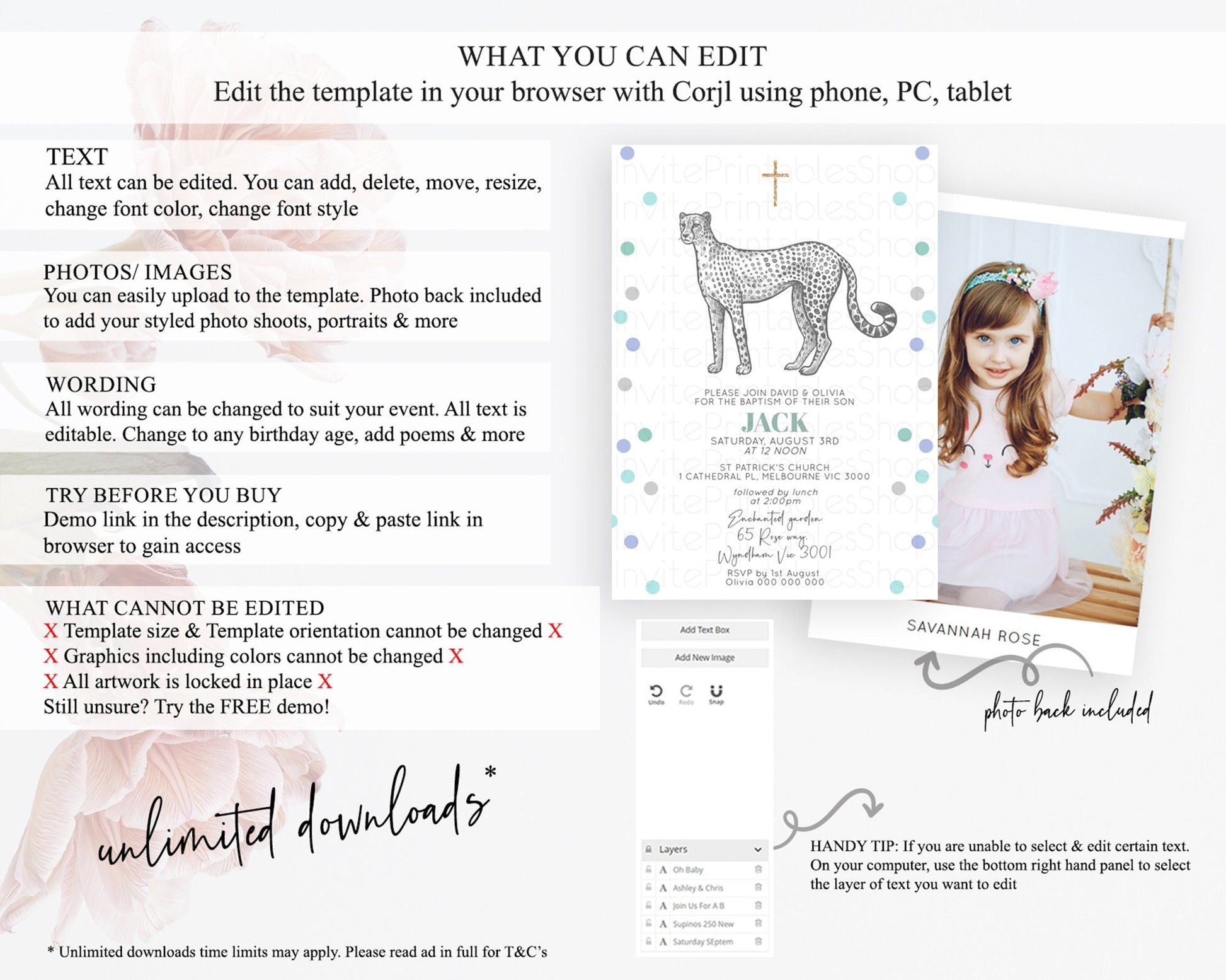 • Template size & orientation cannot be changed. Please use the demo link to confirm this product suits your needs.