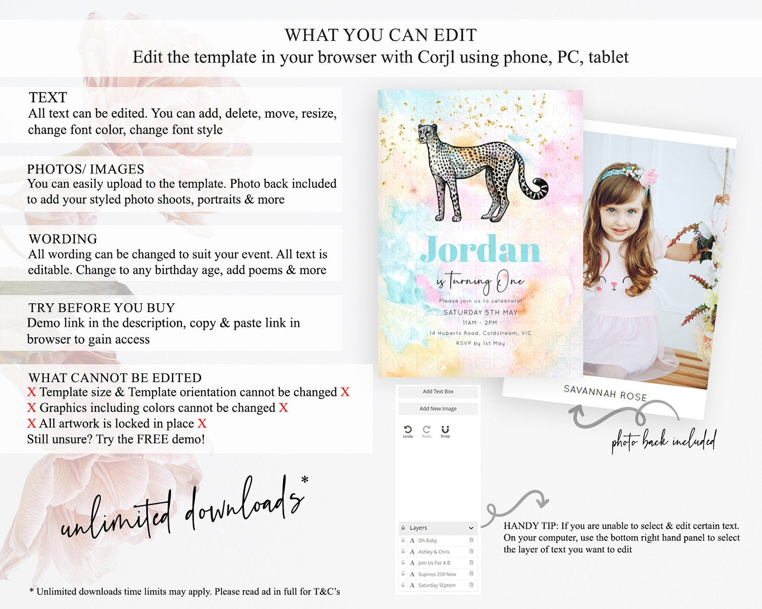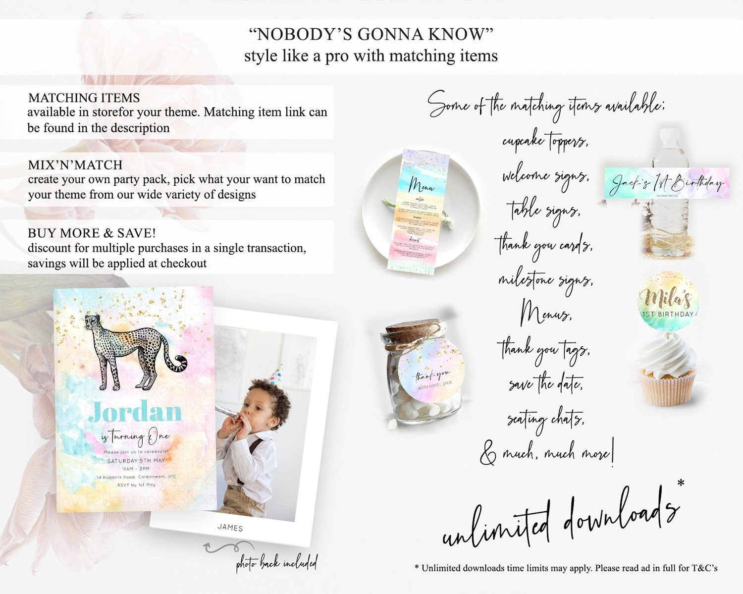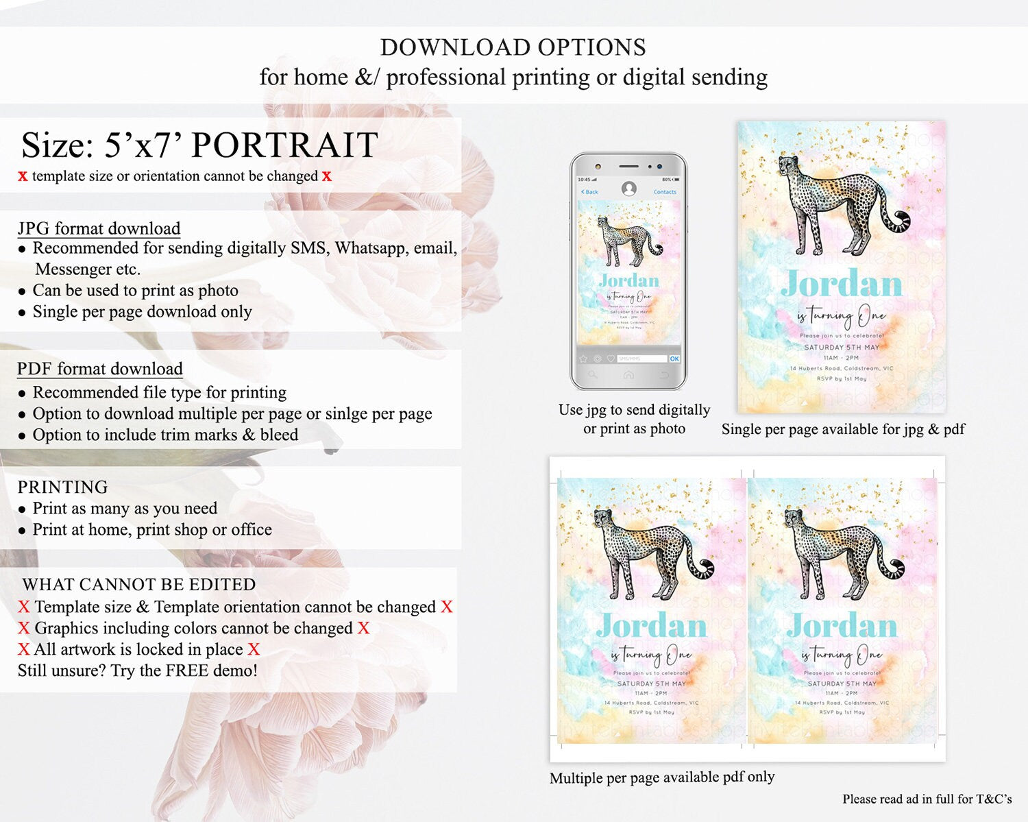 Cheetah Birthday Invitation Cheetah Invitation Cheetah Birthday Pastel Watercolor Cheetah Invitation Rainbow Cheetah Invitation D10289