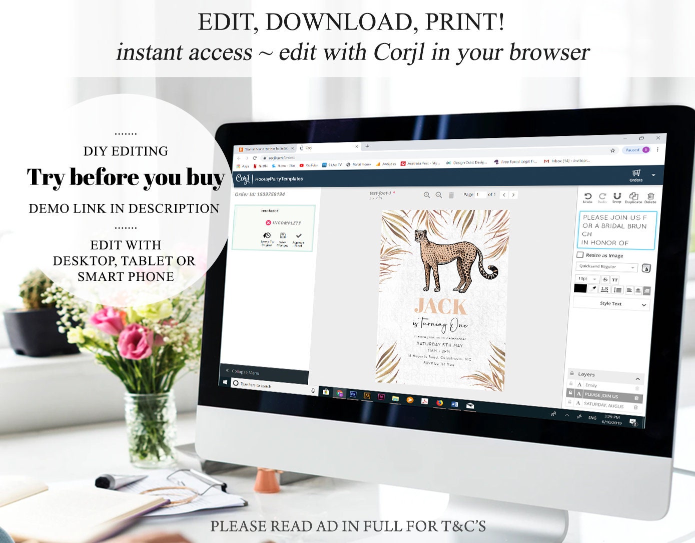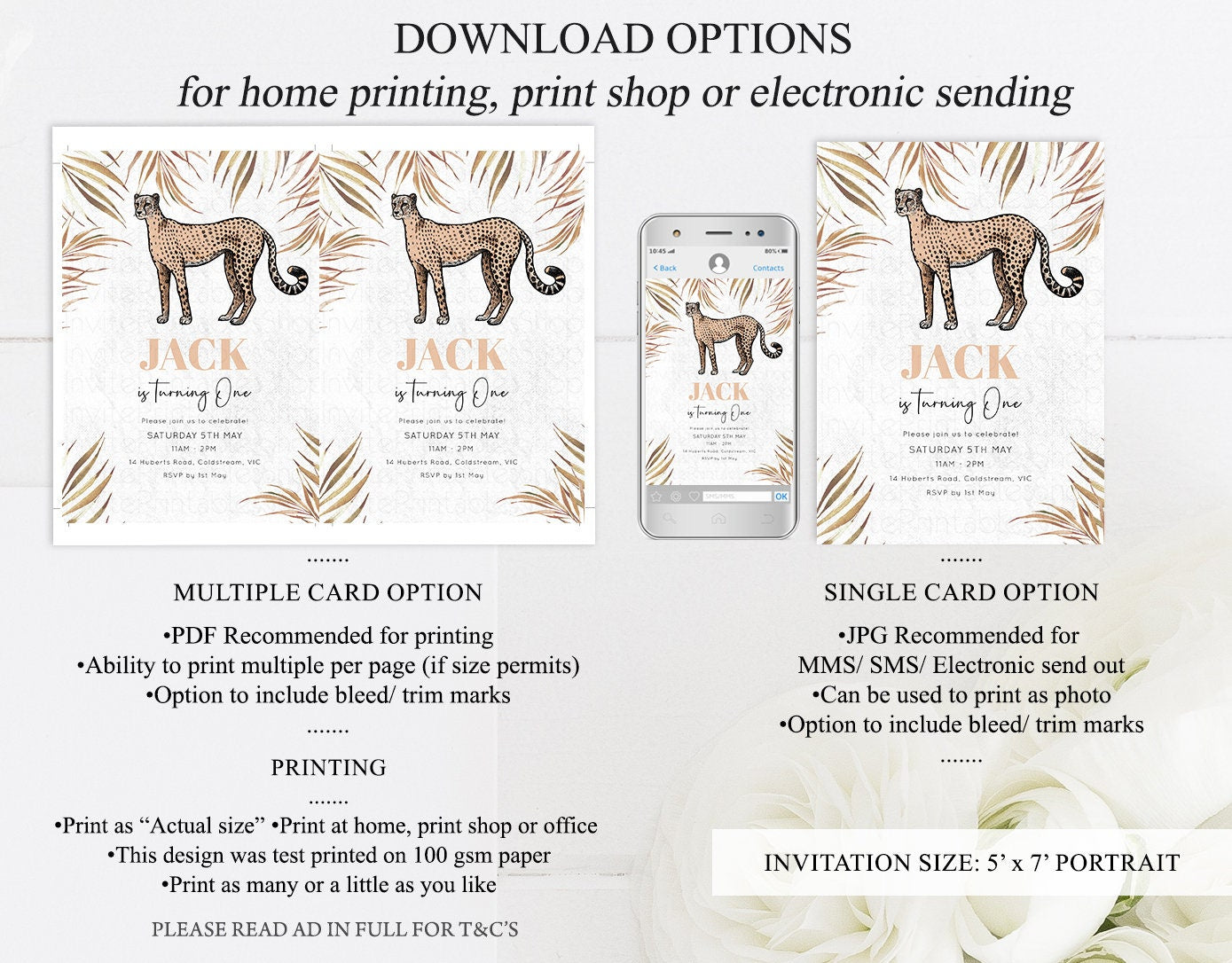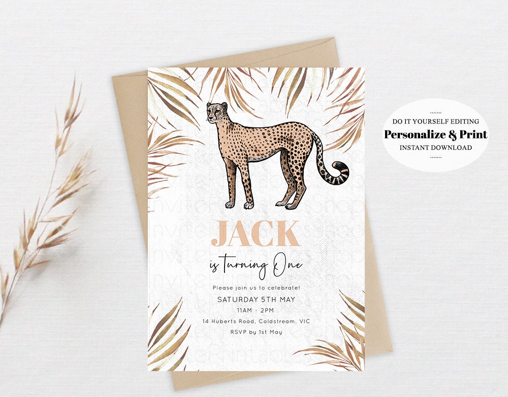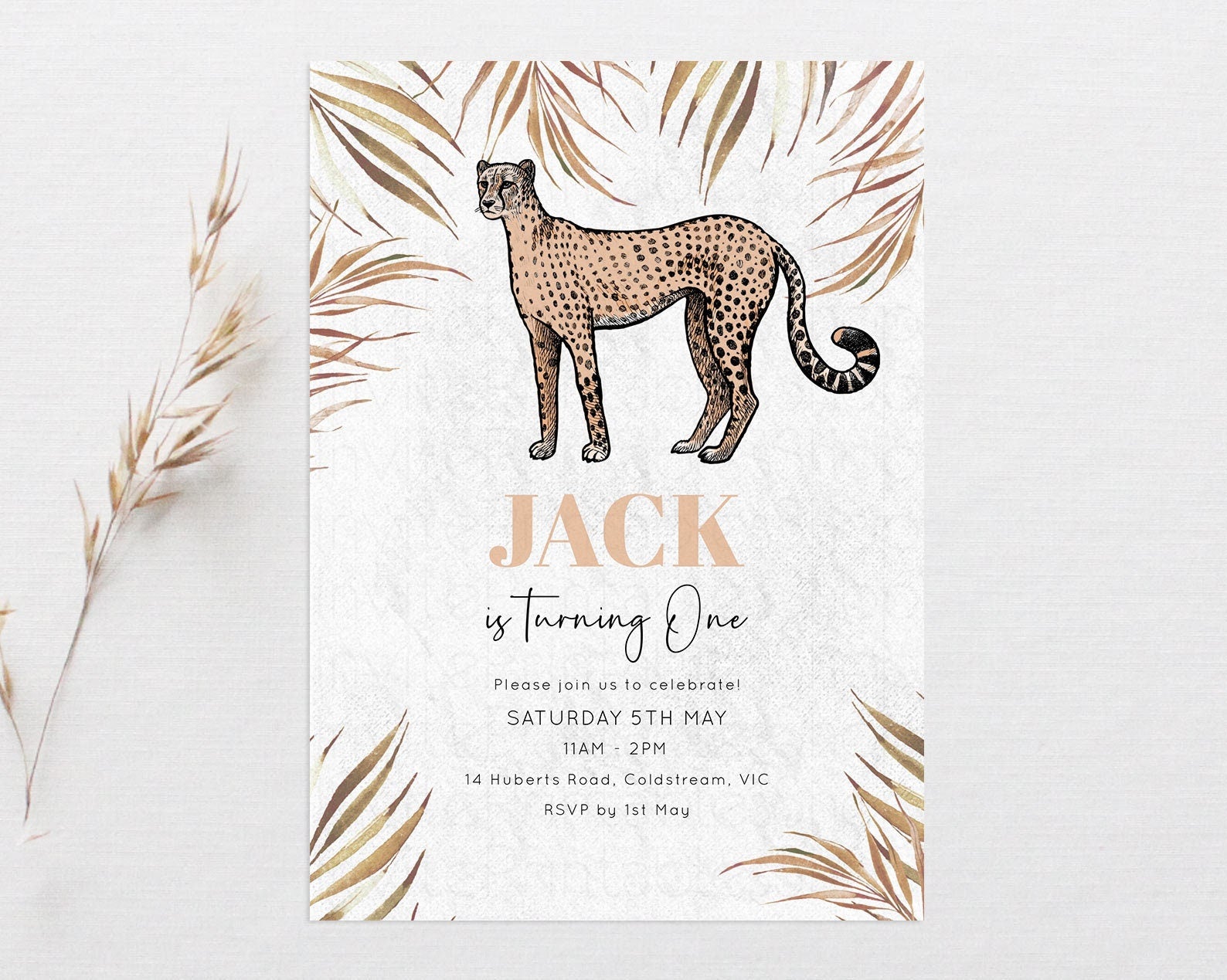 Cheetah Birthday Invitation Cheetah Invite Dried Tropical Palms Leaf Jungle Safari Adventure Zoo Party Wild Party Animal Custom Editable 287