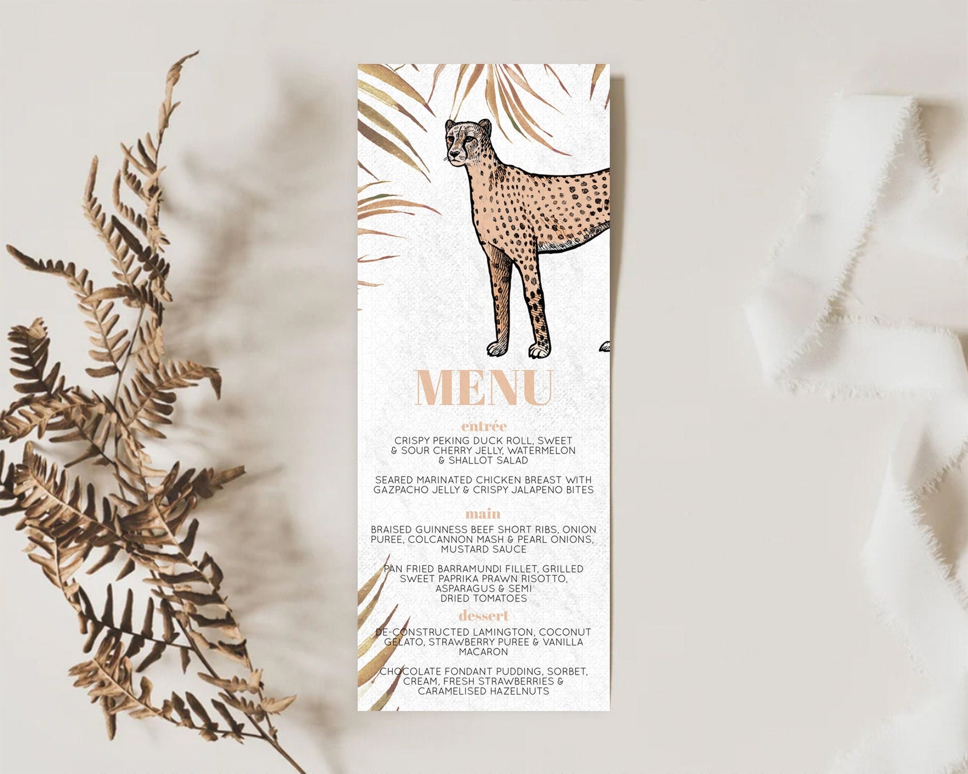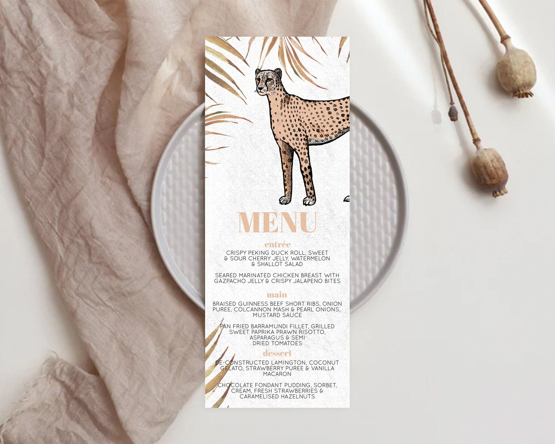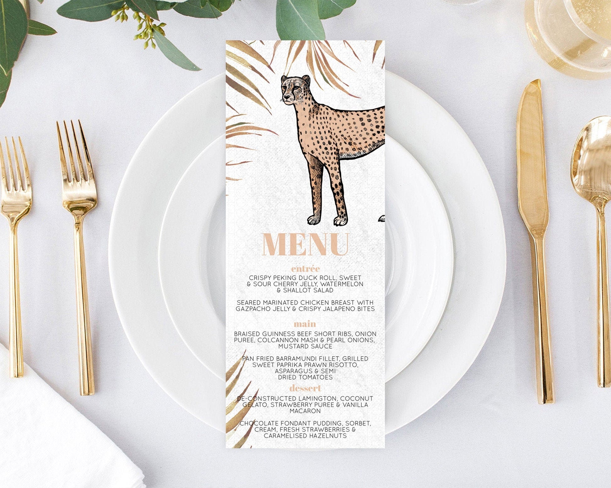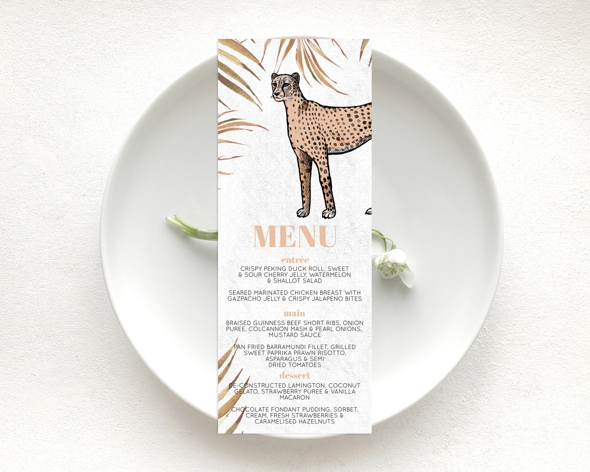 Cheetah Menu Cheetah Menu Template Cheetah Party Table Decor Safari Adventure Decor Cheetah Dinner Dessert Menu Party Food Menu D10291
