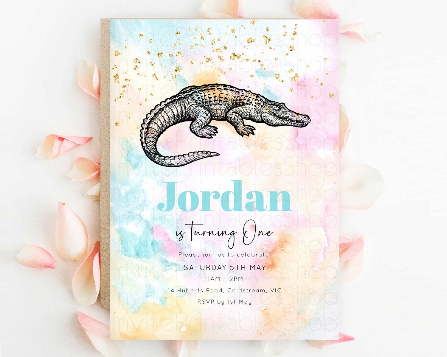 Pastel crocodile alligator-themed invitation
