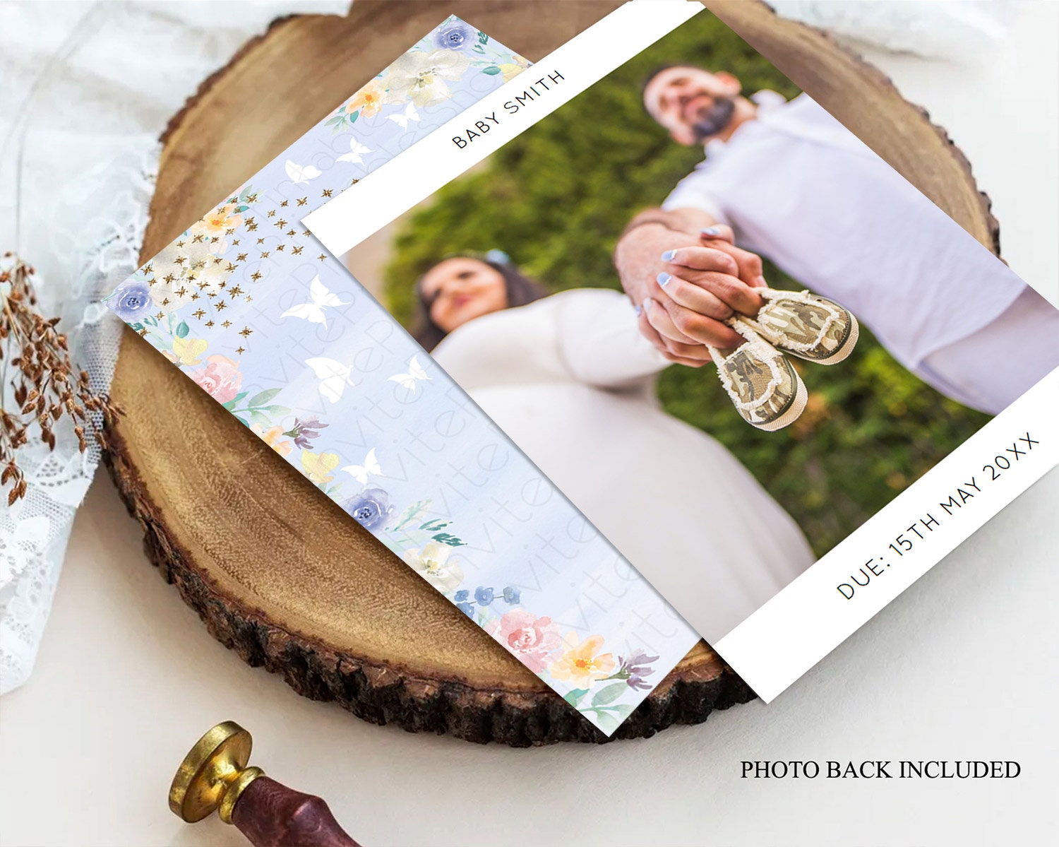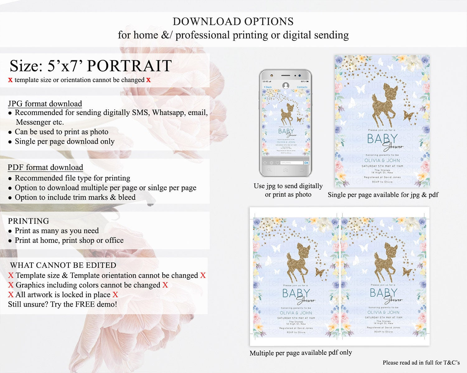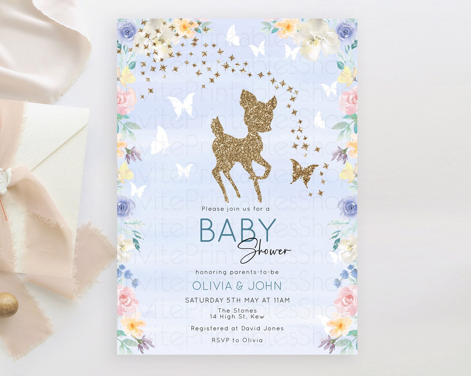 Deer Baby Shower Invitation, Enchanted Forest, Secret Garden, Butterfly, Whimsical Pastel Flowers - Blue Watercolor, Pink, Yellow D10879