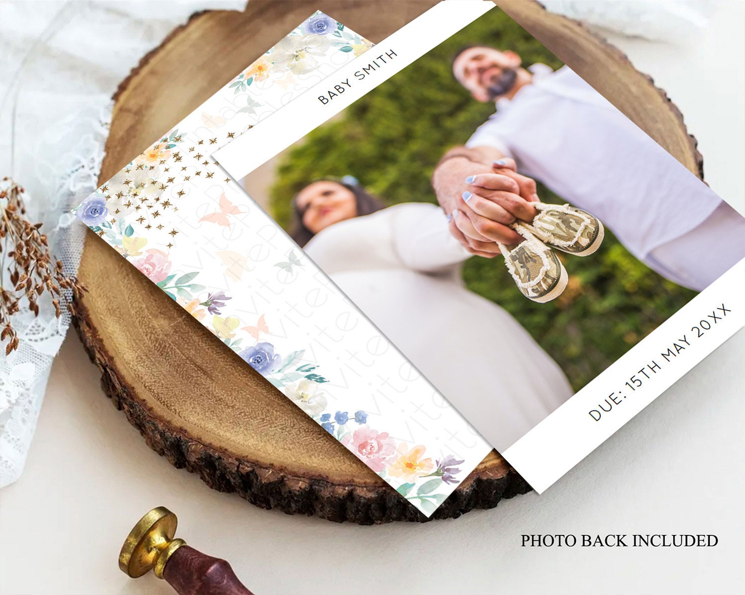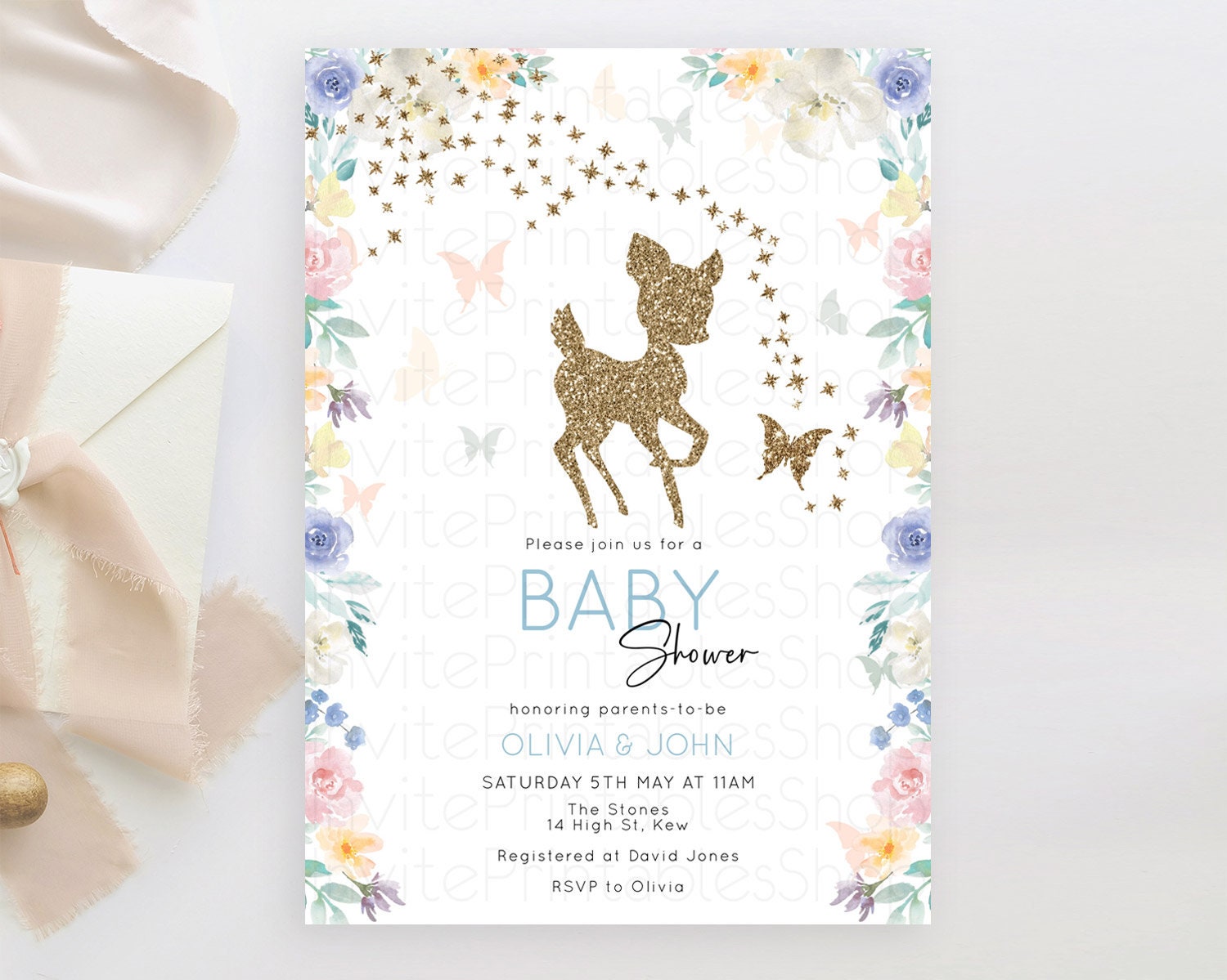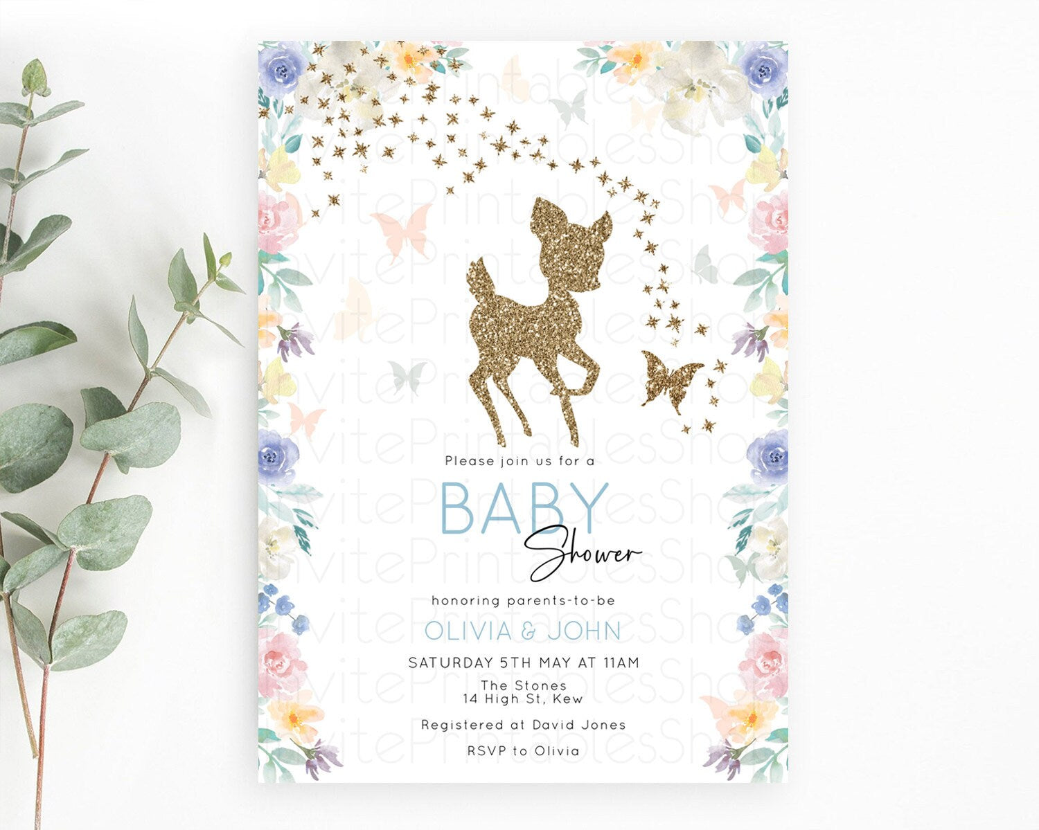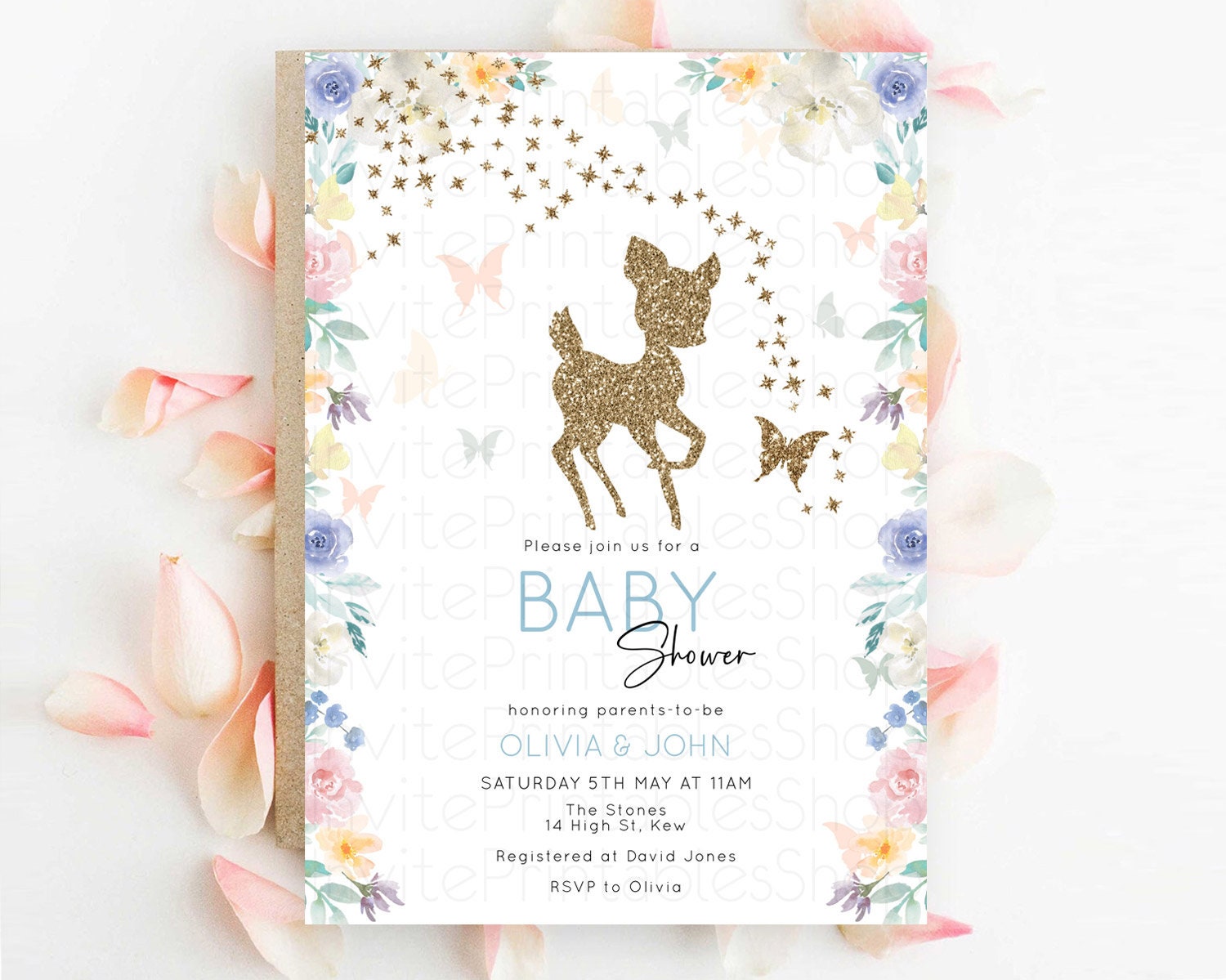 Deer Baby Shower Invitation, Enchanted Forest, Secret Garden, Pastel Green, Orange, Pink Floral, Butterflies, Whimsical Glitter Magic D10878