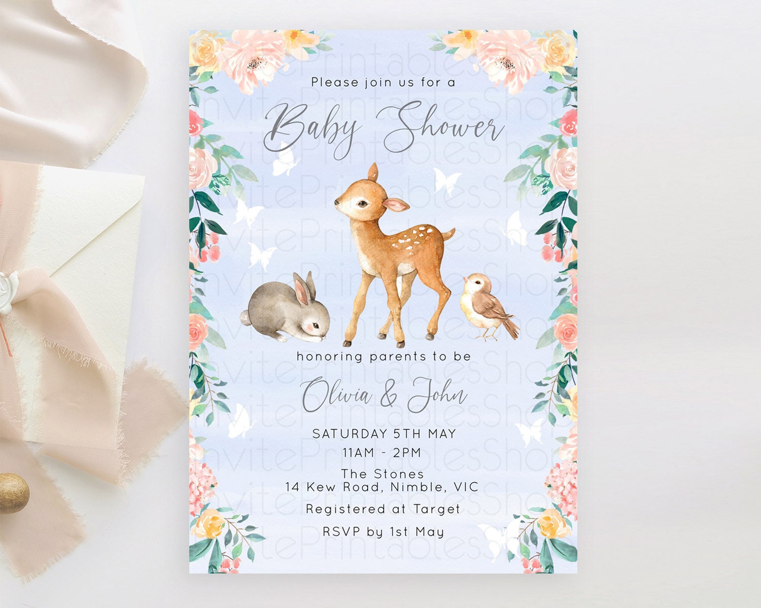 Deer Baby Shower Invitation, Whimsical Enchanted Forest Fawn and Butterflies, Soft Pastel Watercolor Blue, Pink Green Floral Accents D10920