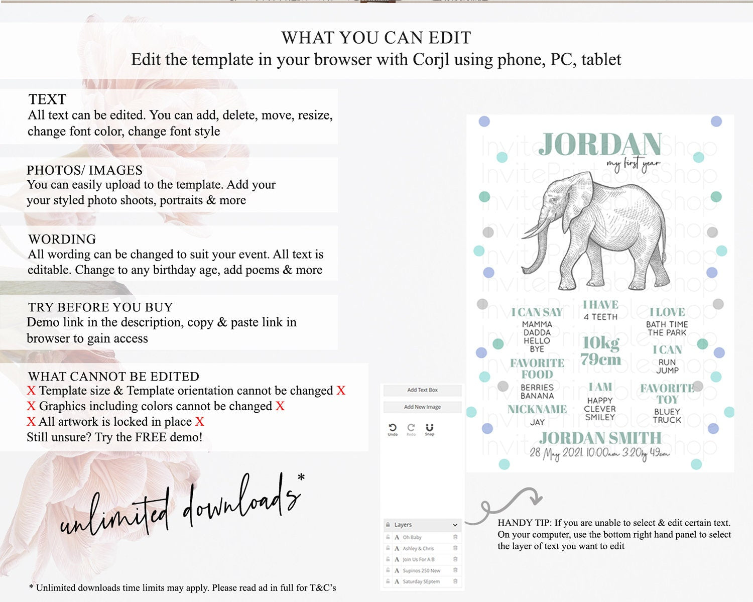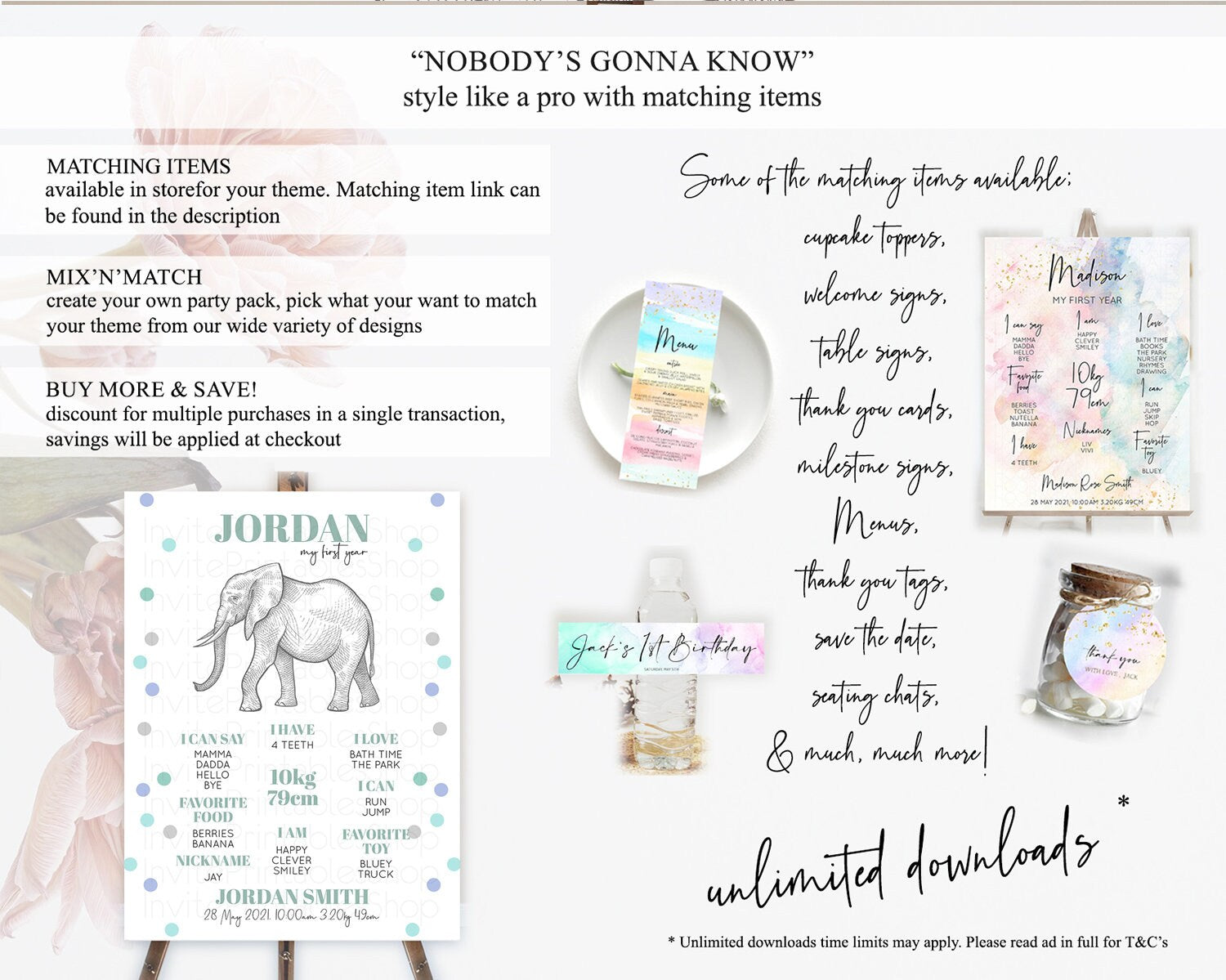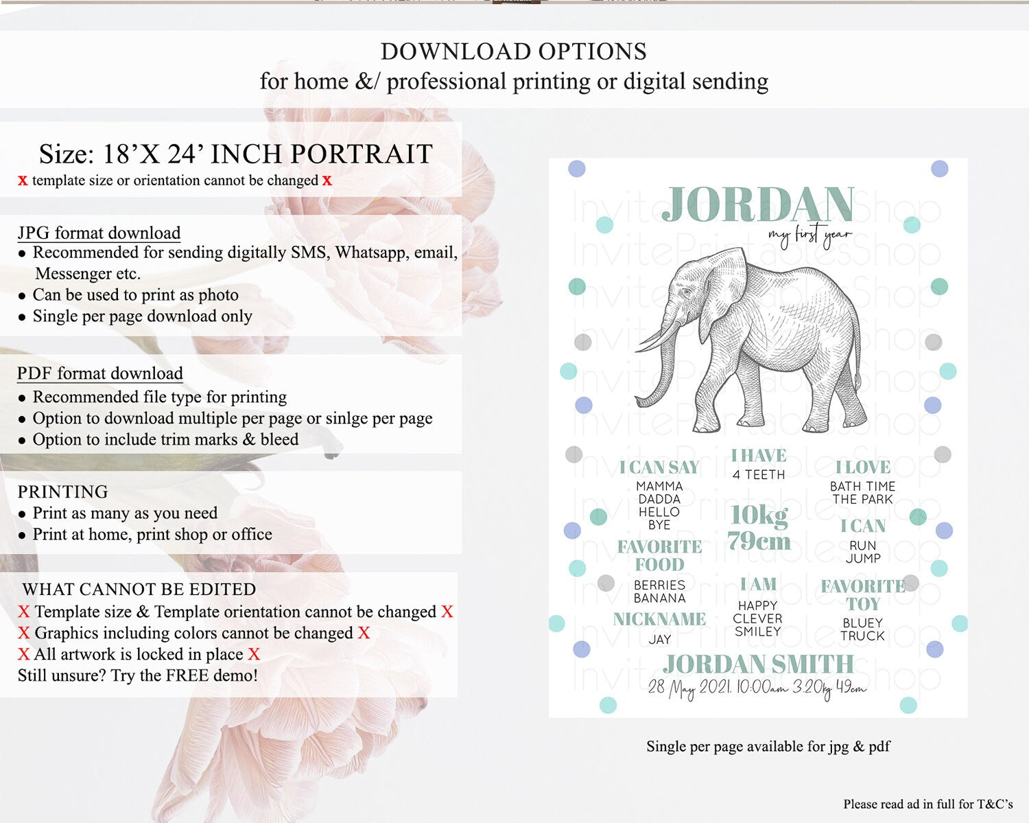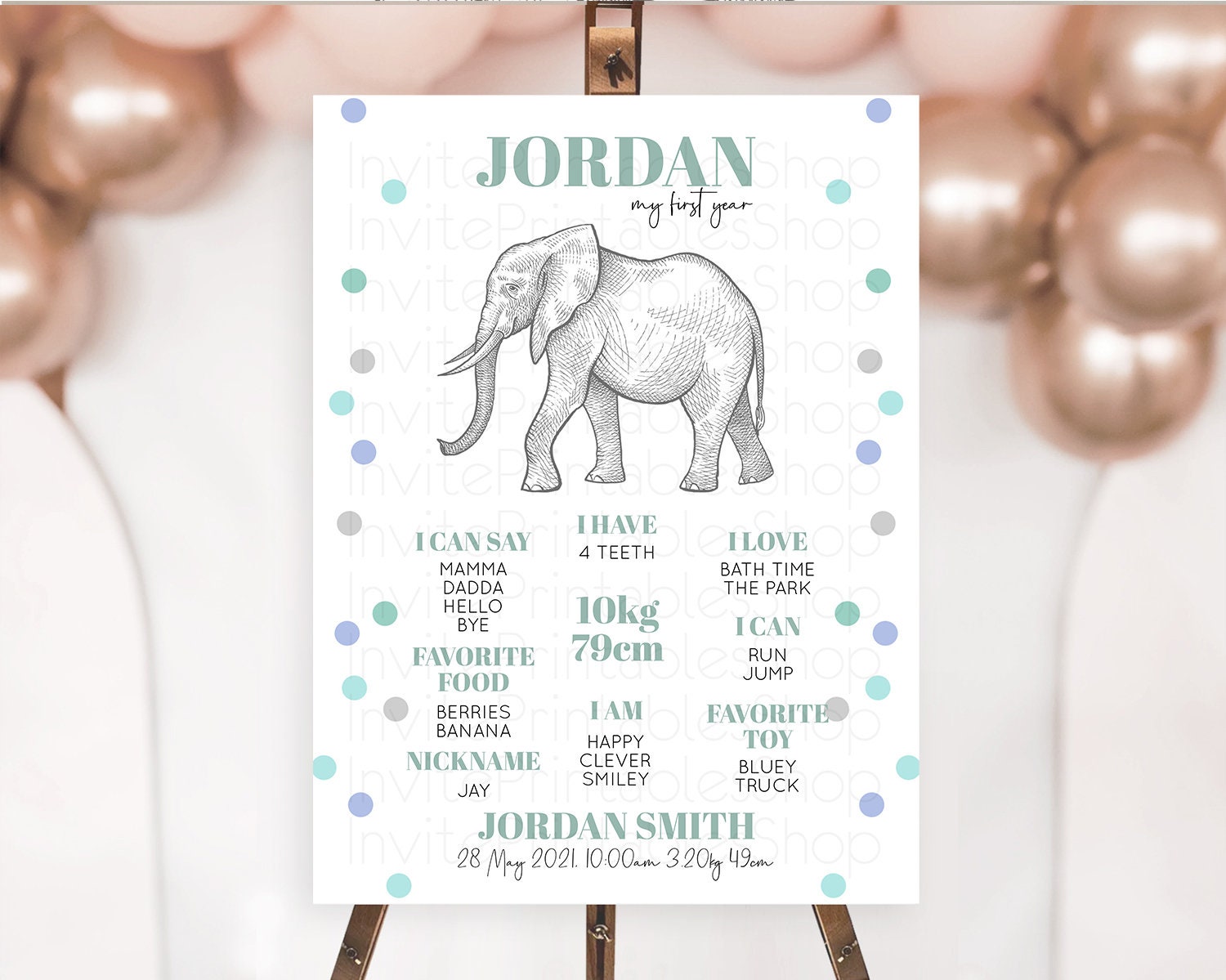 Elephant First Birthday Milestone Board Elephant Milestone Poster One Wild Year Safari Adventure Elephant Zoo Birthday Welcome Sign D10859