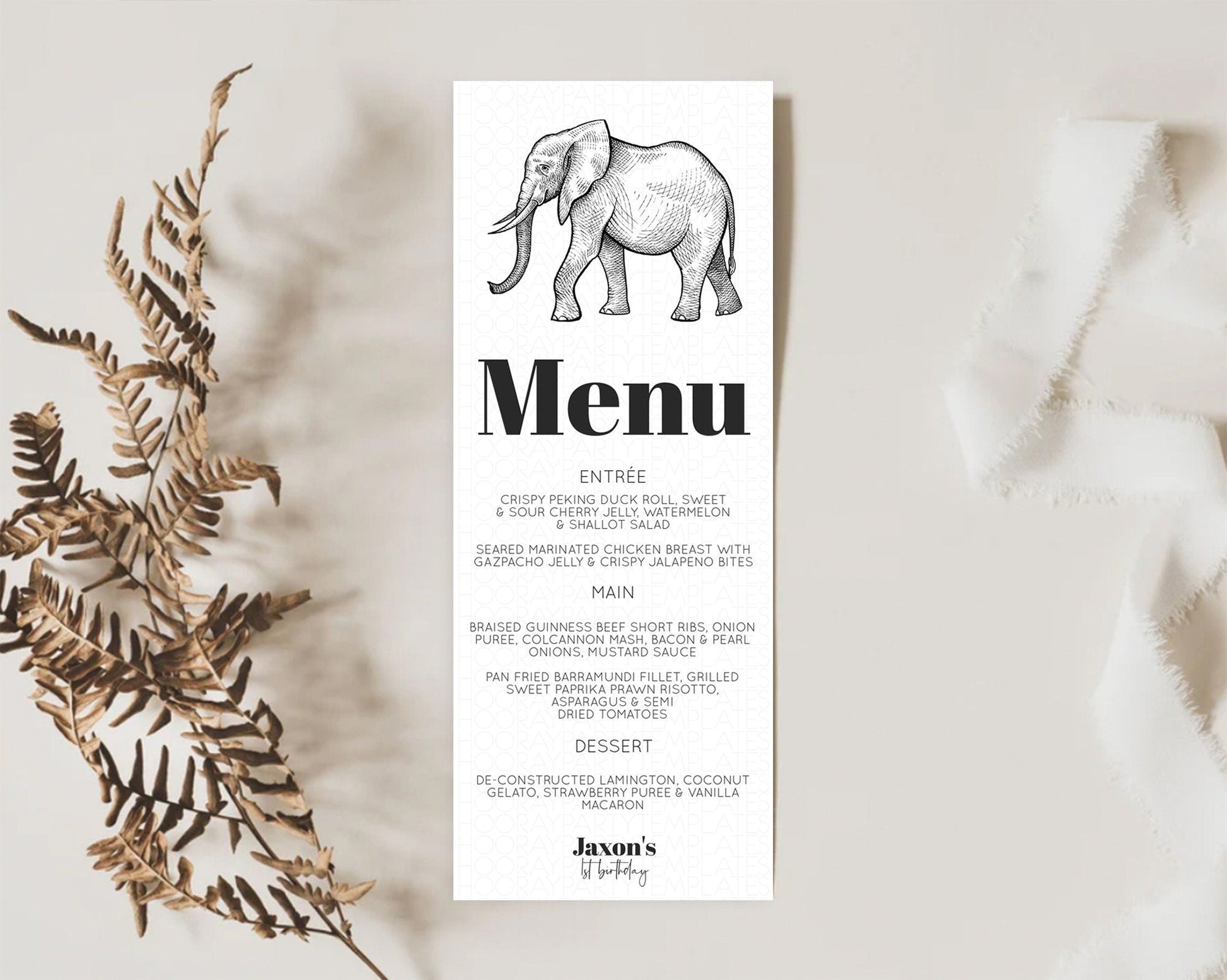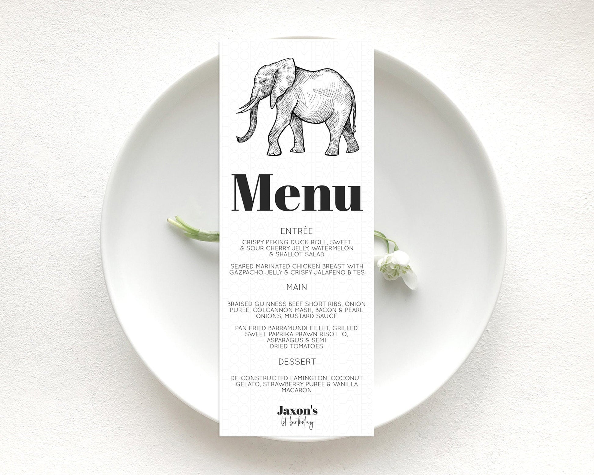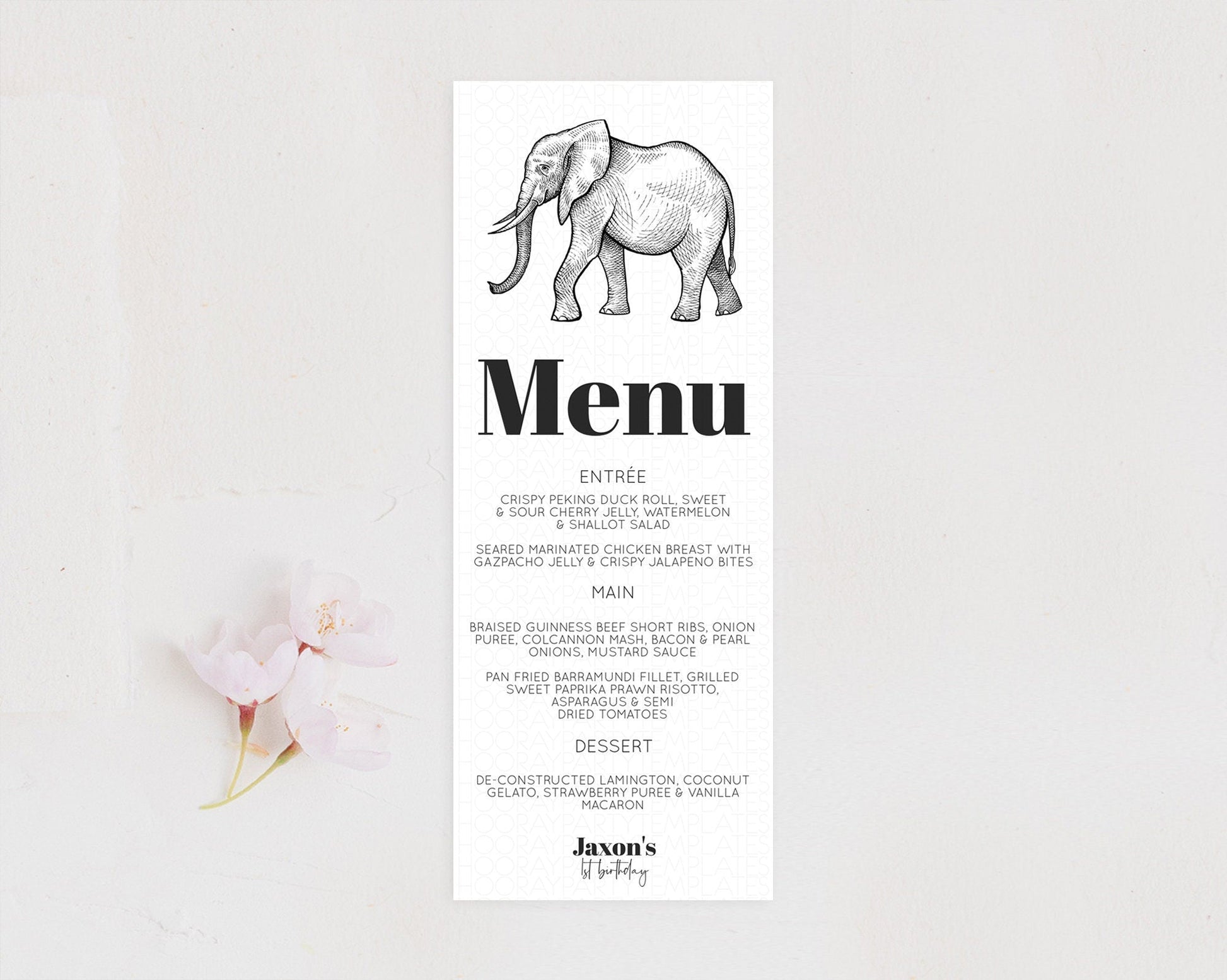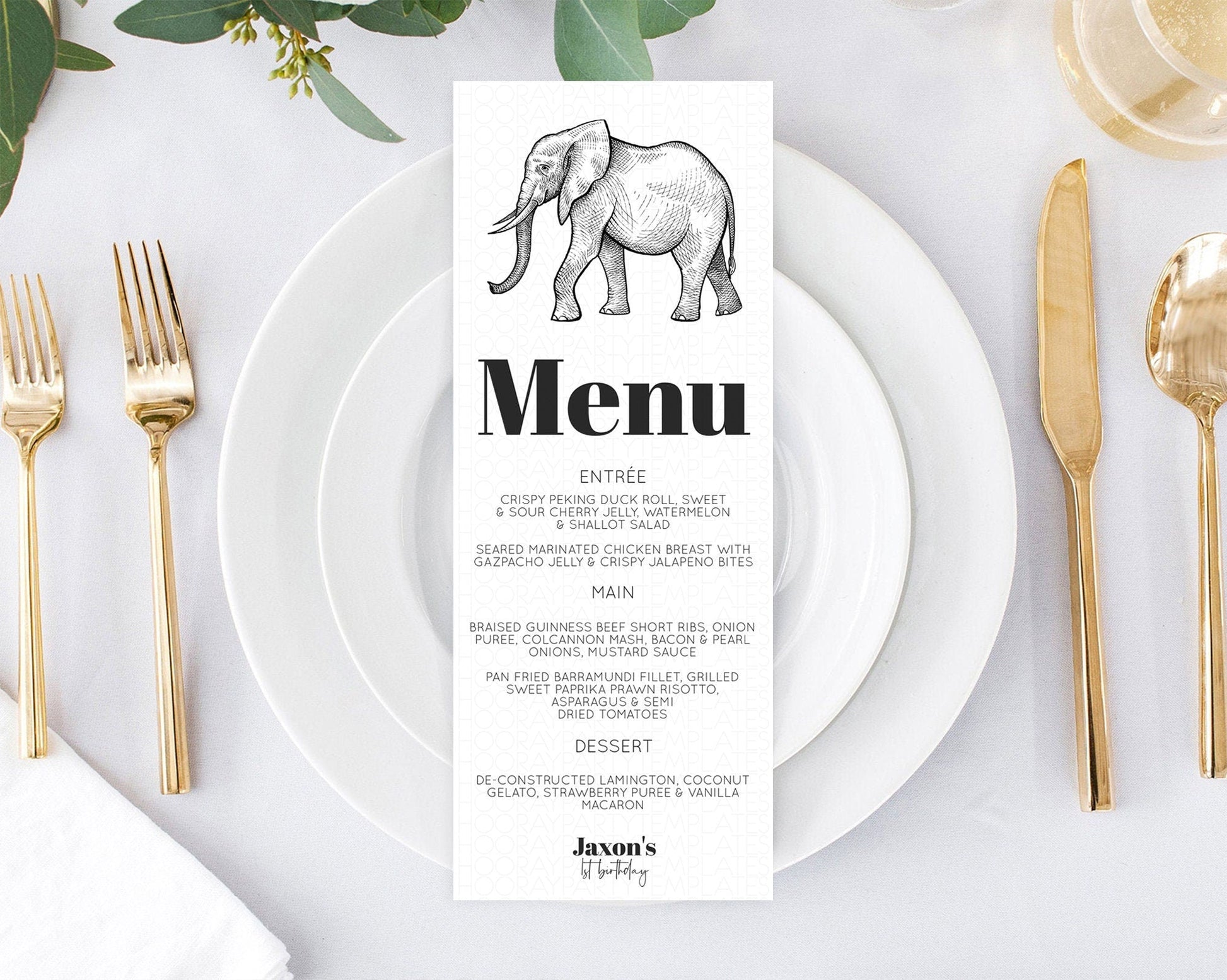 Elephant Menu Elephant Menu Template Elephant Safari Zoo Table Decor Elephant Dinner Dessert Menu Elephant Party Food Menu D10248