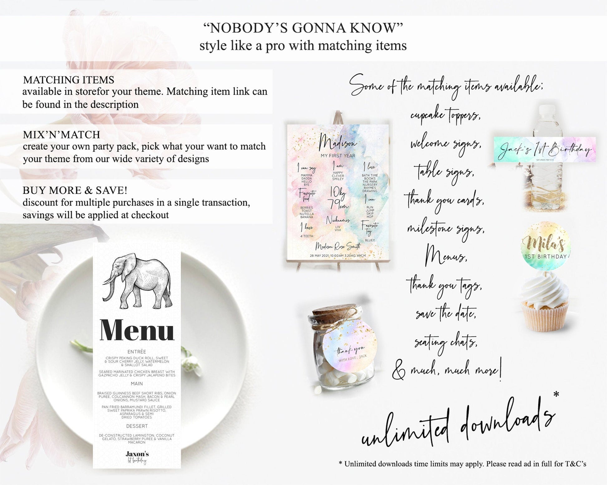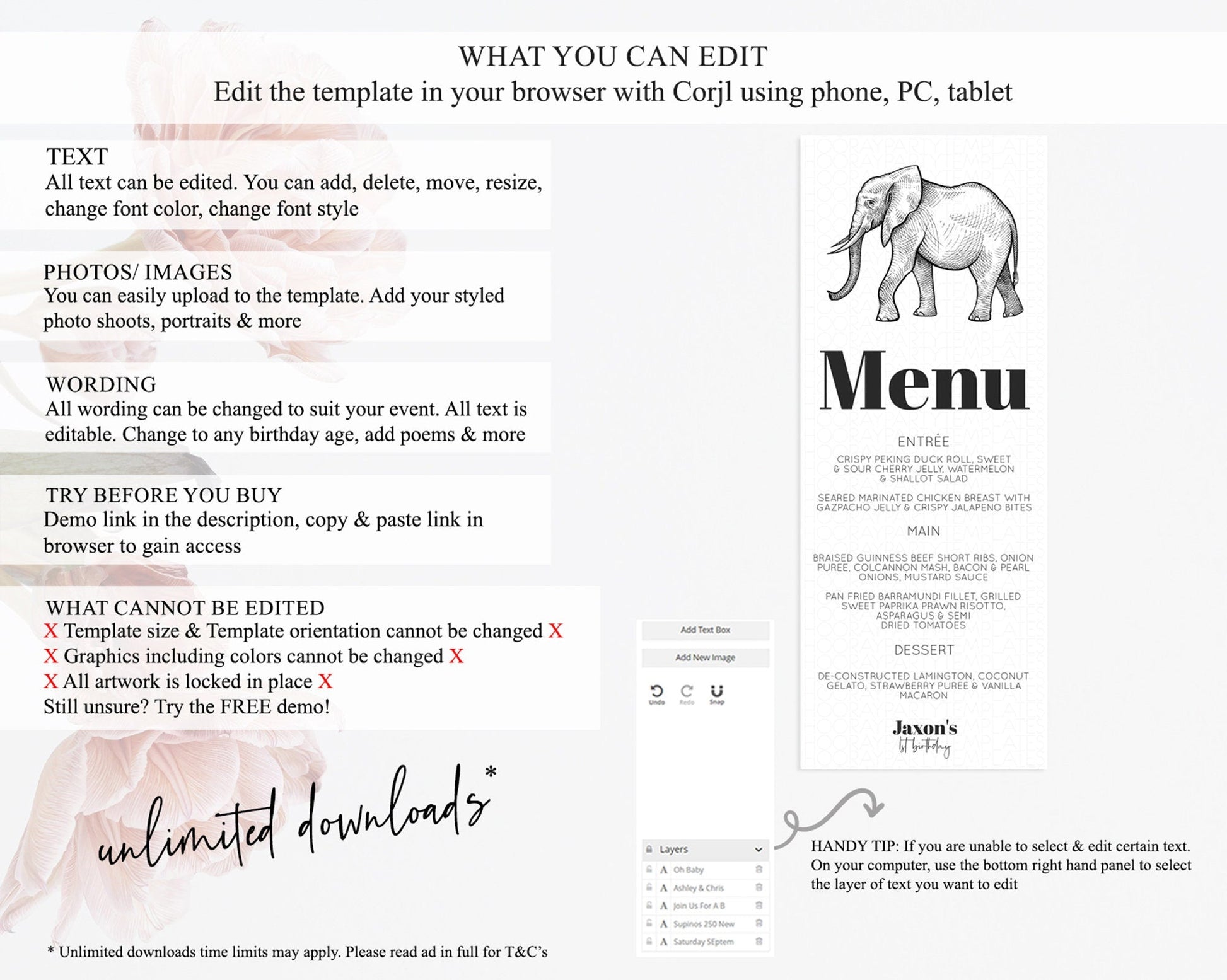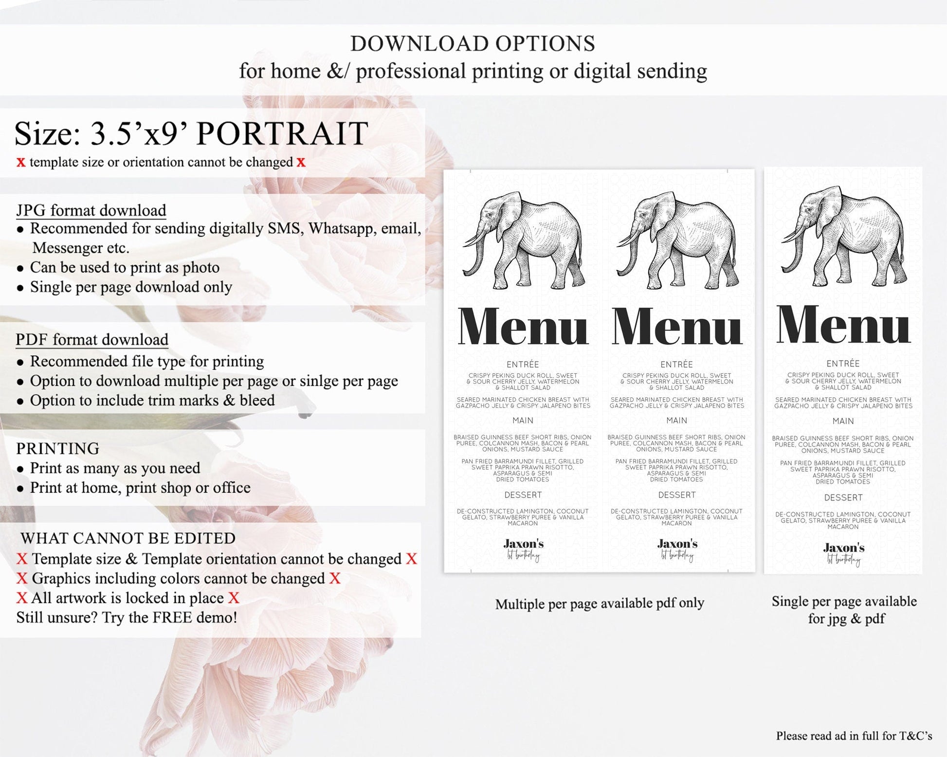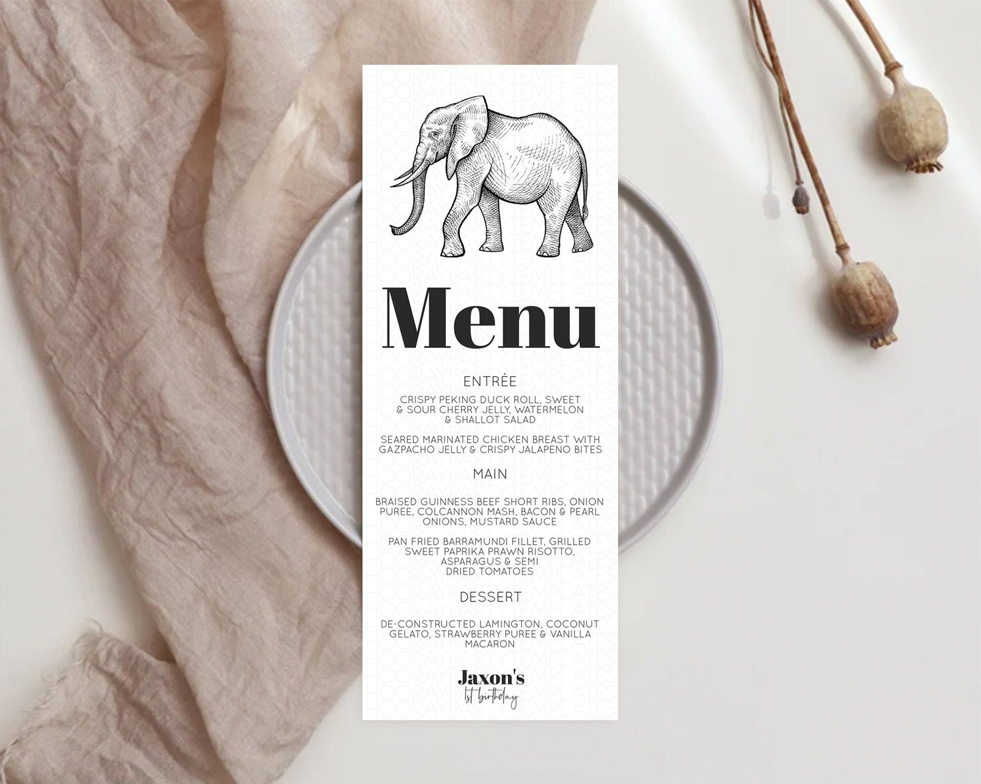 Elephant Menu Elephant Menu Template Elephant Safari Zoo Table Decor Elephant Dinner Dessert Menu Elephant Party Food Menu D10248