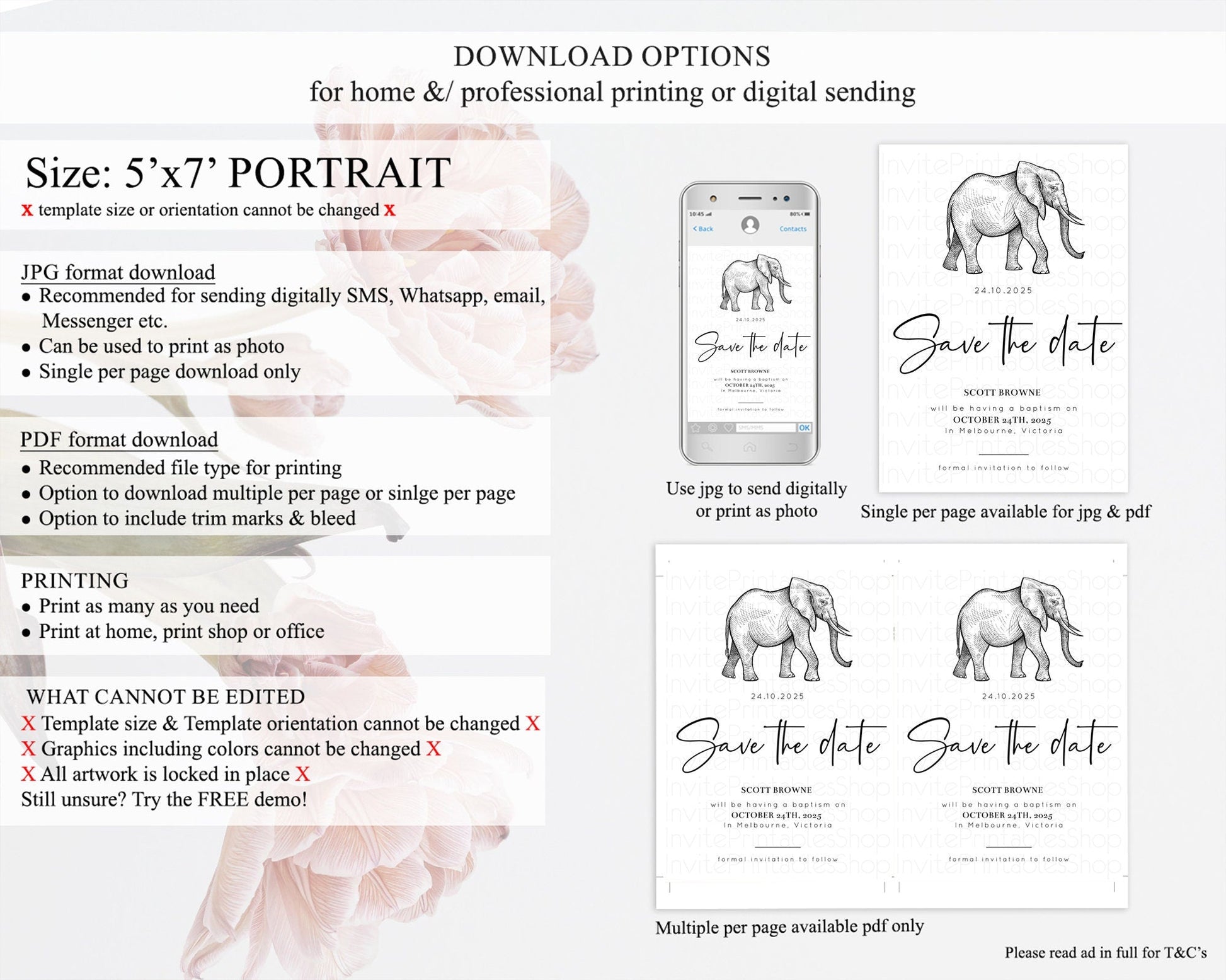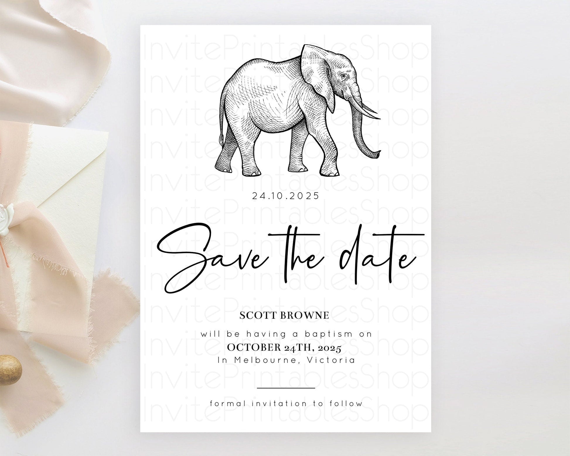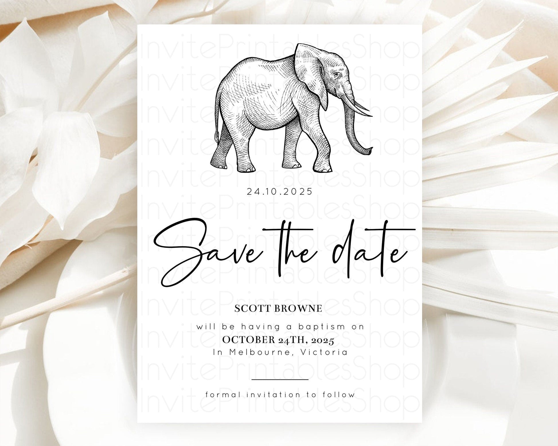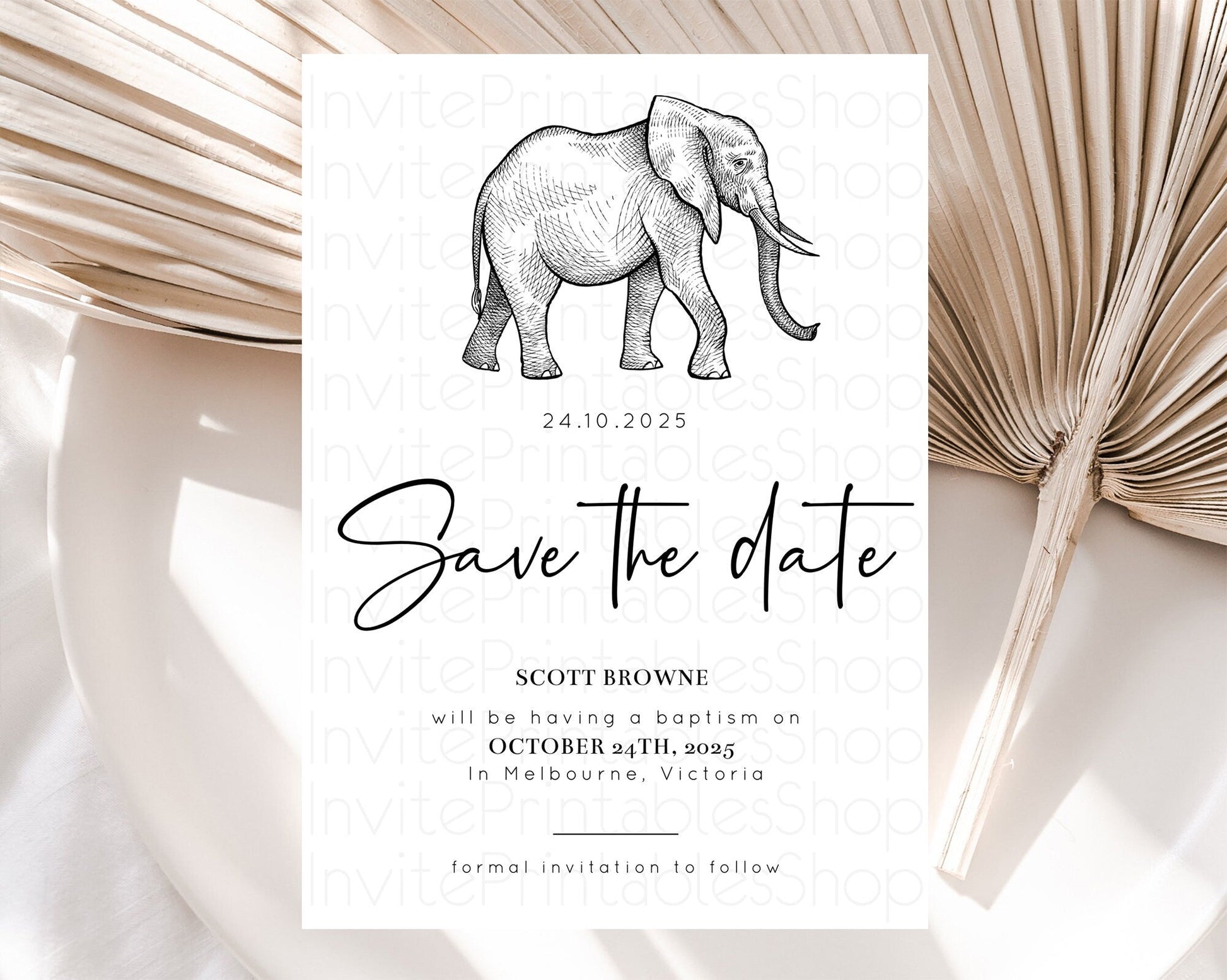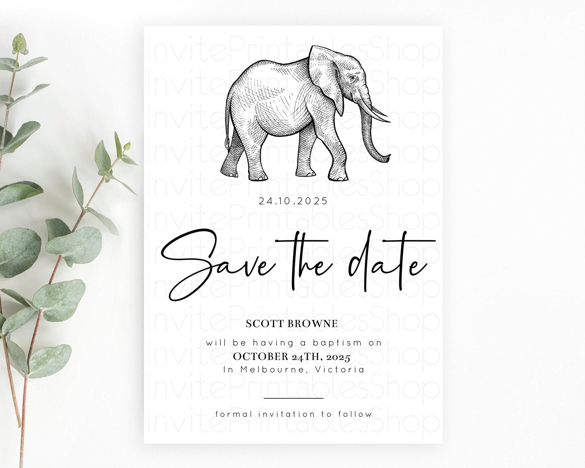 Elephant Save The Date Template Elephant Safari Adventure Party Dried Palm Fern Zoo 1st Birthday Baptism Baby Shower Bridal Shower D10248