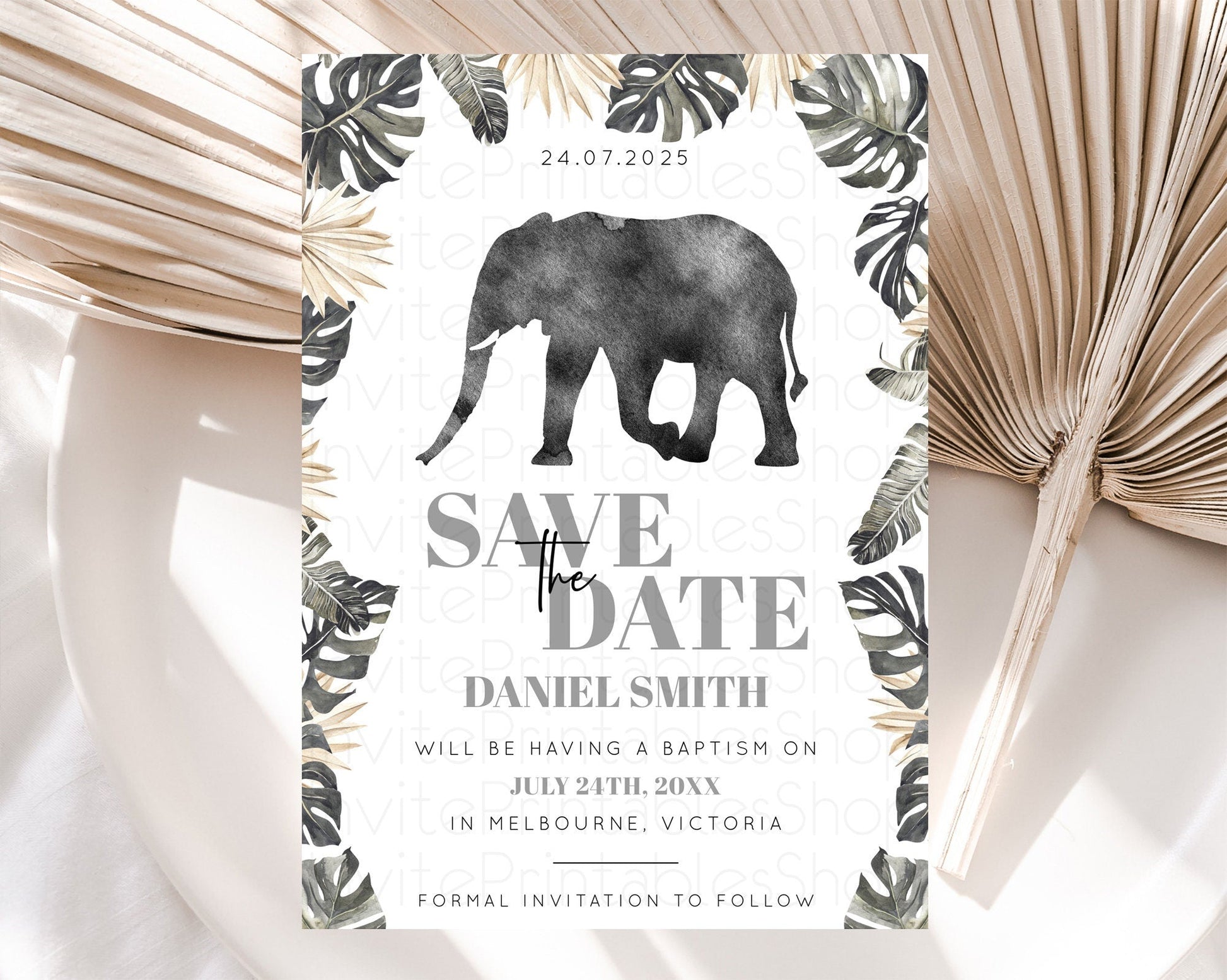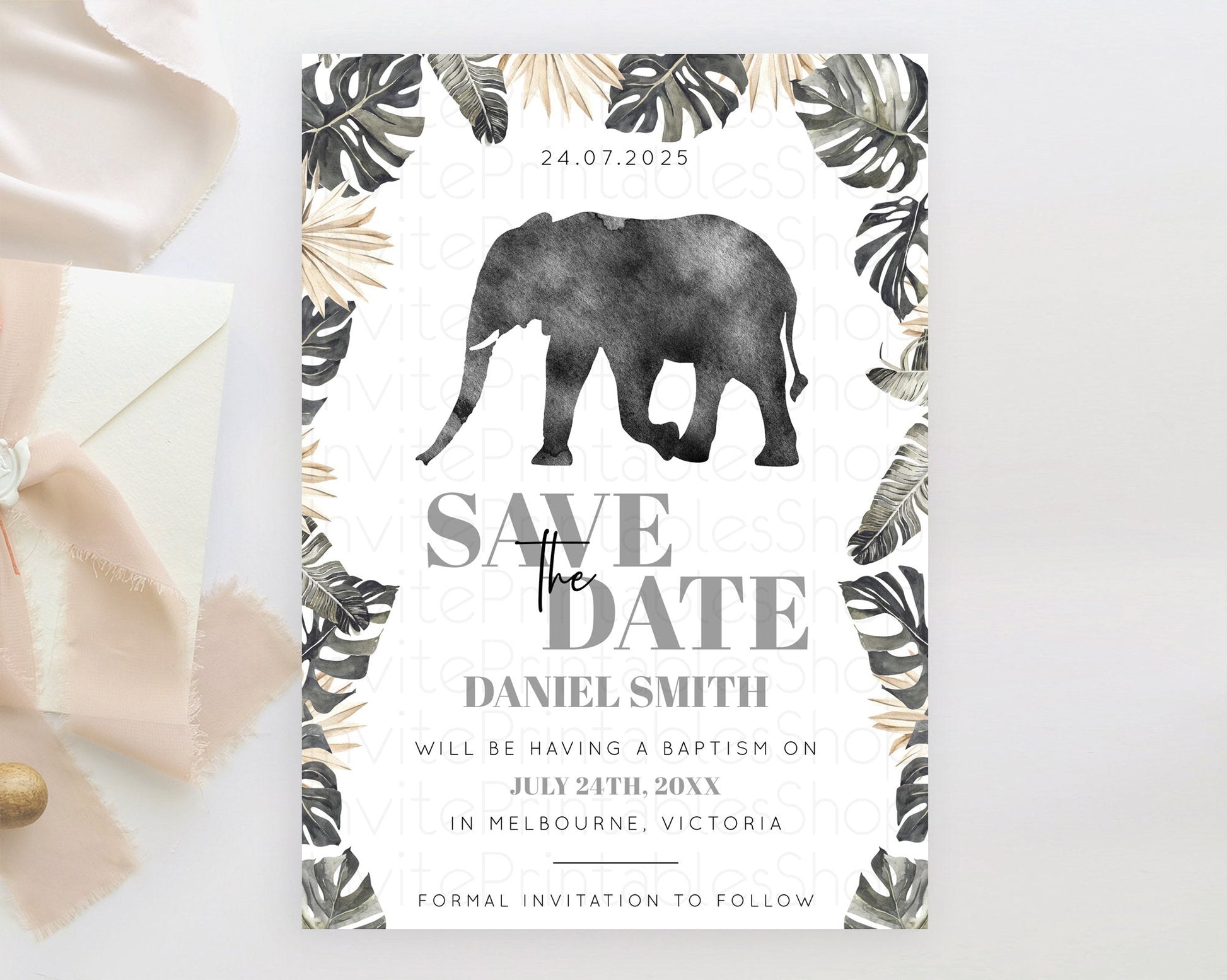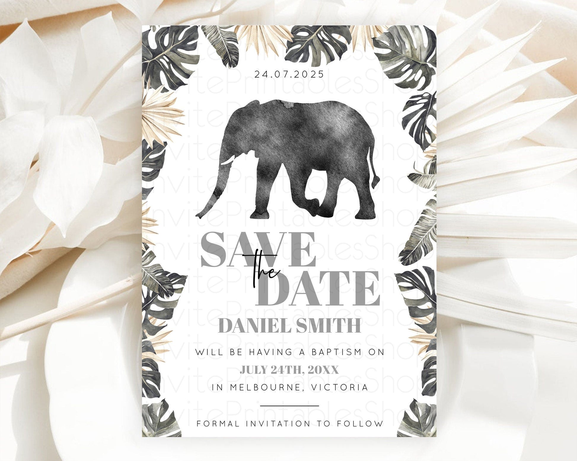 Elephant Save The Date Template Elephant Safari Adventure Party Dried Palm Fern Zoo 1st Birthday Baptism Baby Shower Bridal Shower D10803