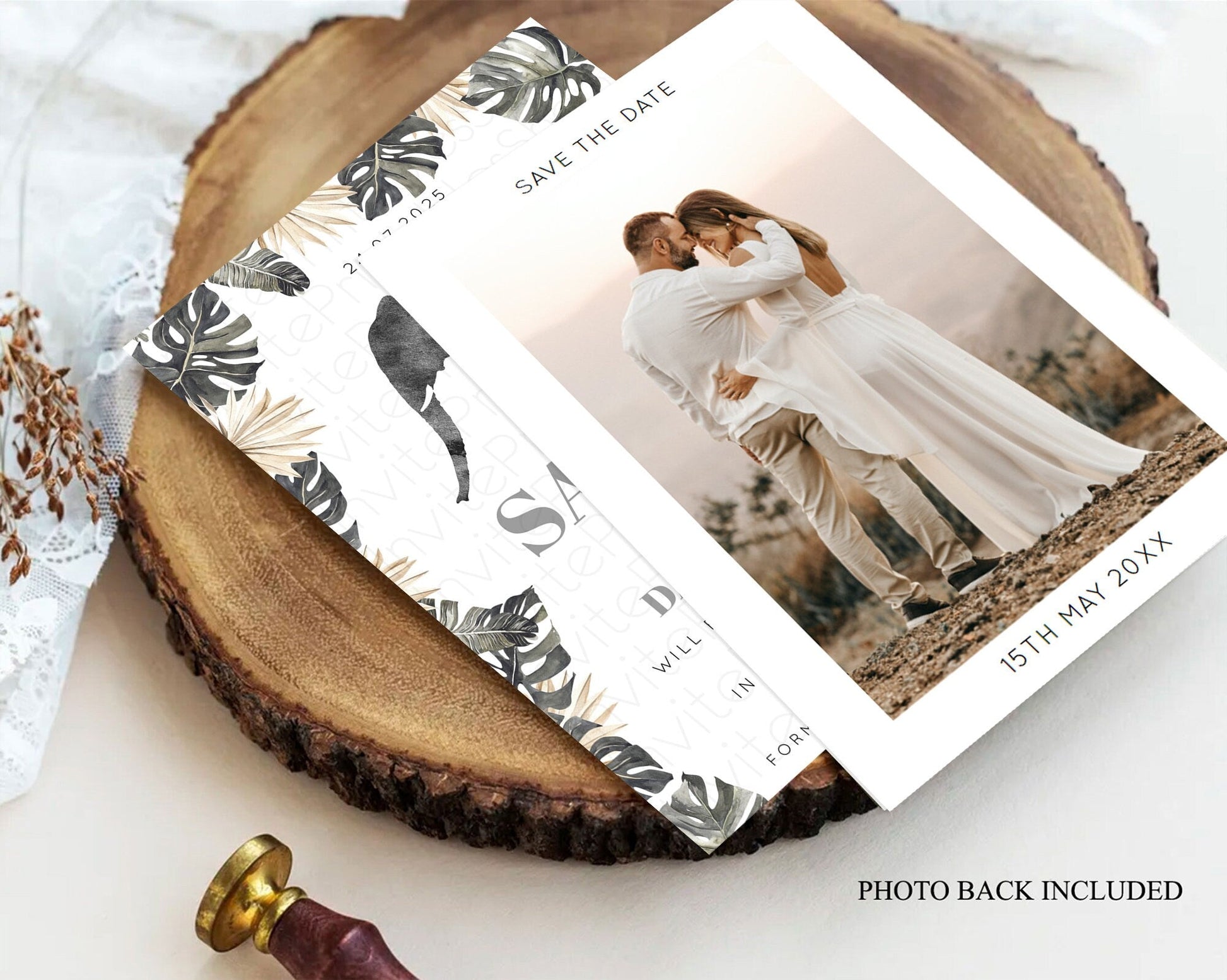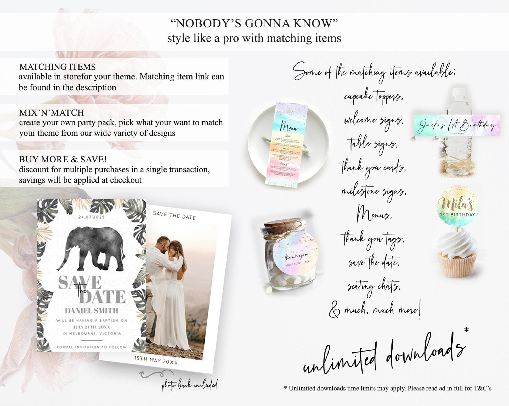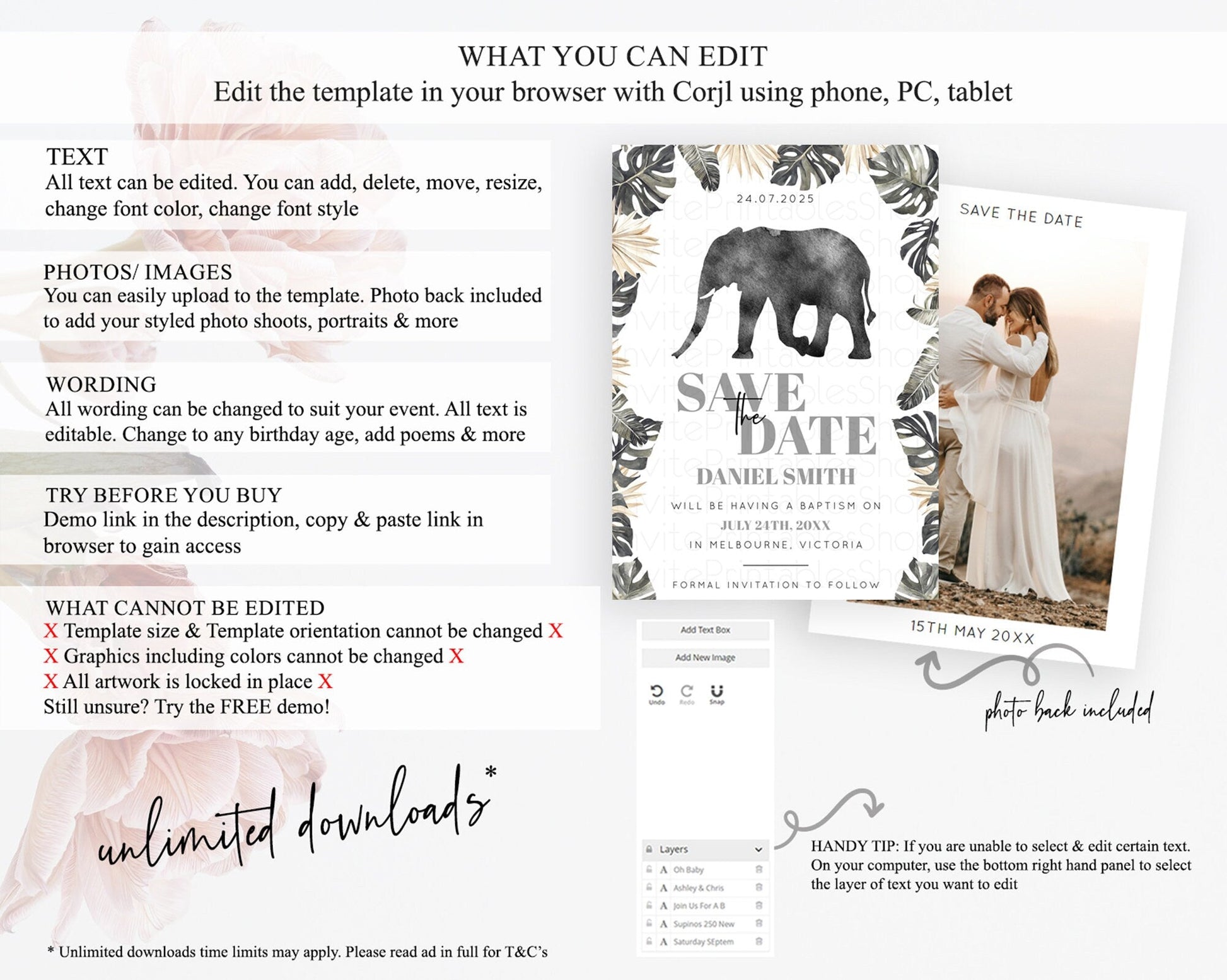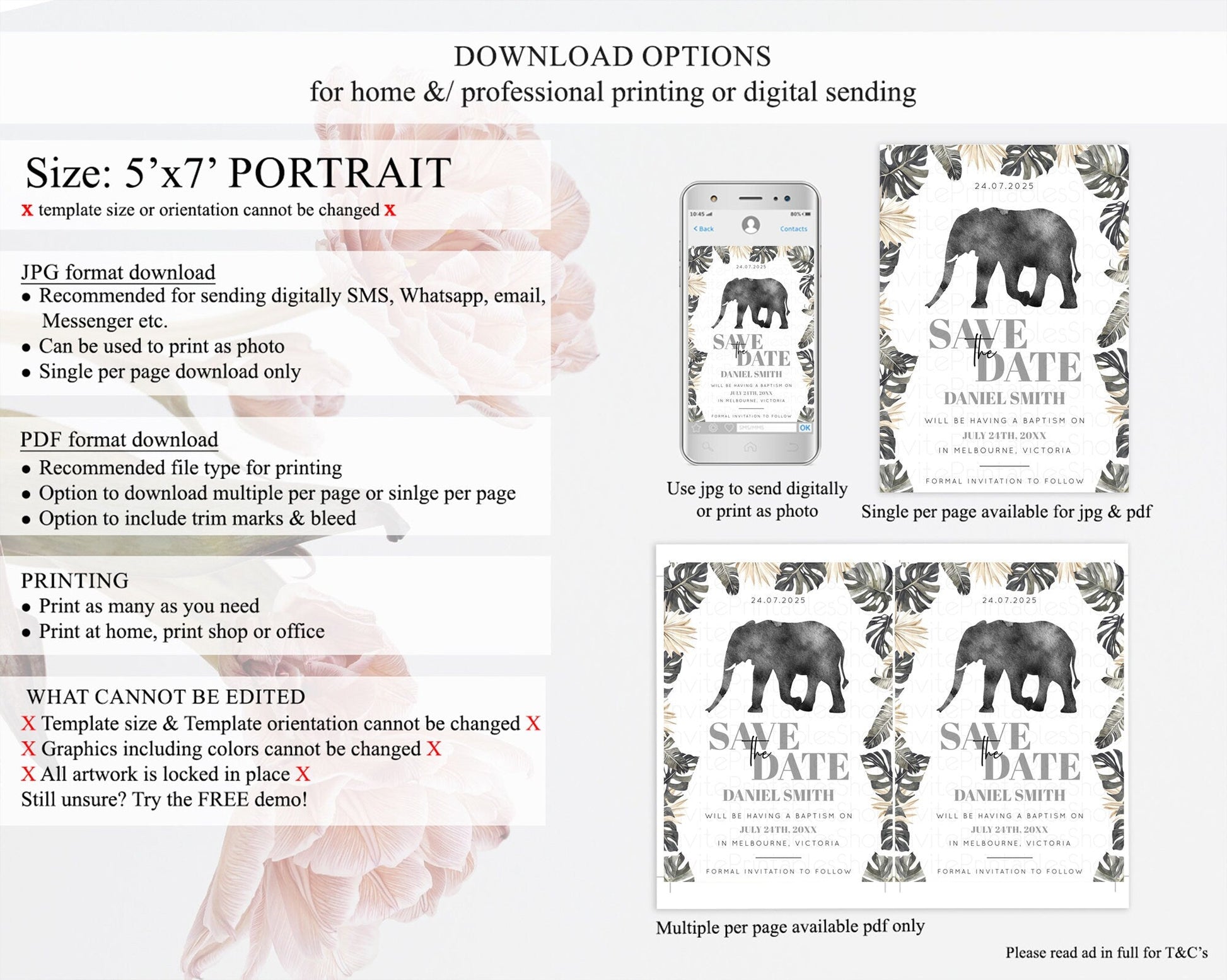 Elephant Save The Date Template Elephant Safari Adventure Party Dried Palm Fern Zoo 1st Birthday Baptism Baby Shower Bridal Shower D10803