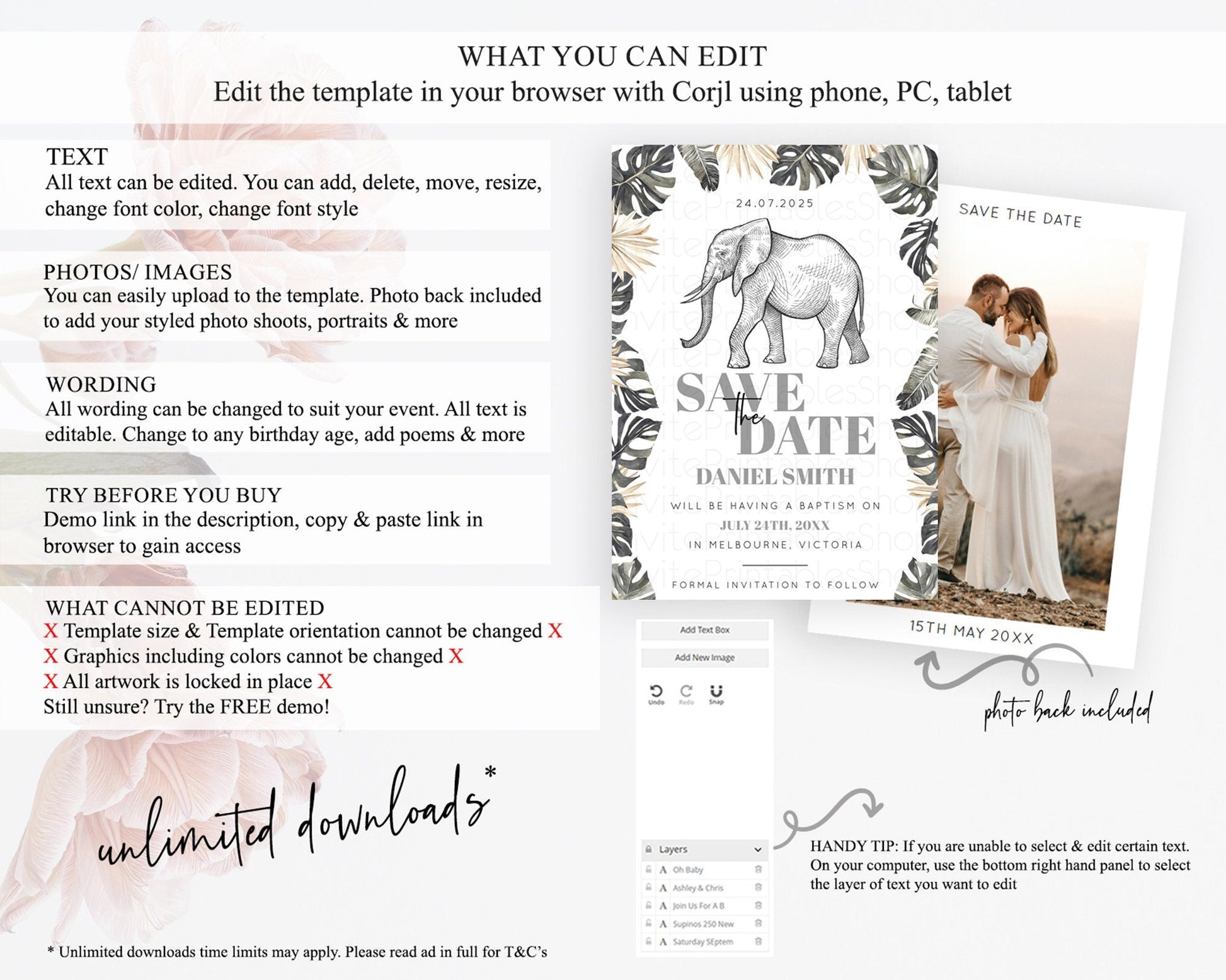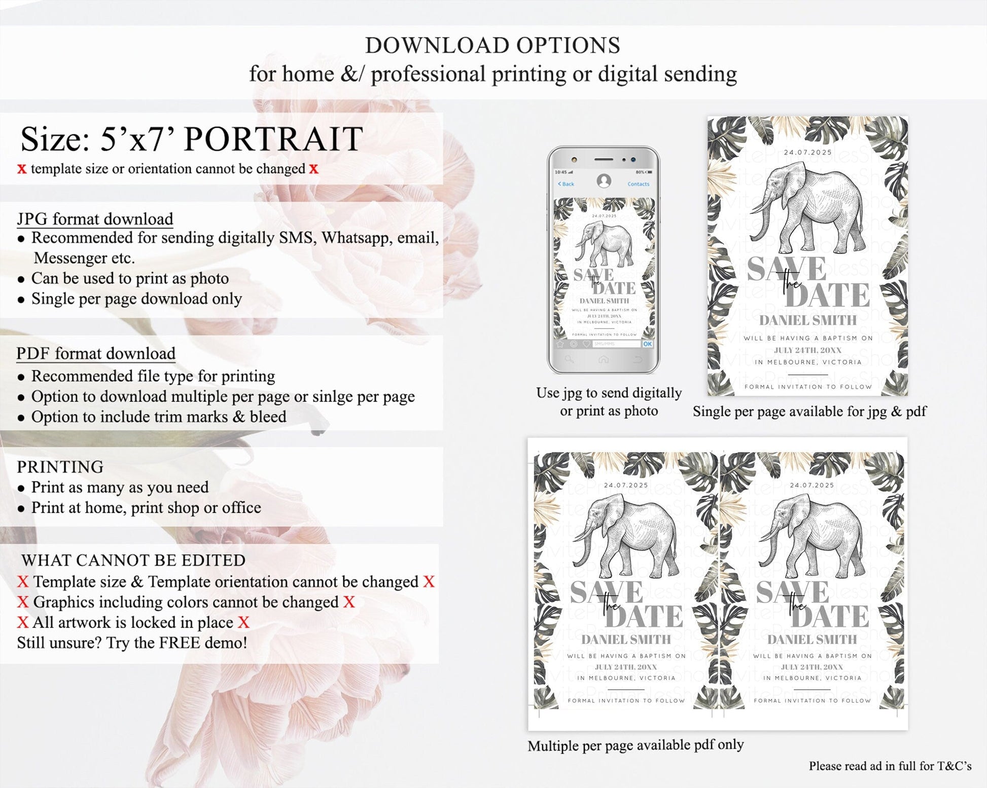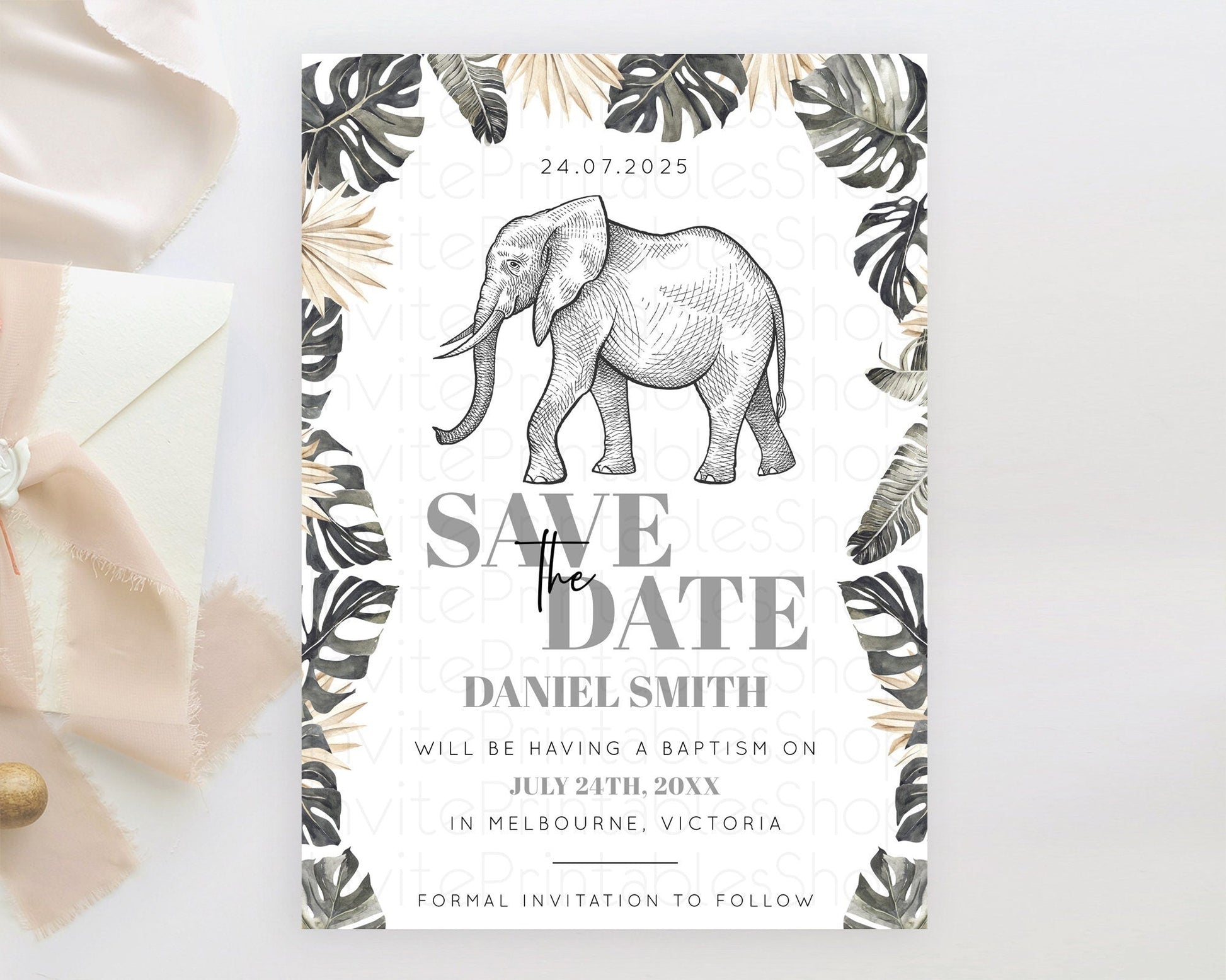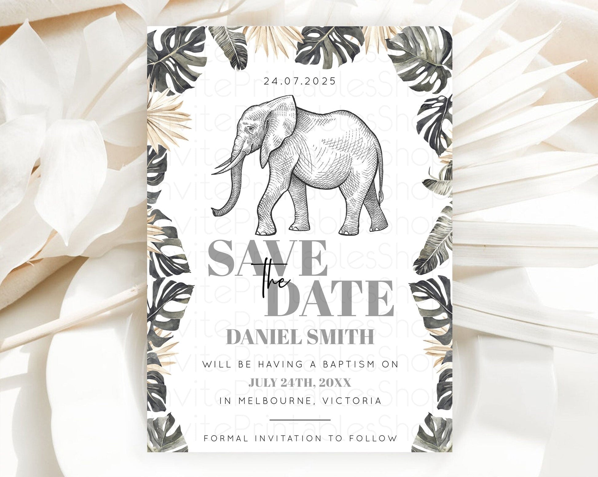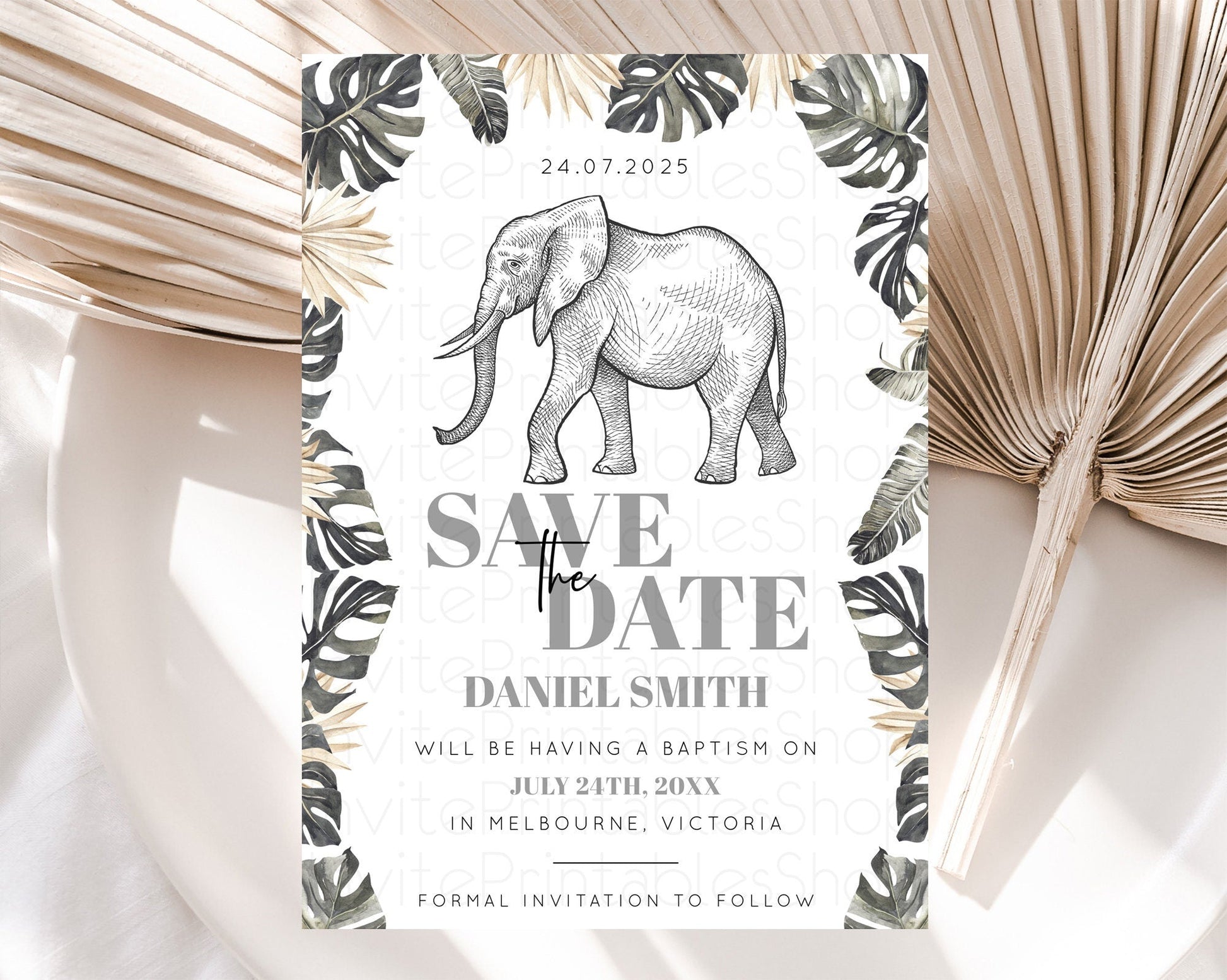 Elephant Save The Date Template Elephant Safari Adventure Party Dried Palm Fern Zoo 1st Birthday Baptism Baby Shower Bridal Shower D10806