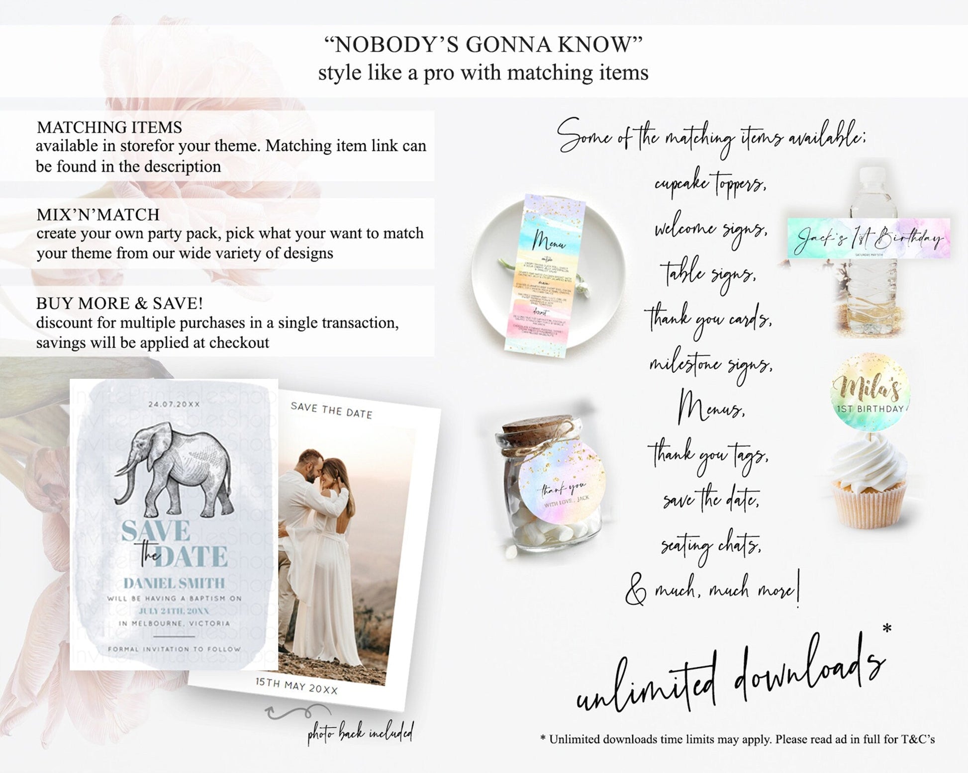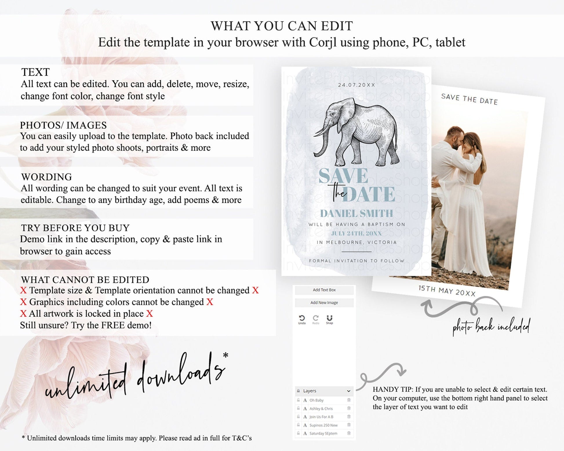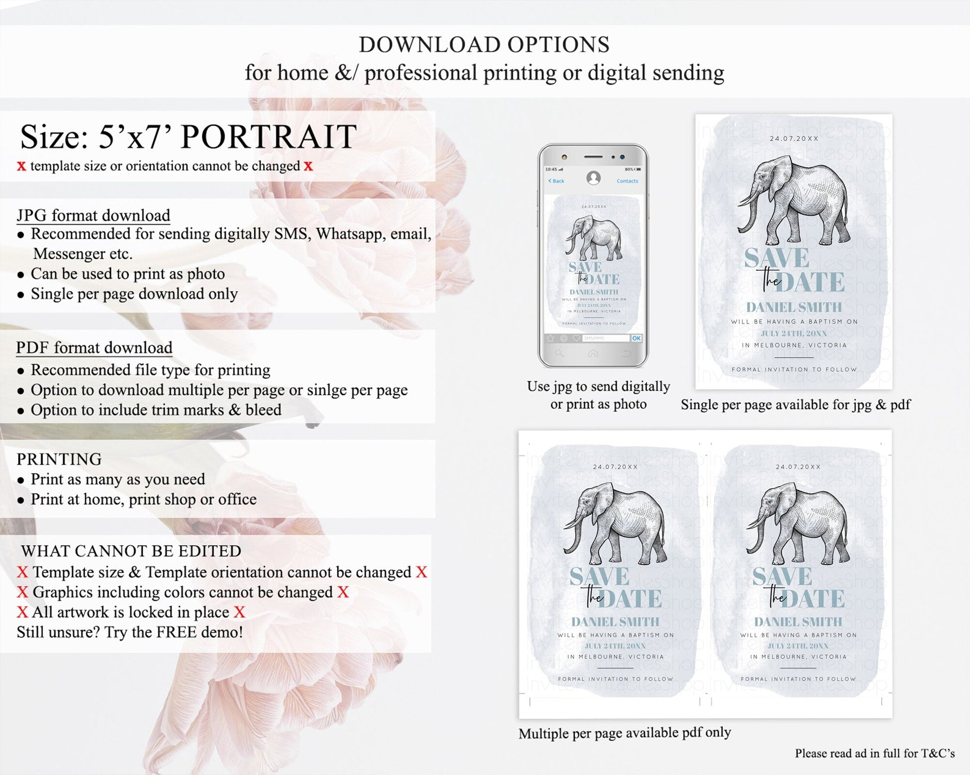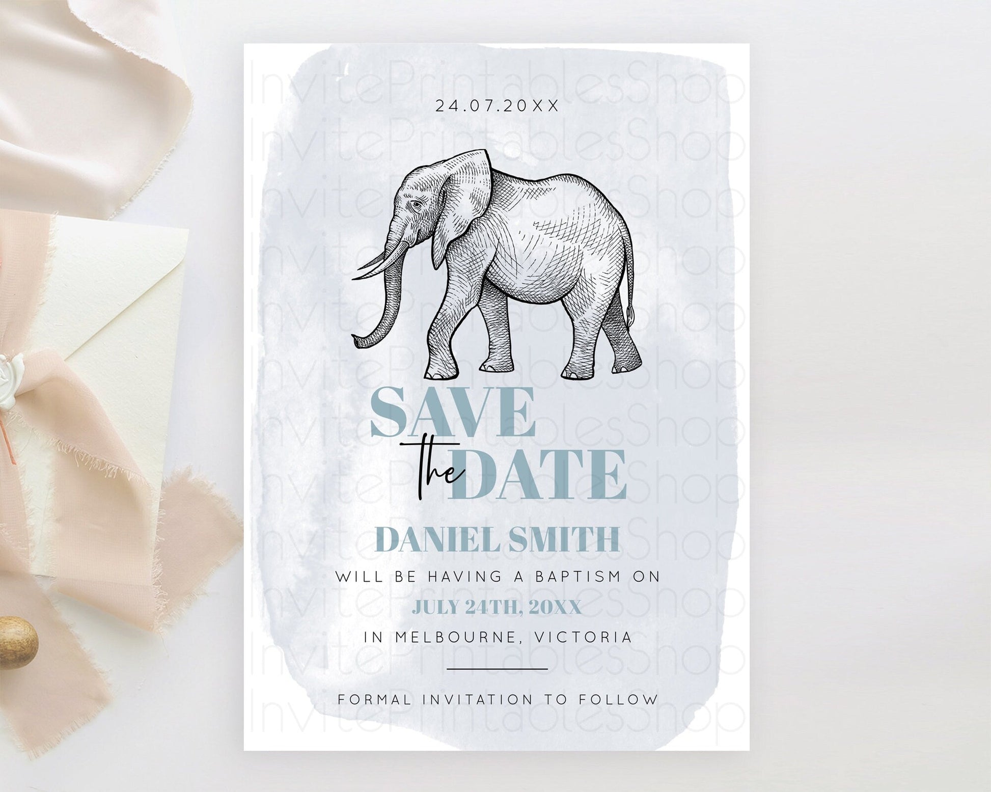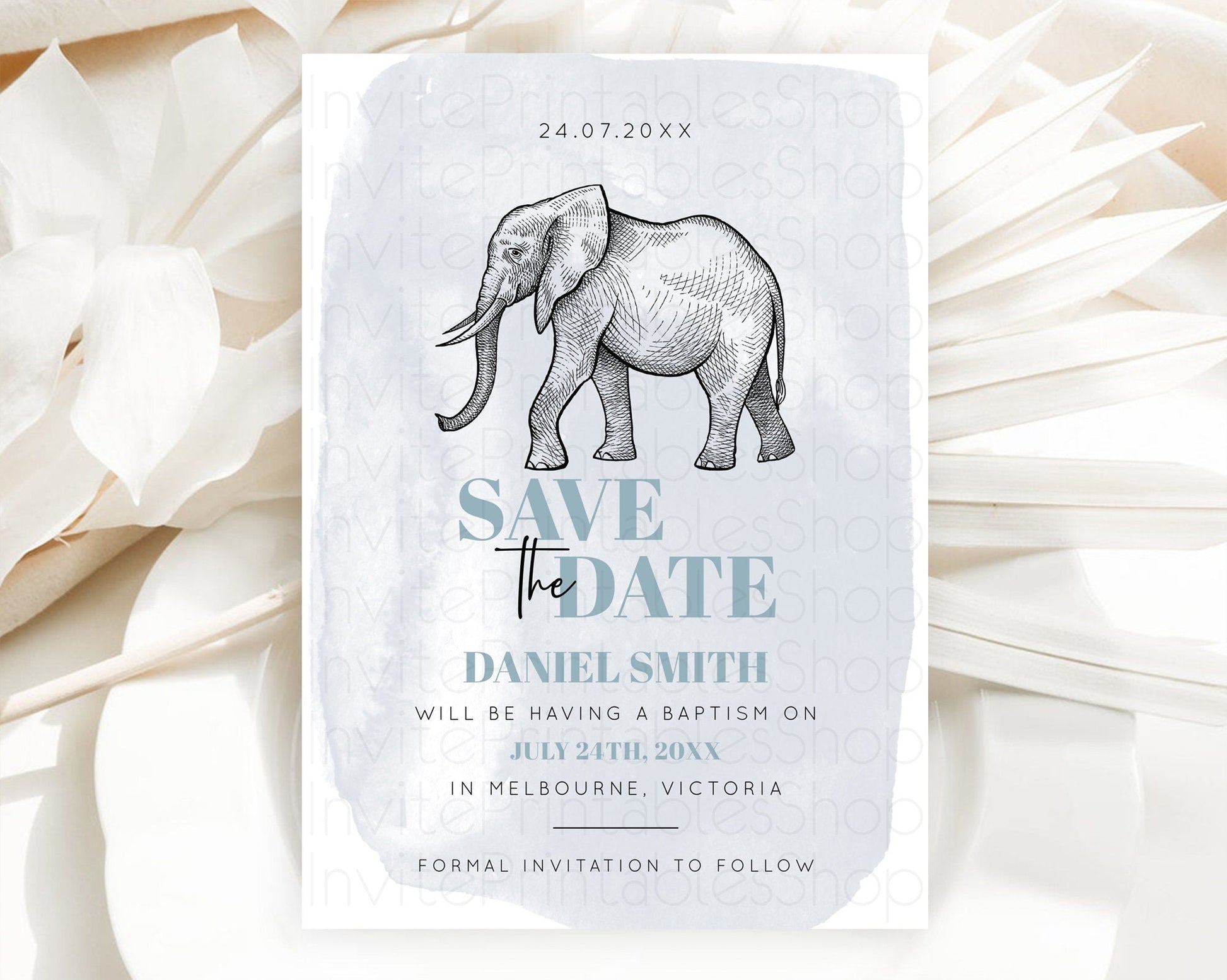 Elephant Save The Date Template Elephant Safari Adventure Party Dried Palm Fern Zoo 1st Birthday Baptism Baby Shower Bridal Shower D10811
