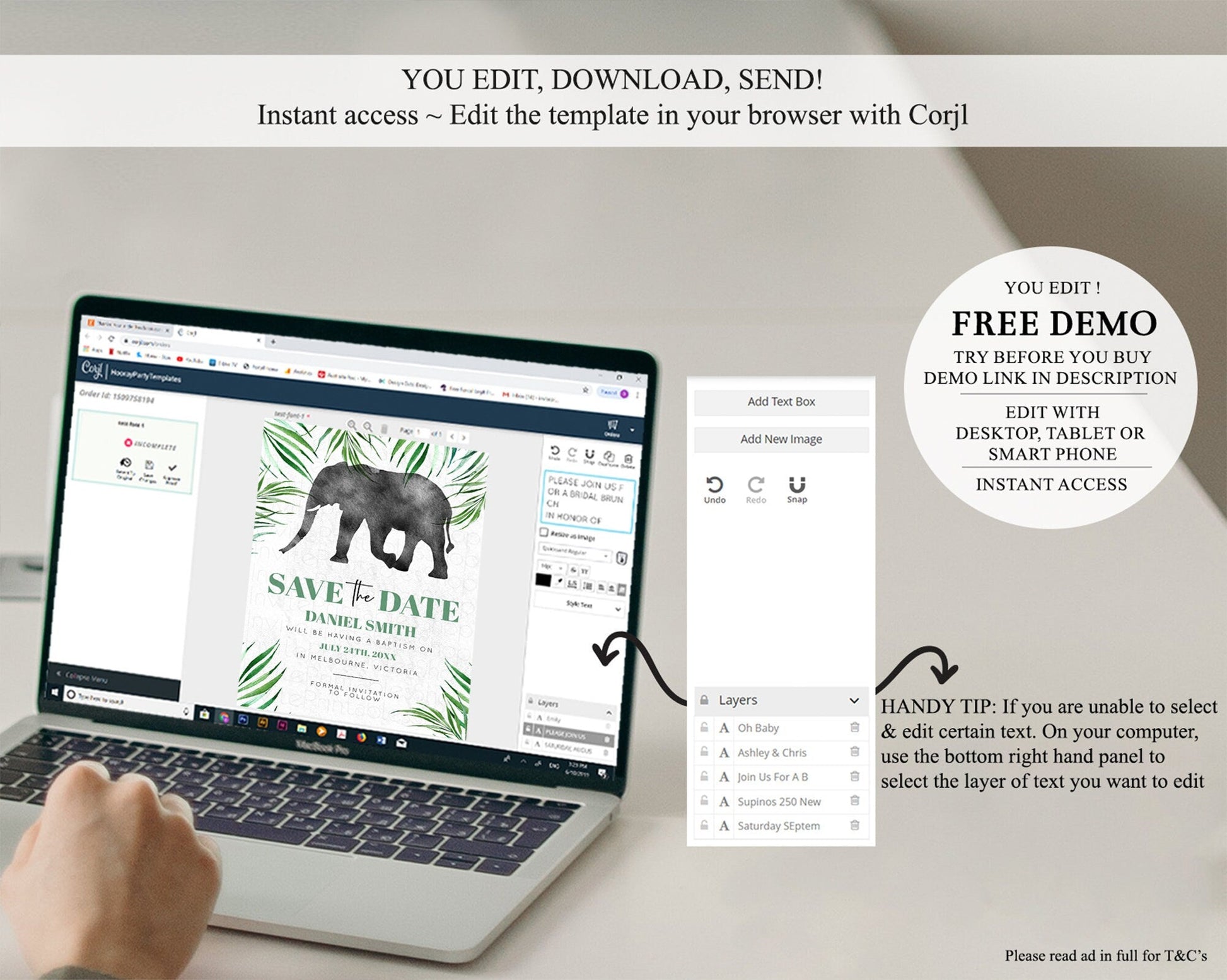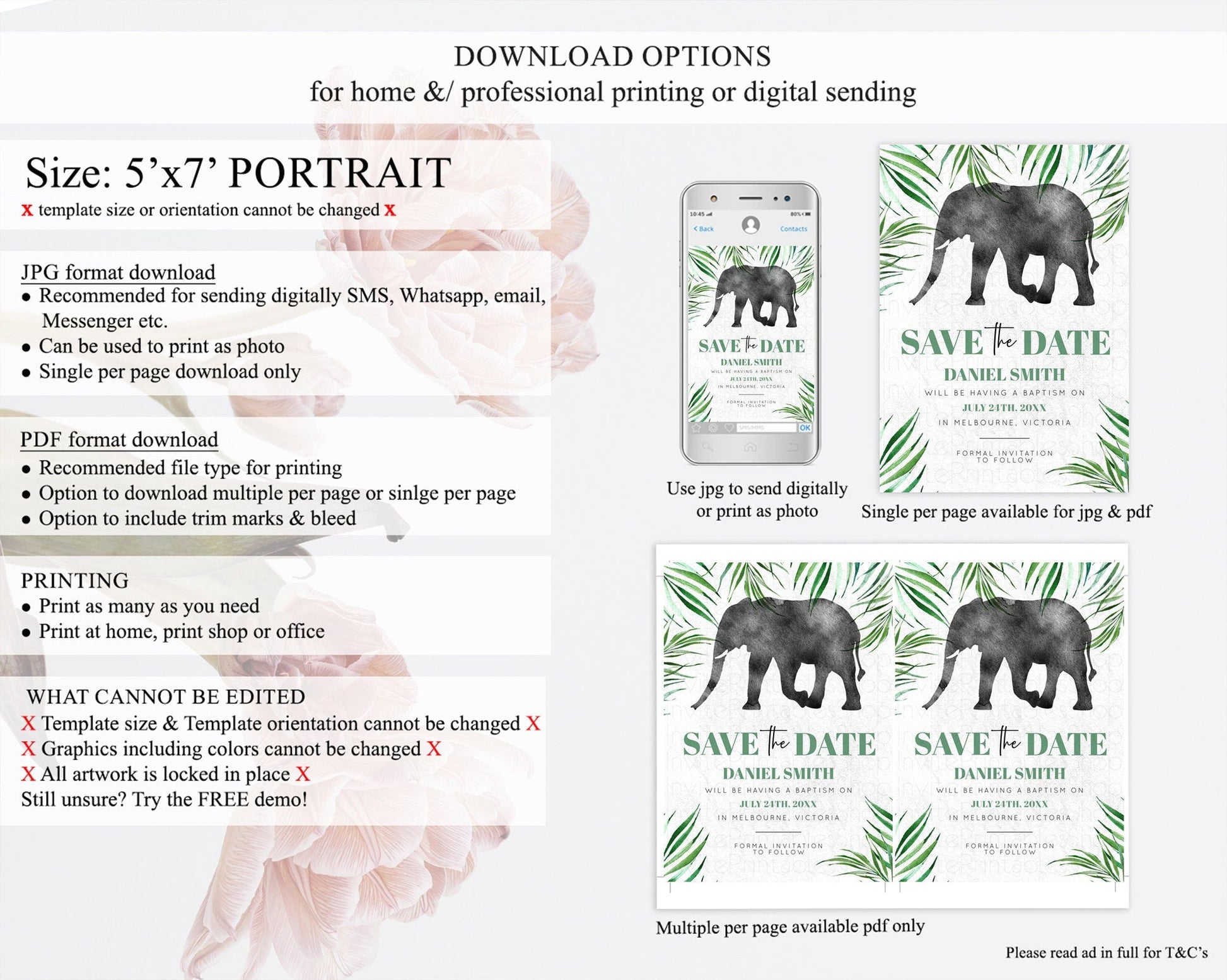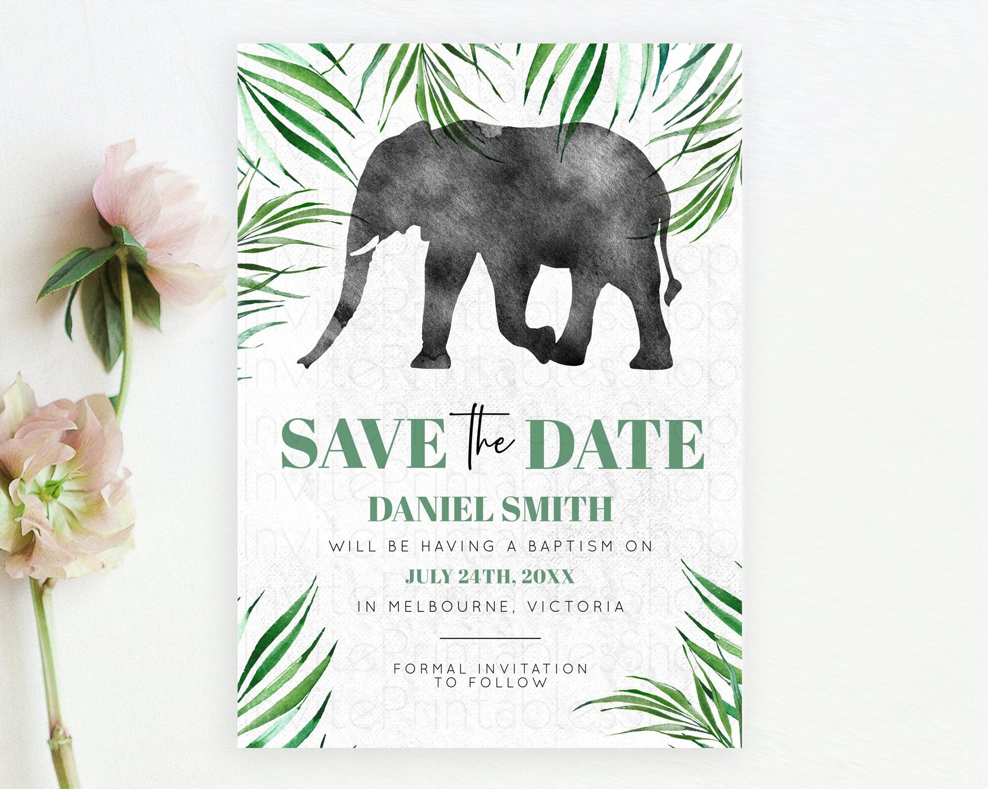 Elephant Save The Date Template Elephant Safari Adventure Party Dried Palm Fern Zoo 1st Birthday Baptism Baby Shower Bridal Shower D10842