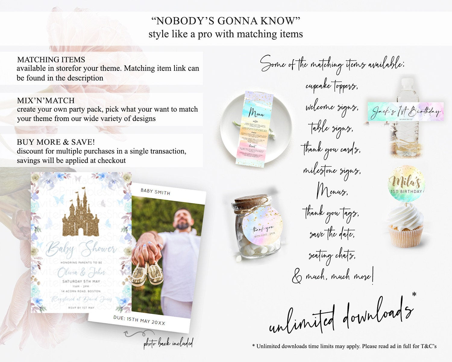 Enchanted Castle Baby Shower Invitation, Whimsical, Secret Garden Theme, Blue Grey Flowers, Soft Floral, Glitter Castle, Butterflies D10932