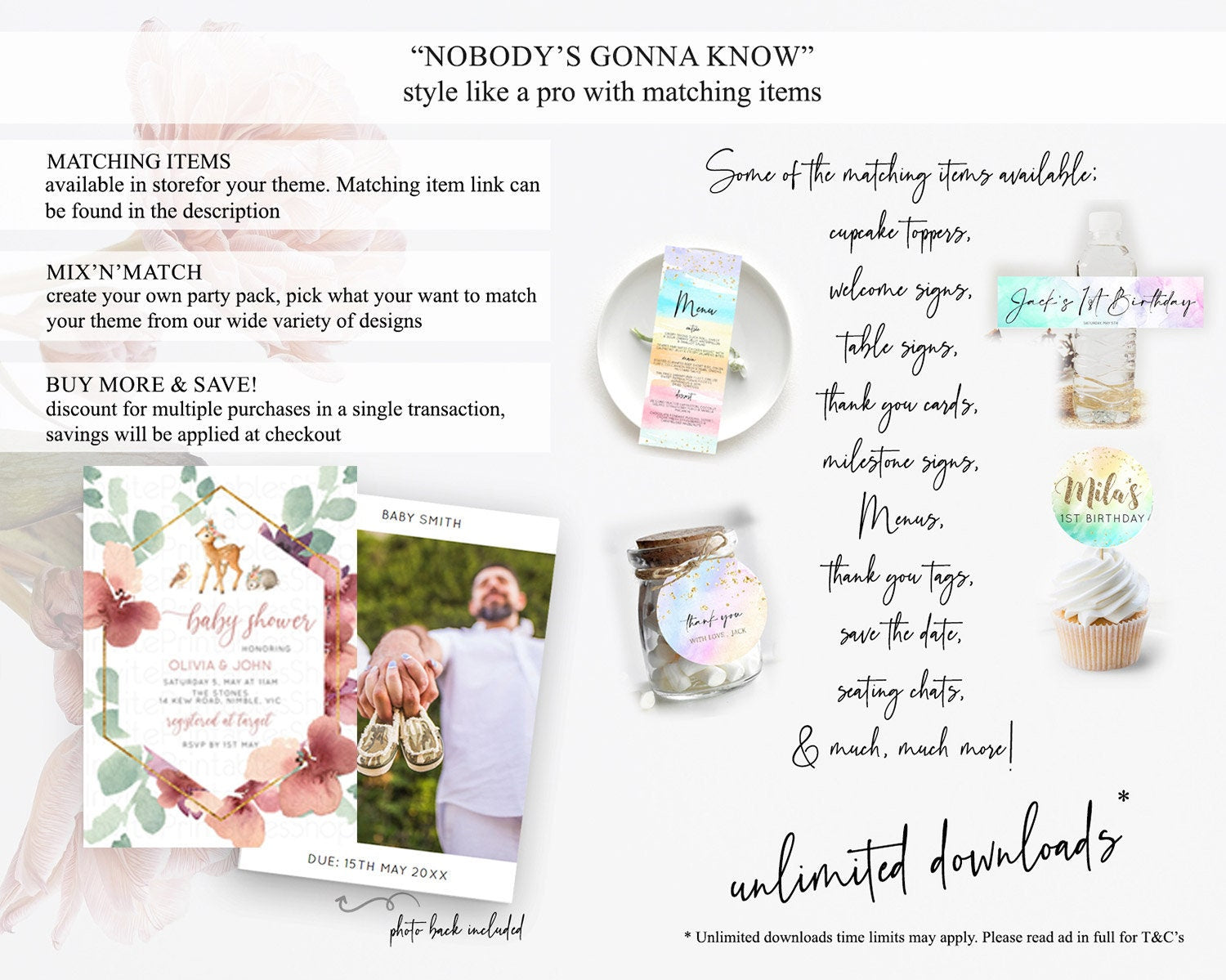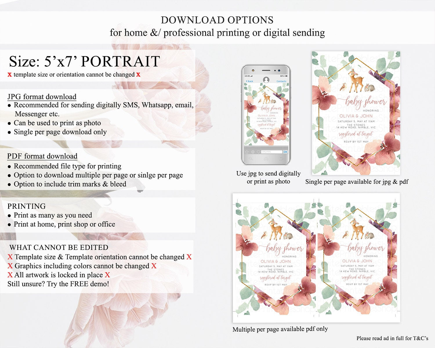 Enchanted Forest Baby Shower Invitation Burgundy Pastel Flowers Fawn, Deer, Butterfly Bunny Perfect for a Whimsical Fall Celebration D10913