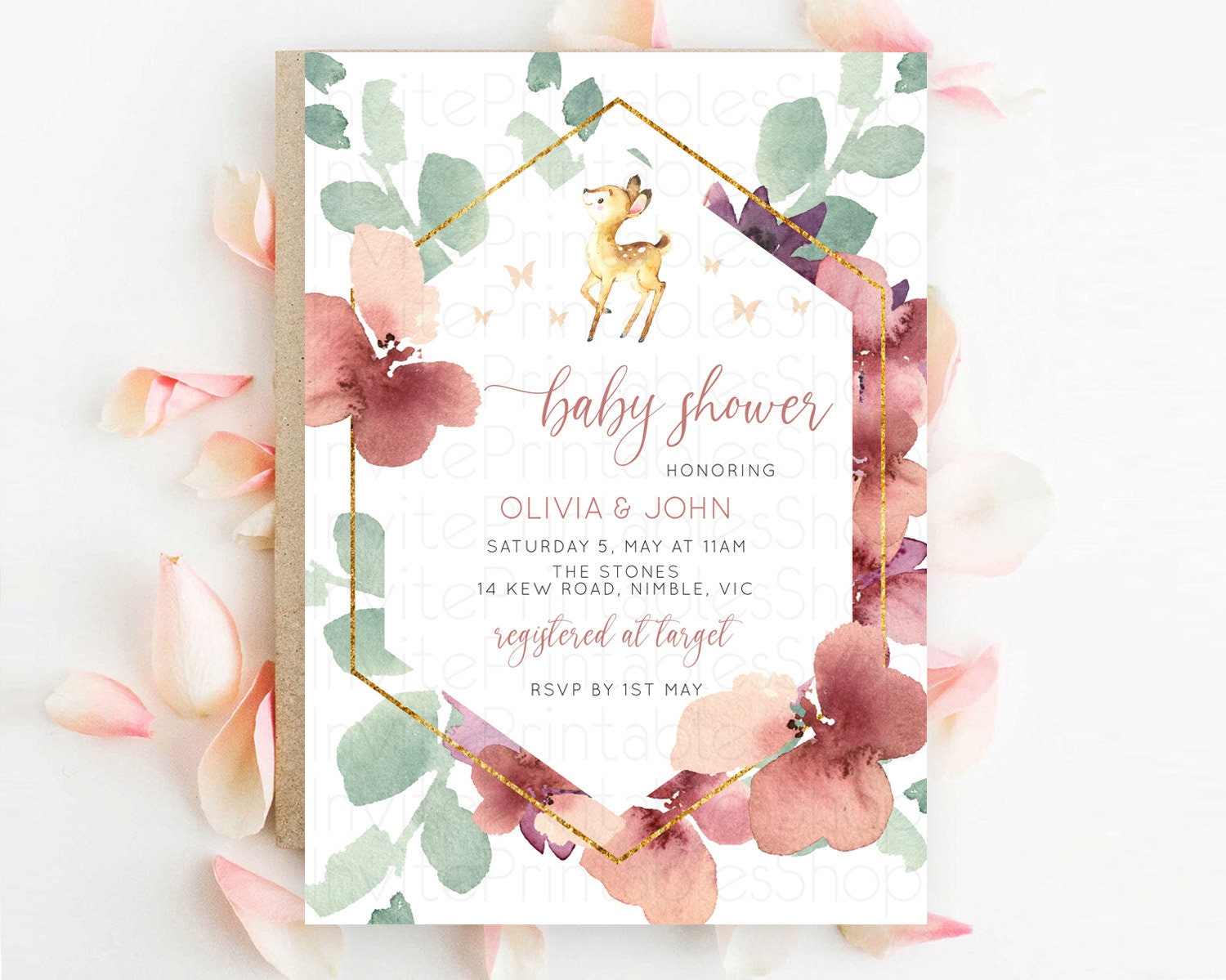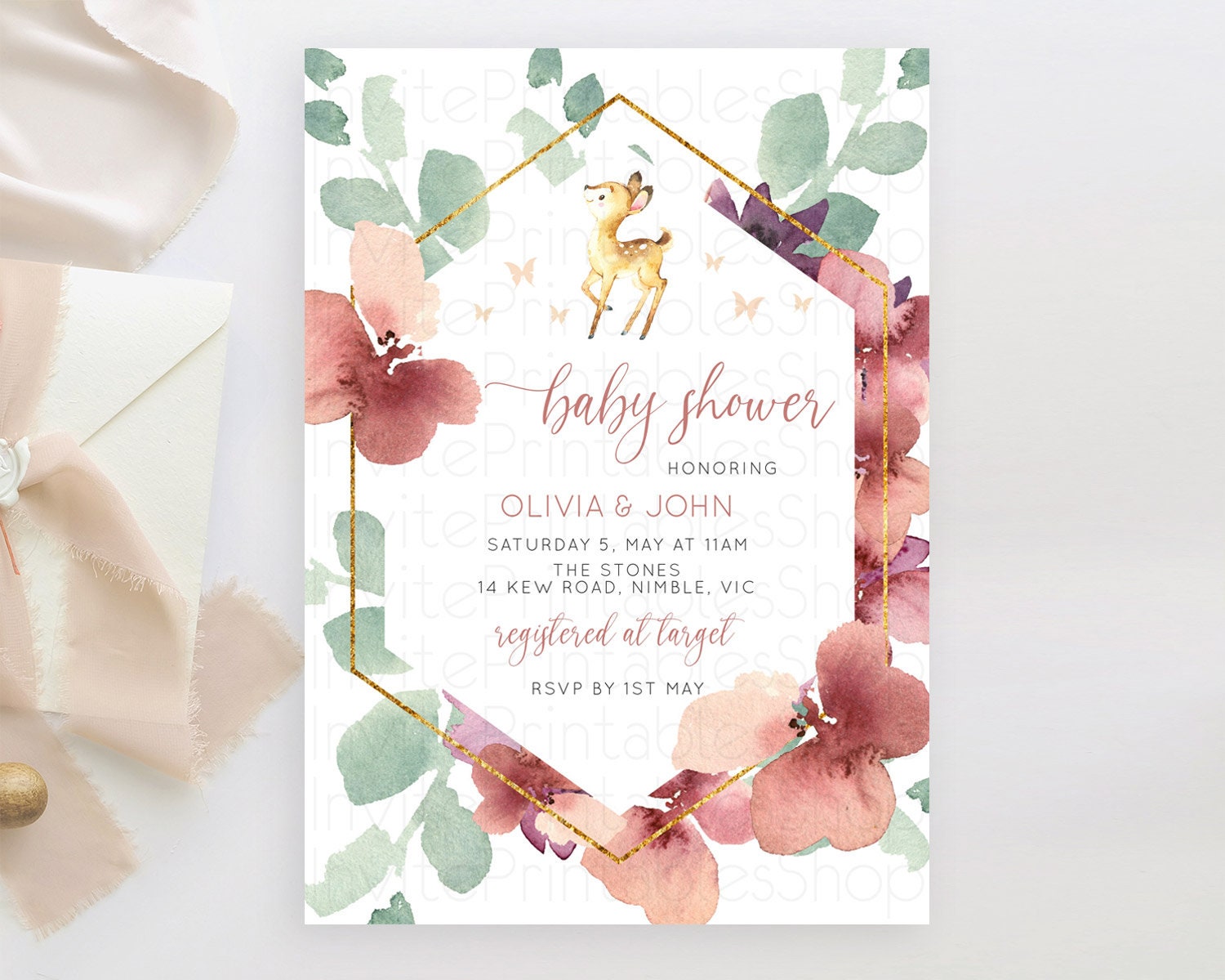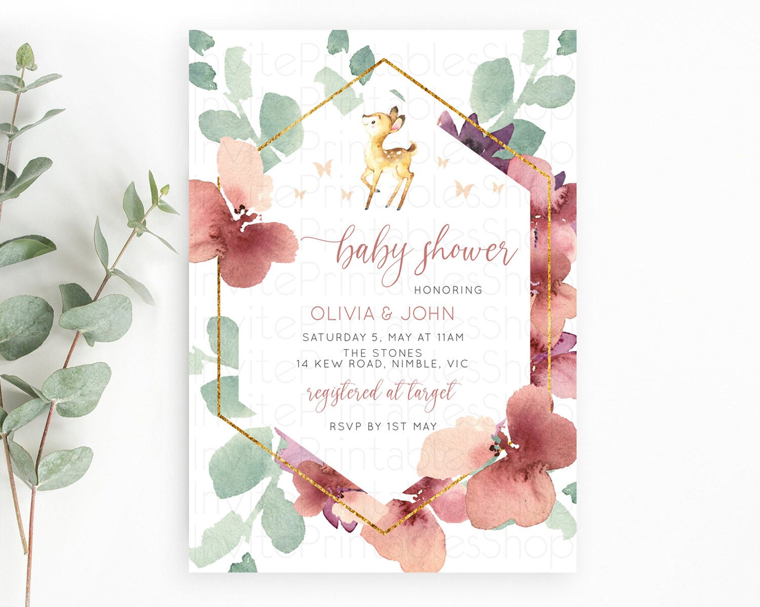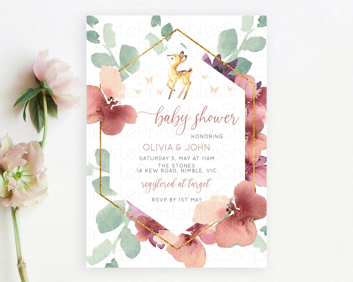 Enchanted Forest Baby Shower Invitation: Burgundy Pastel Flowers, Fawn, Deer, Butterfly, Floral Ideal for Whimsical Fall Celebration D10915