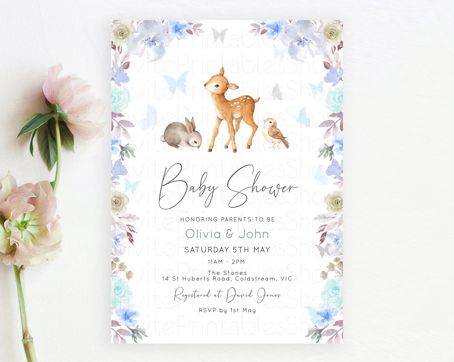 Enchanted Forest Baby Shower Invitation: Fawn, Butterflies, Pastel Blue Grey Flowers, Floral - Woodland Gender Reveal, Secret Garden D10929