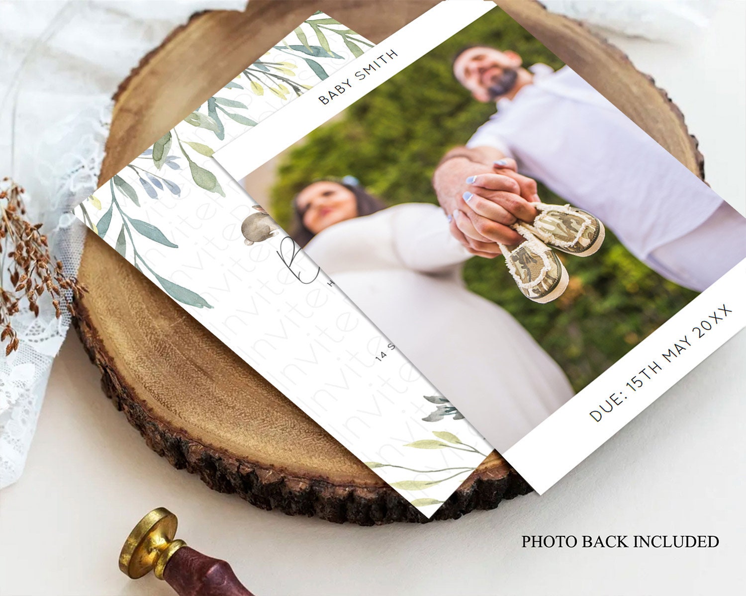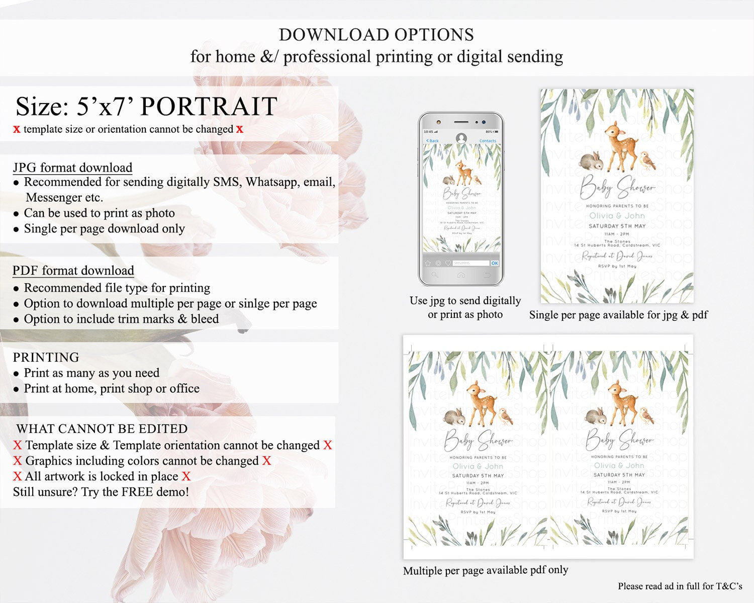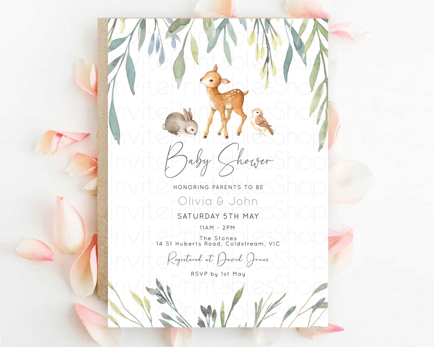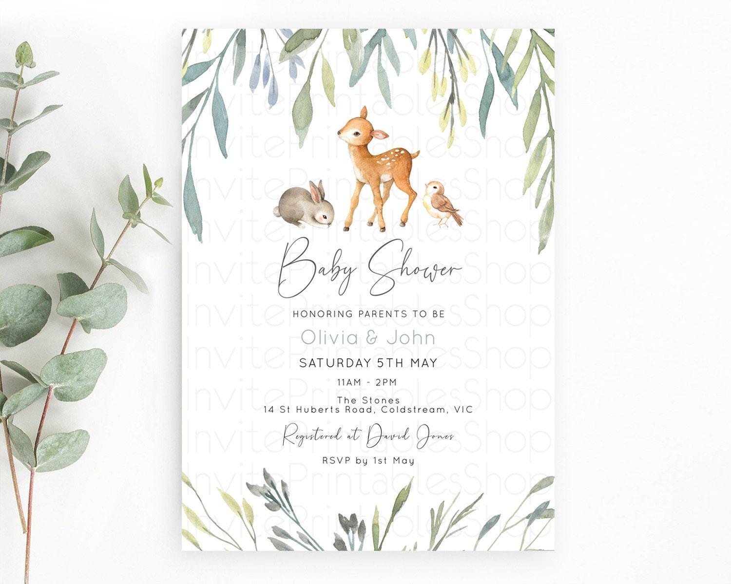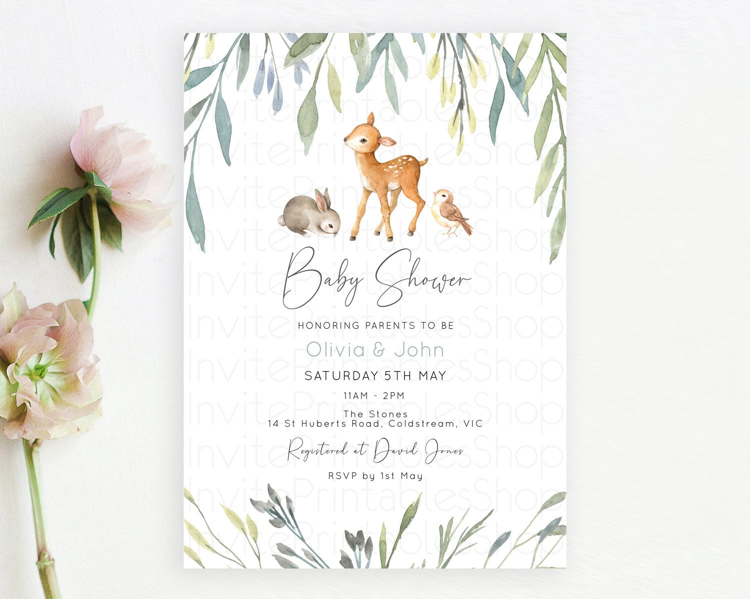 Enchanted Forest Baby Shower Invitation, Fawn, Deer with Soft Color Greenery, Whimsical Rustic Woodland Theme - Organic Pastel Green D10919