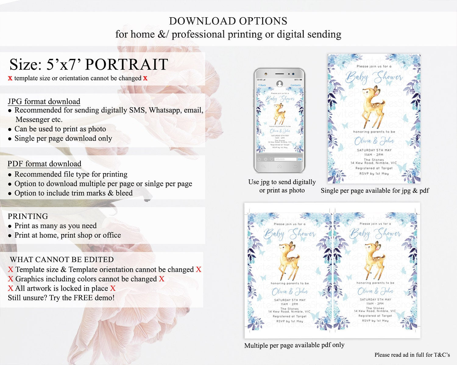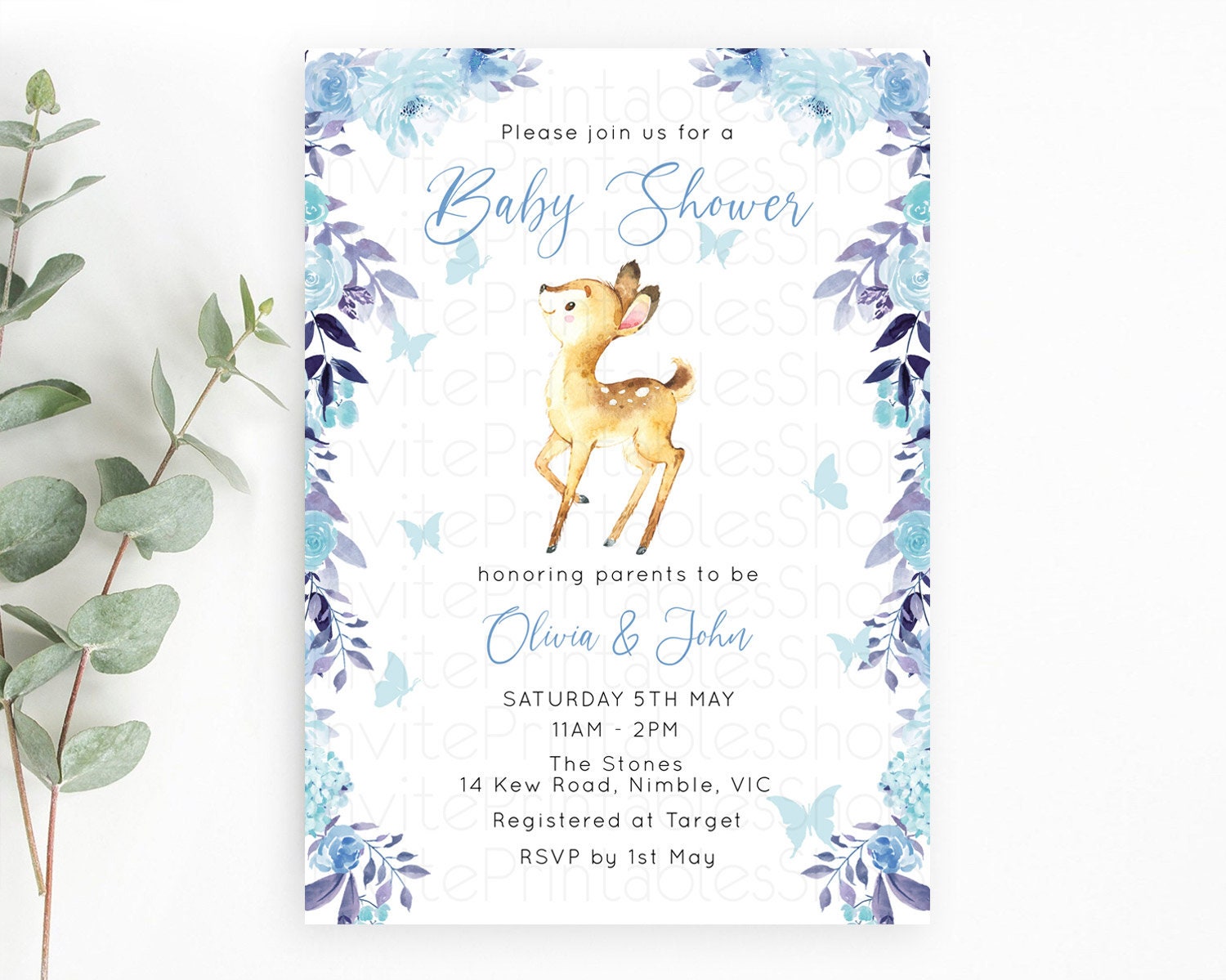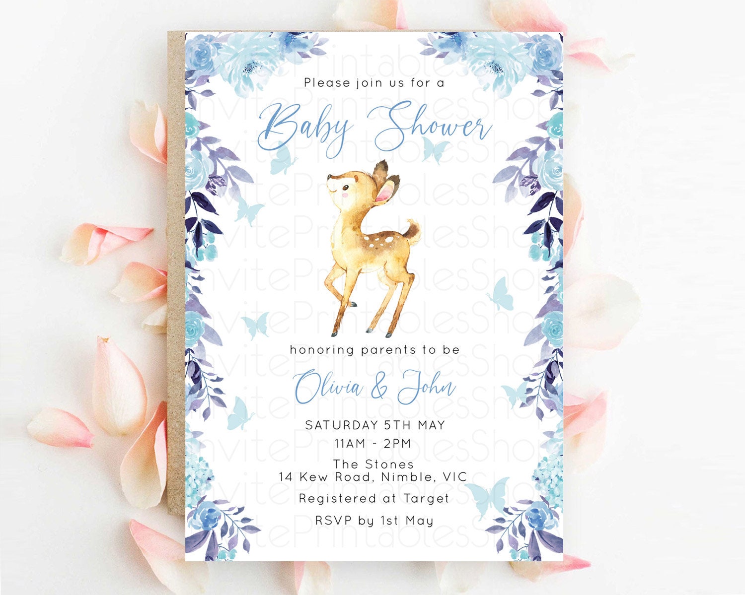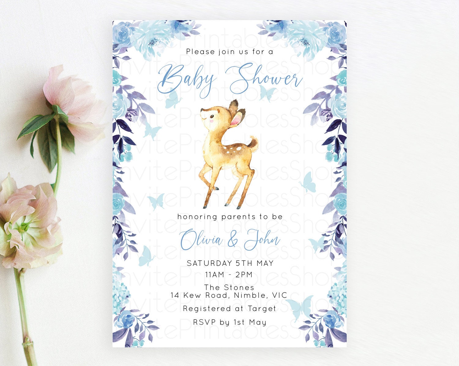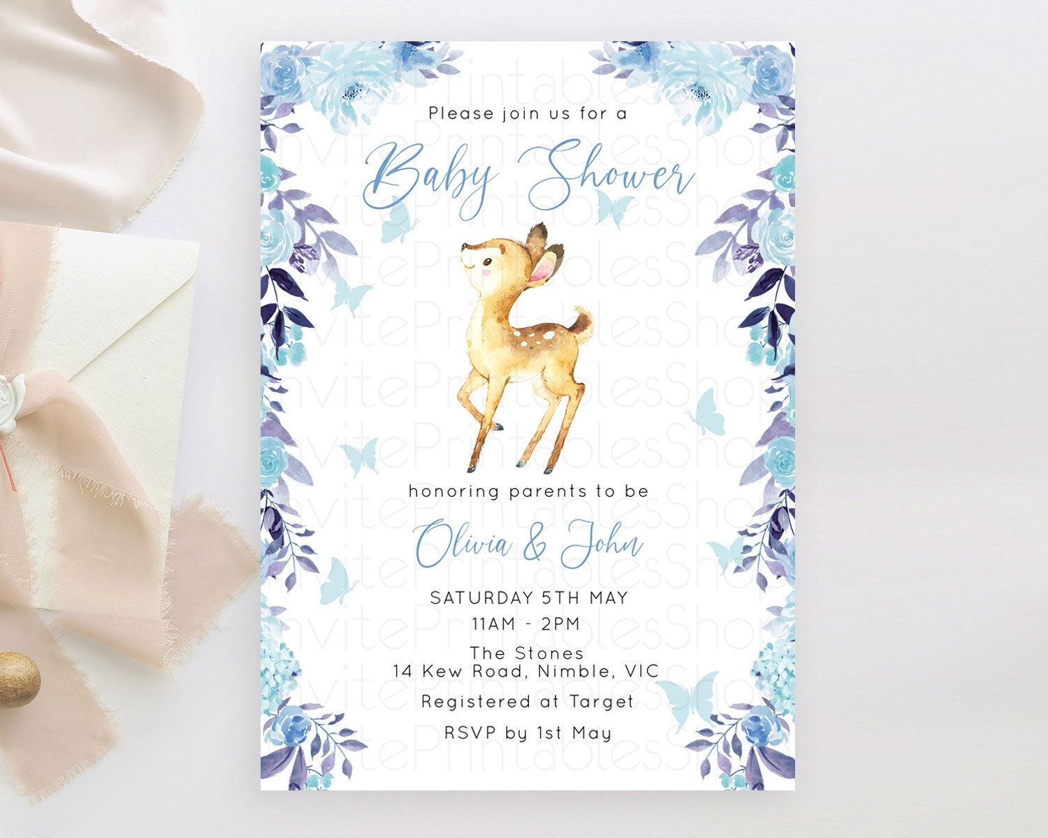 Enchanted Forest Baby Shower Invitation: Secret Garden Fawn, Deer, Butterflies, and Blue Flowers - Whimsical Woodland Theme D10917
