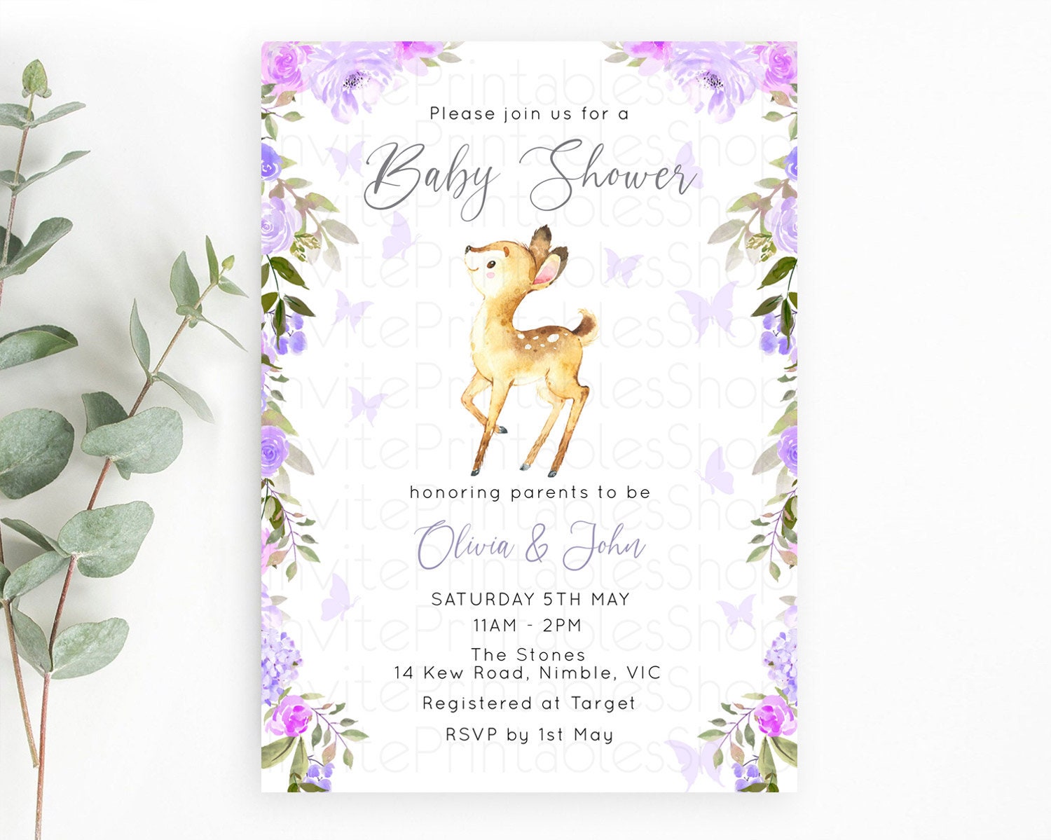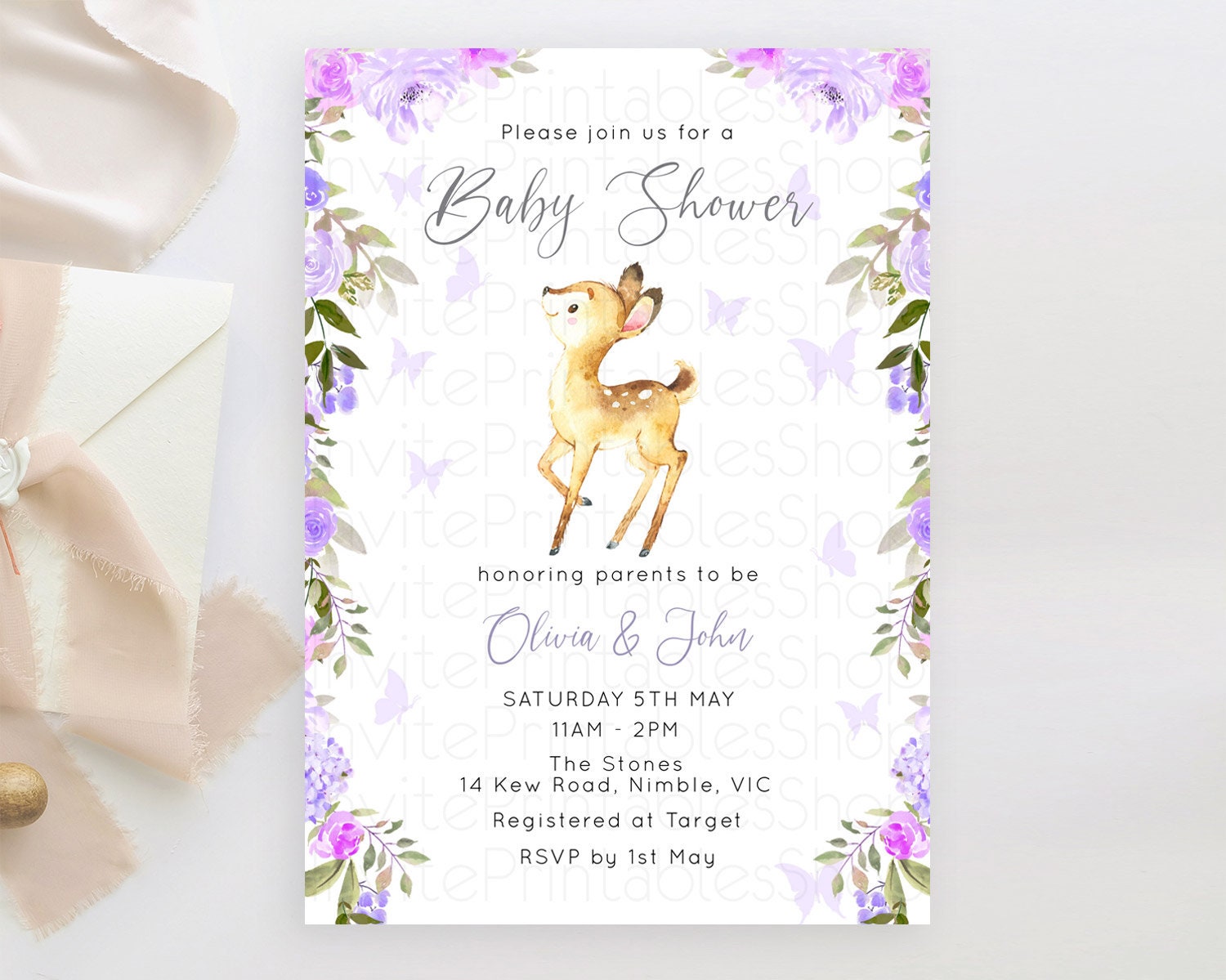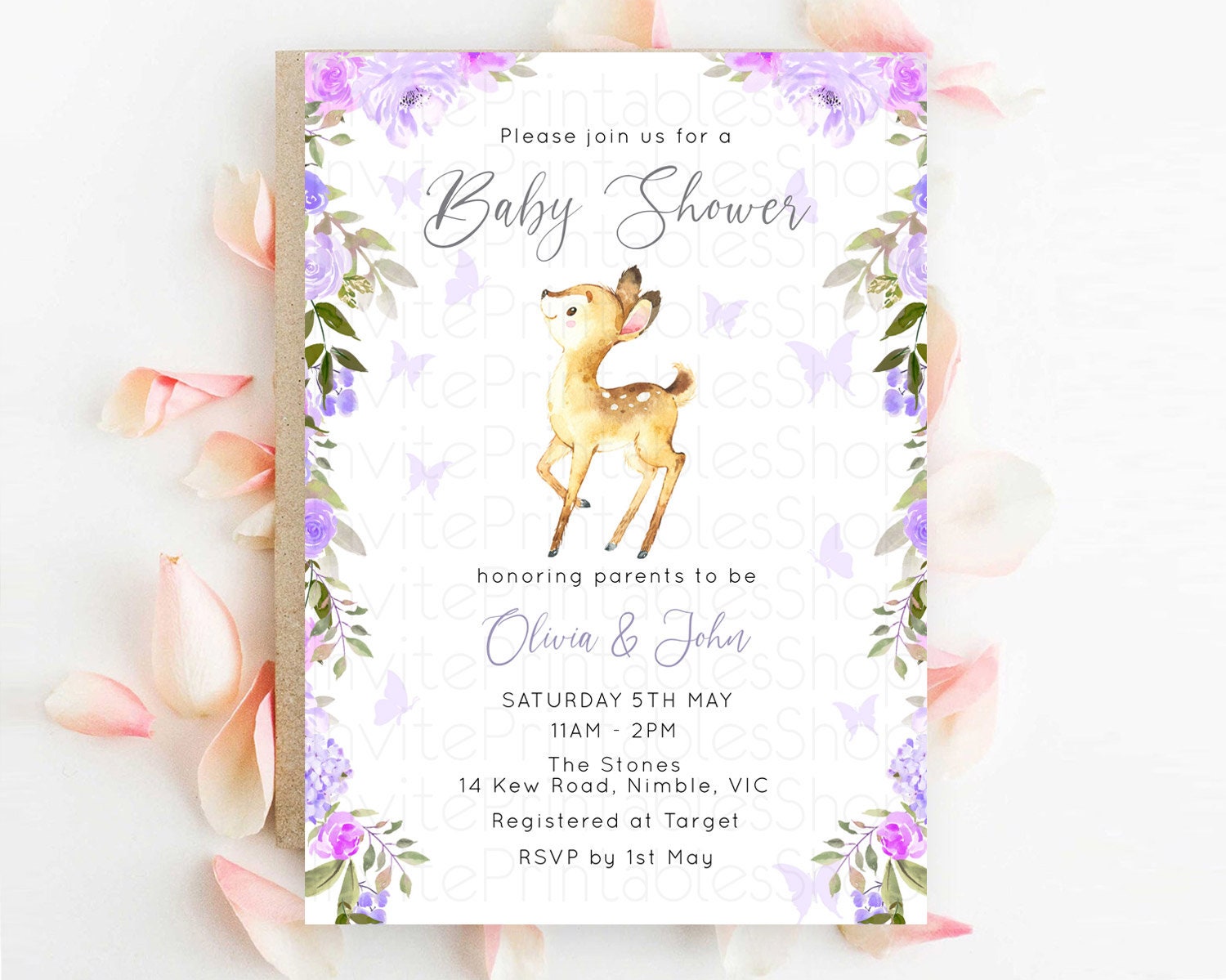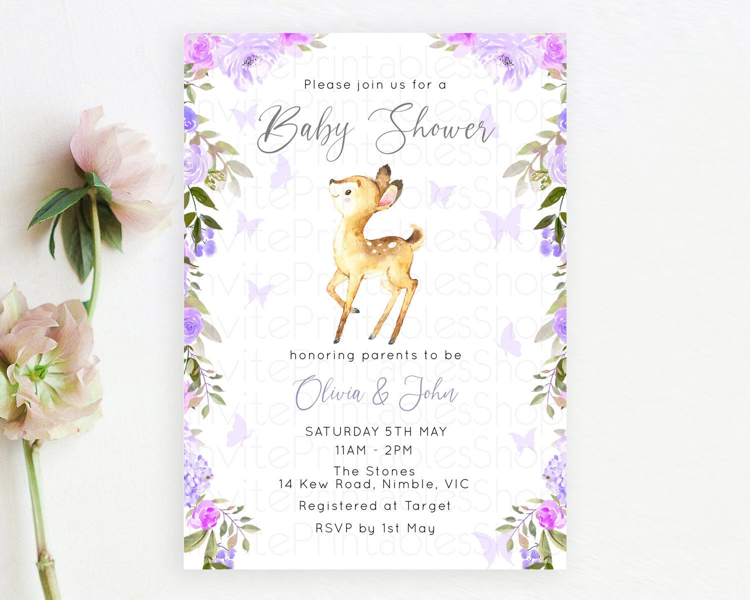Enchanted Forest Baby Shower Invitation: Secret Garden, Fawn, Deer, Butterfly, Soft Purple Pastel Flowers - Whimsical Woodland Theme D10916